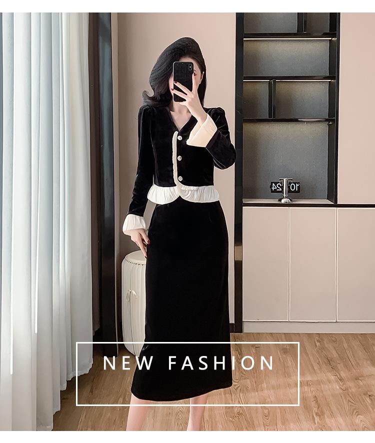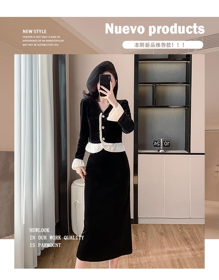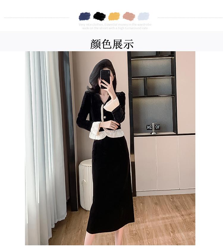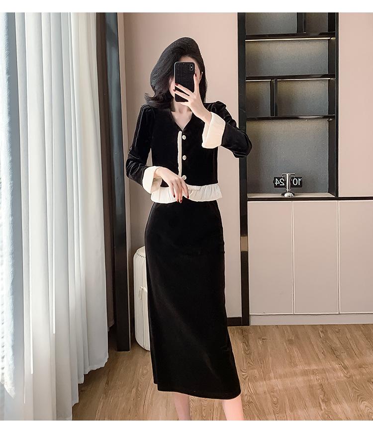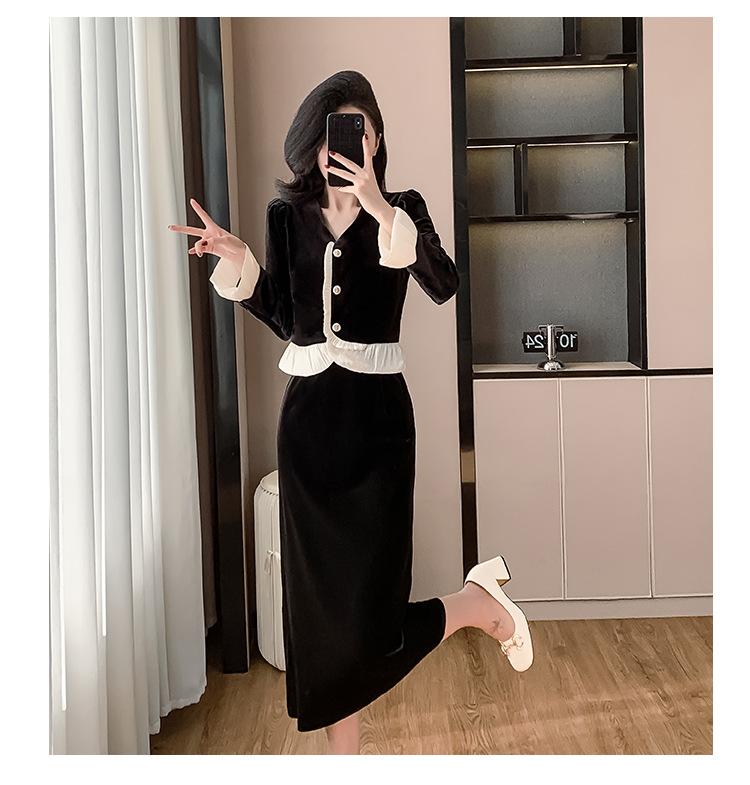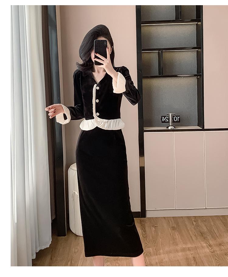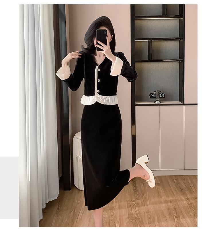 Foto real otoño e invierno 2025 nuevo temperamento de socialité con volantes cuello en V francés estilo pequeño fragante falda larga de terciopelo de dos piezas