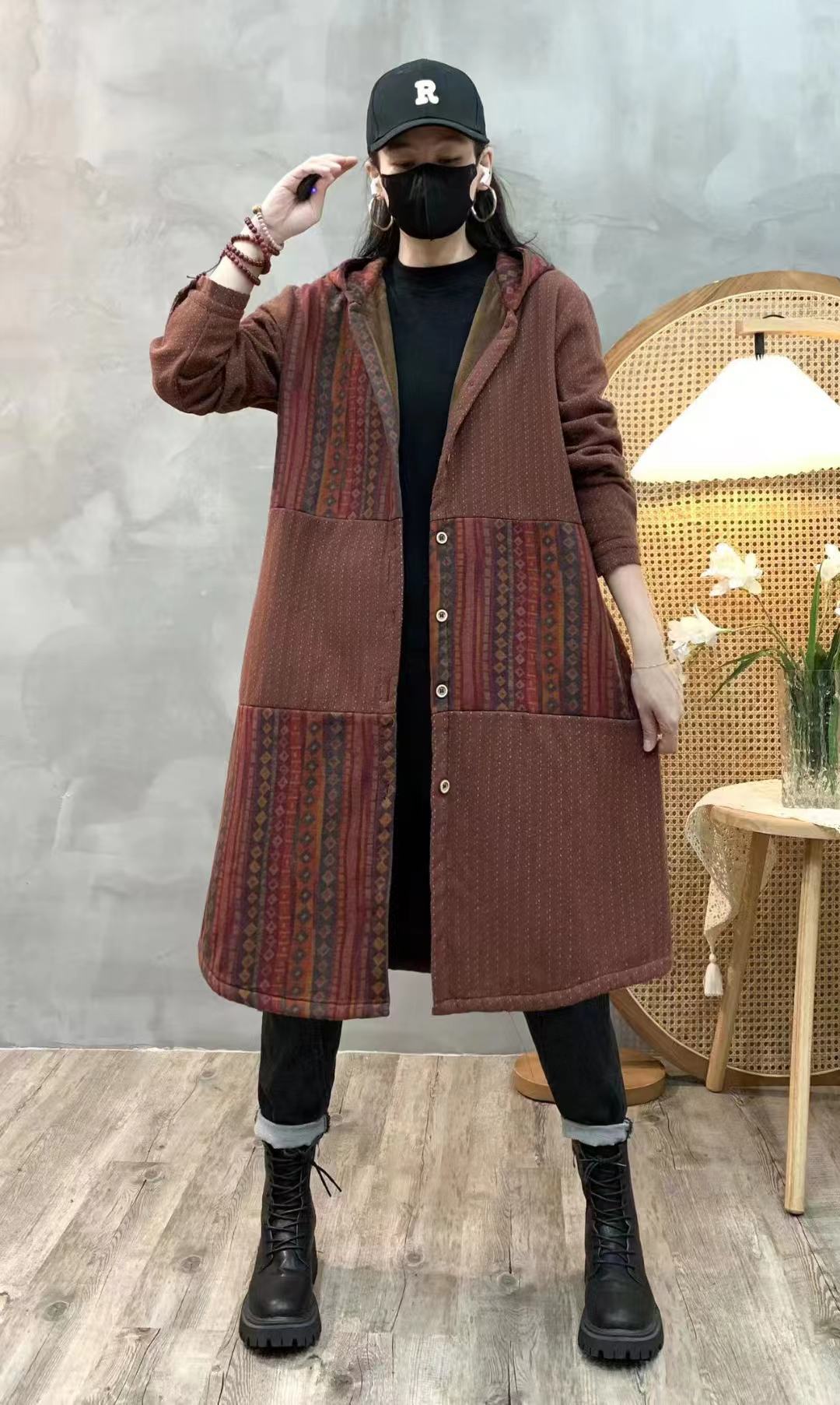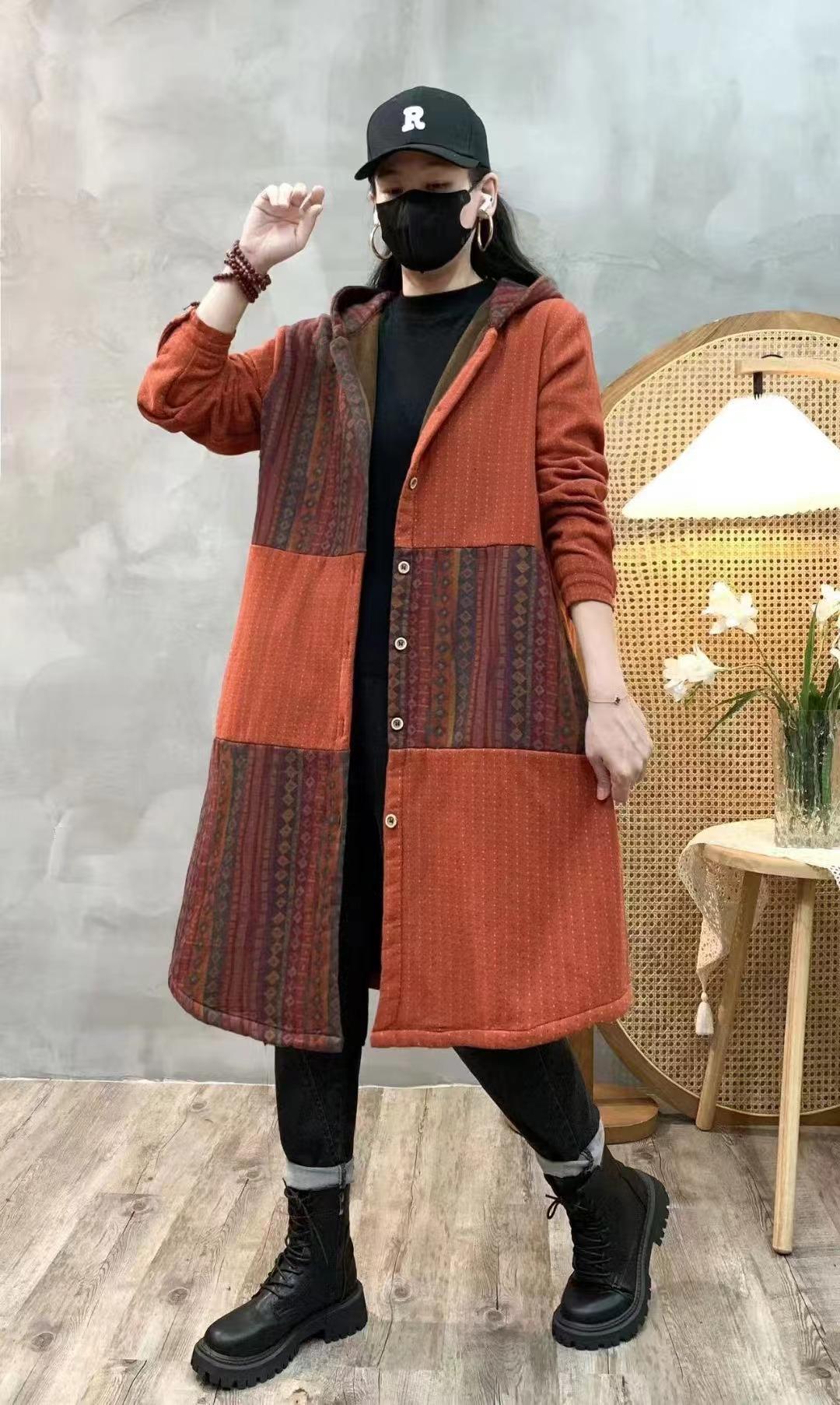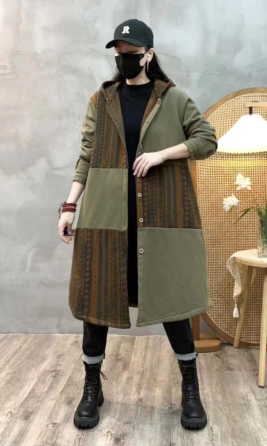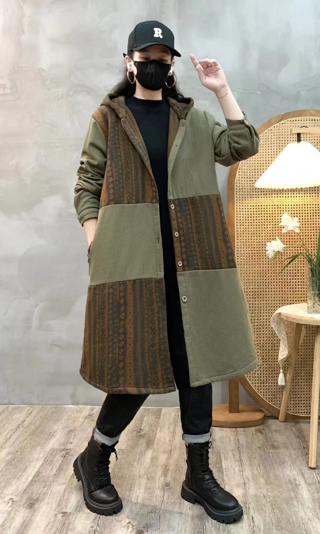 Abrigo de invierno vintage con capucha y botonadura sencilla, forrado con vellón, estilo artístico informal de longitud media para mujer