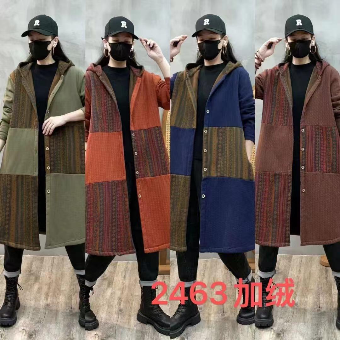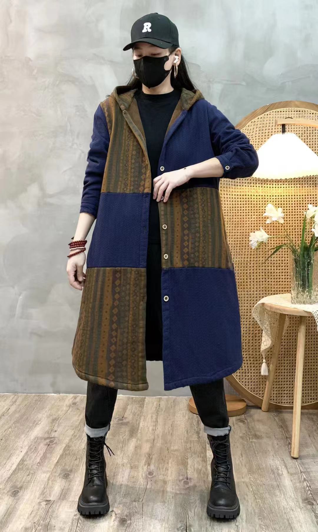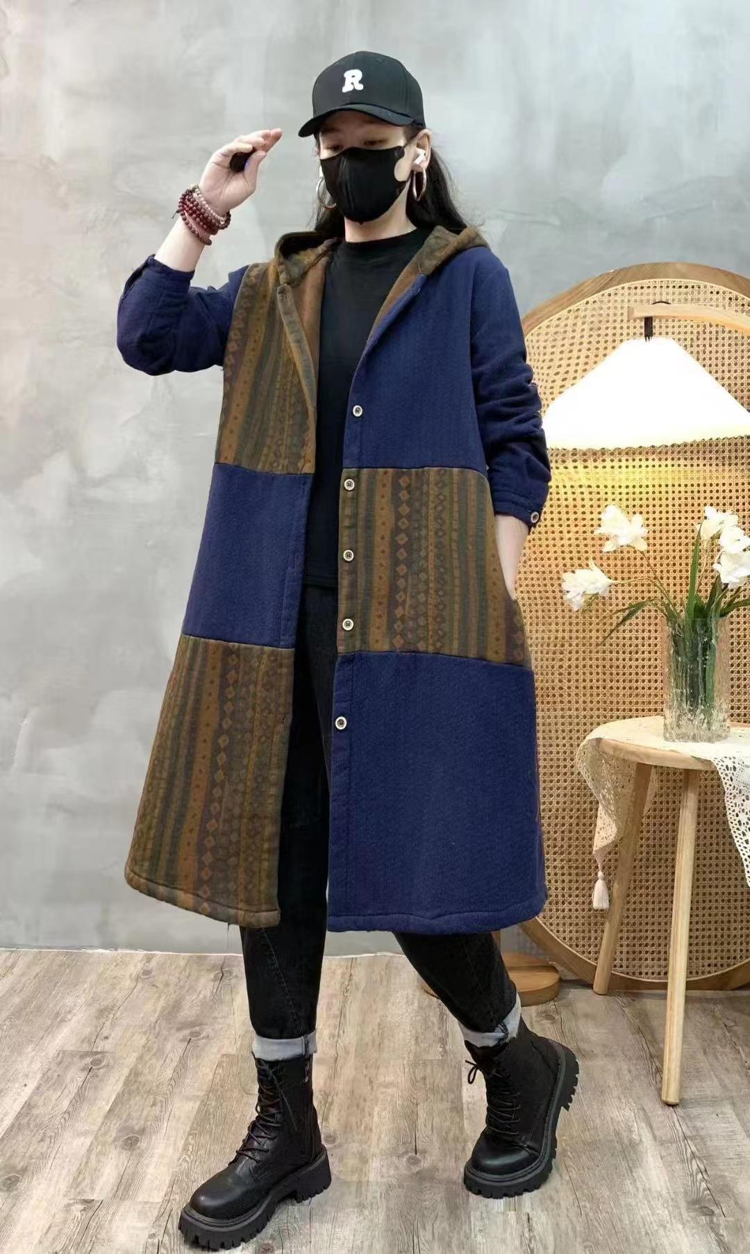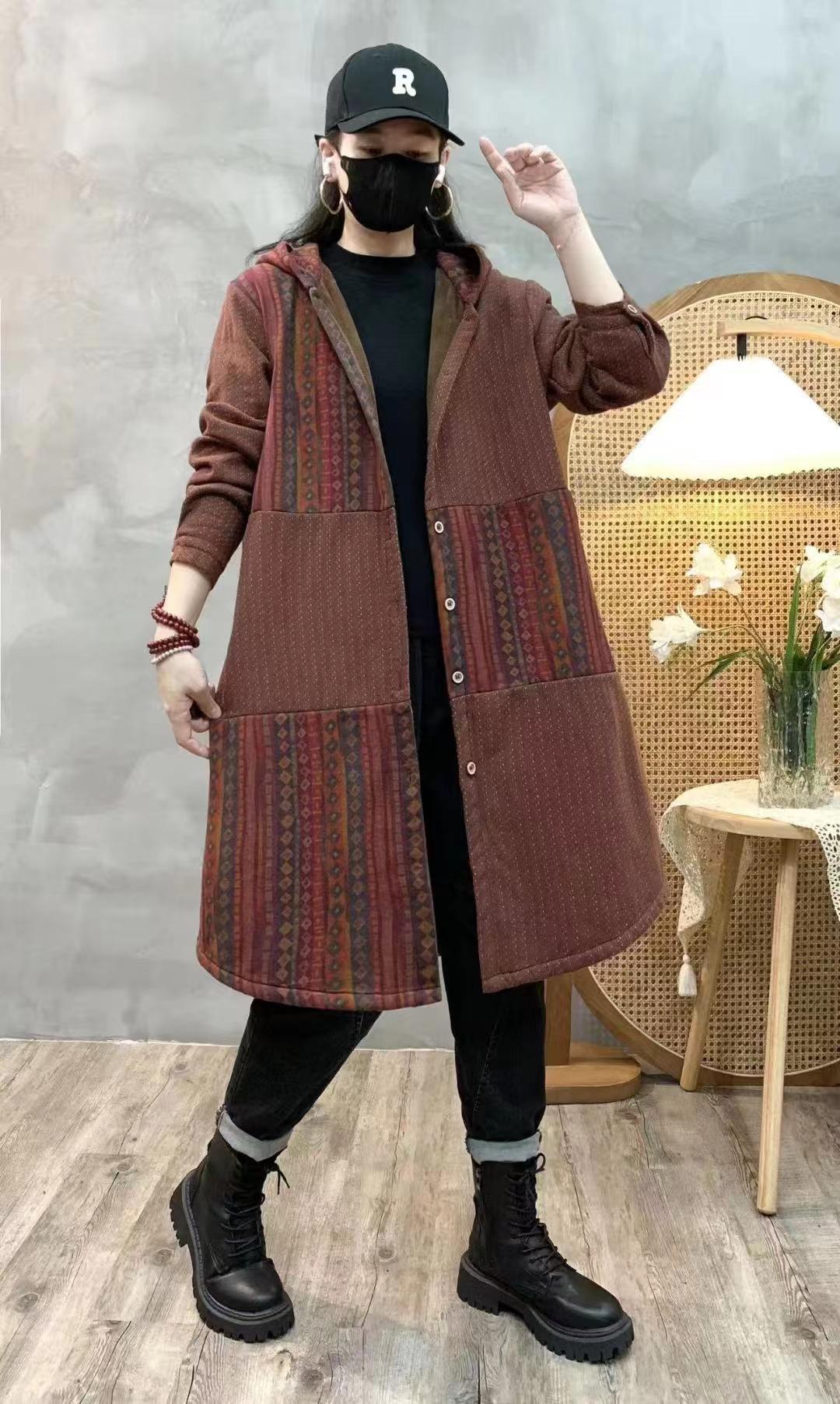 Abrigo de invierno vintage con capucha y botonadura sencilla, forrado con vellón, estilo artístico informal de longitud media para mujer