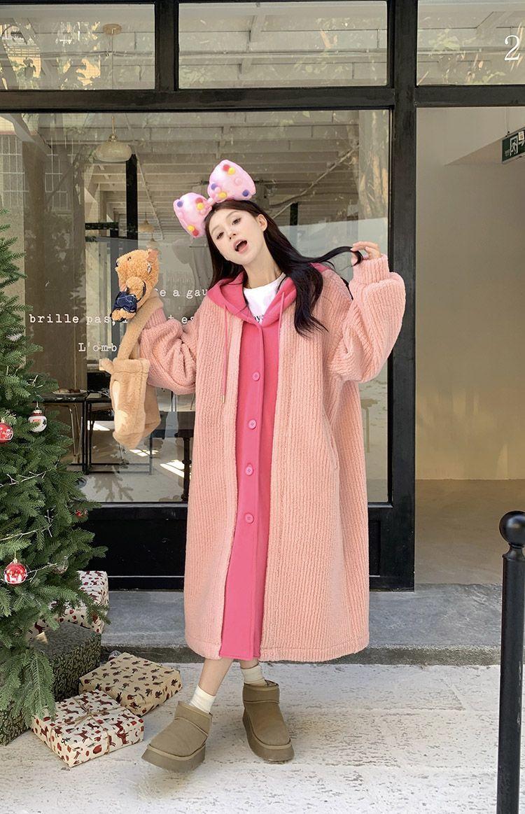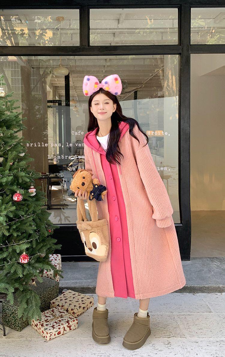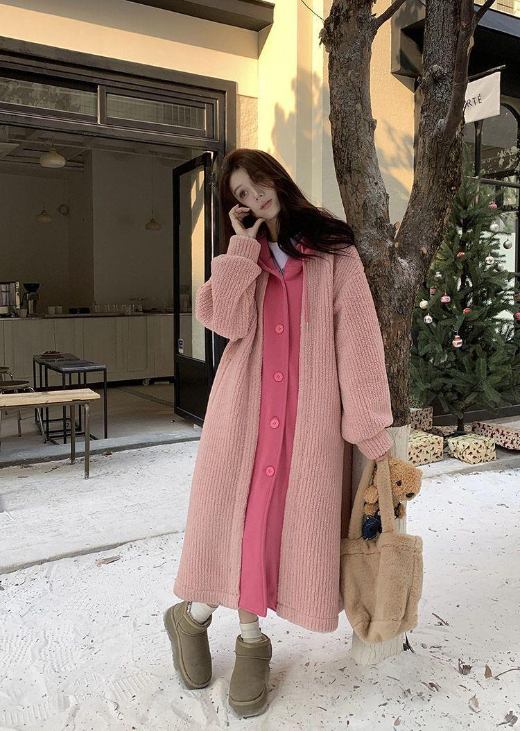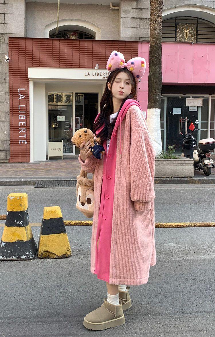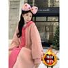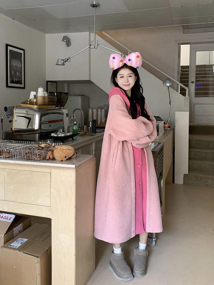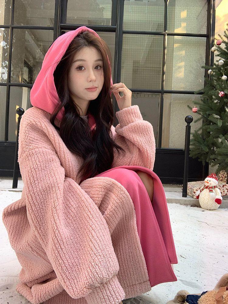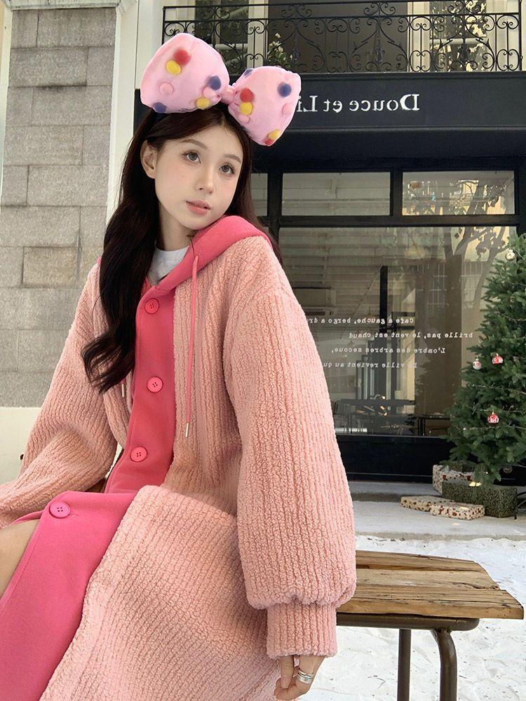 Abrigo Rosa de Dos Piezas Falso con Capucha y Costuras Invierno Estilo Coreano 2025 Nuevo Diseño Sensación Forrado de Polar Abrigo Grueso