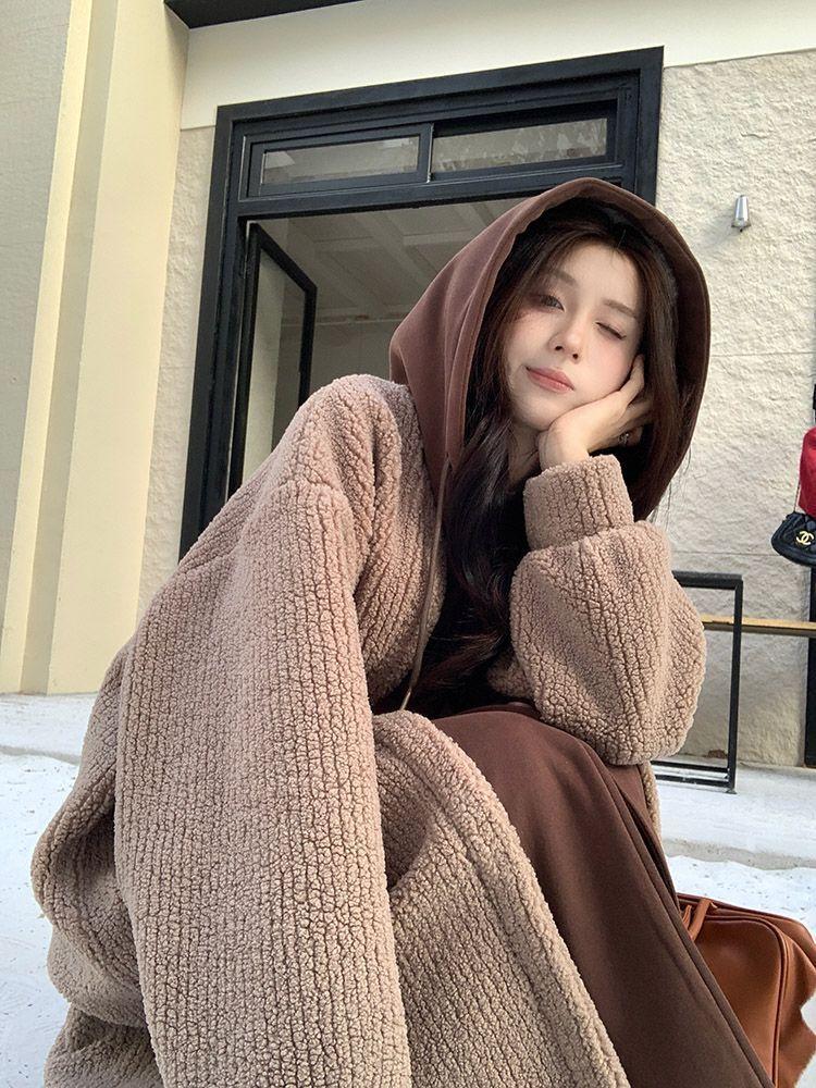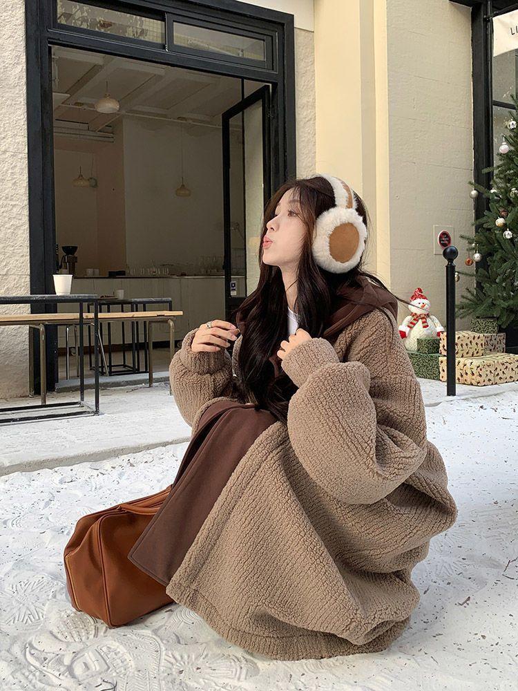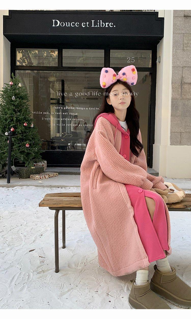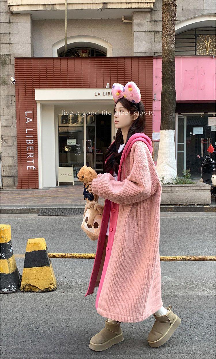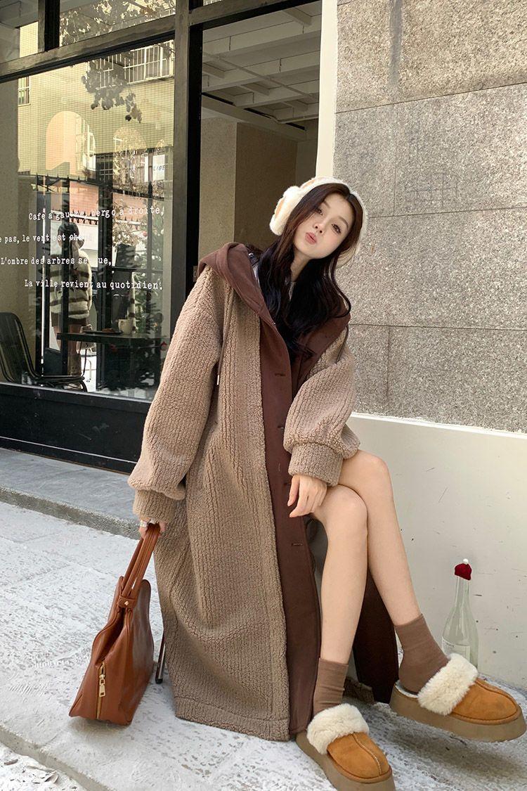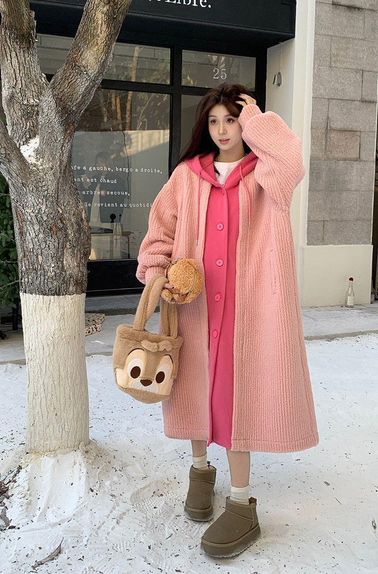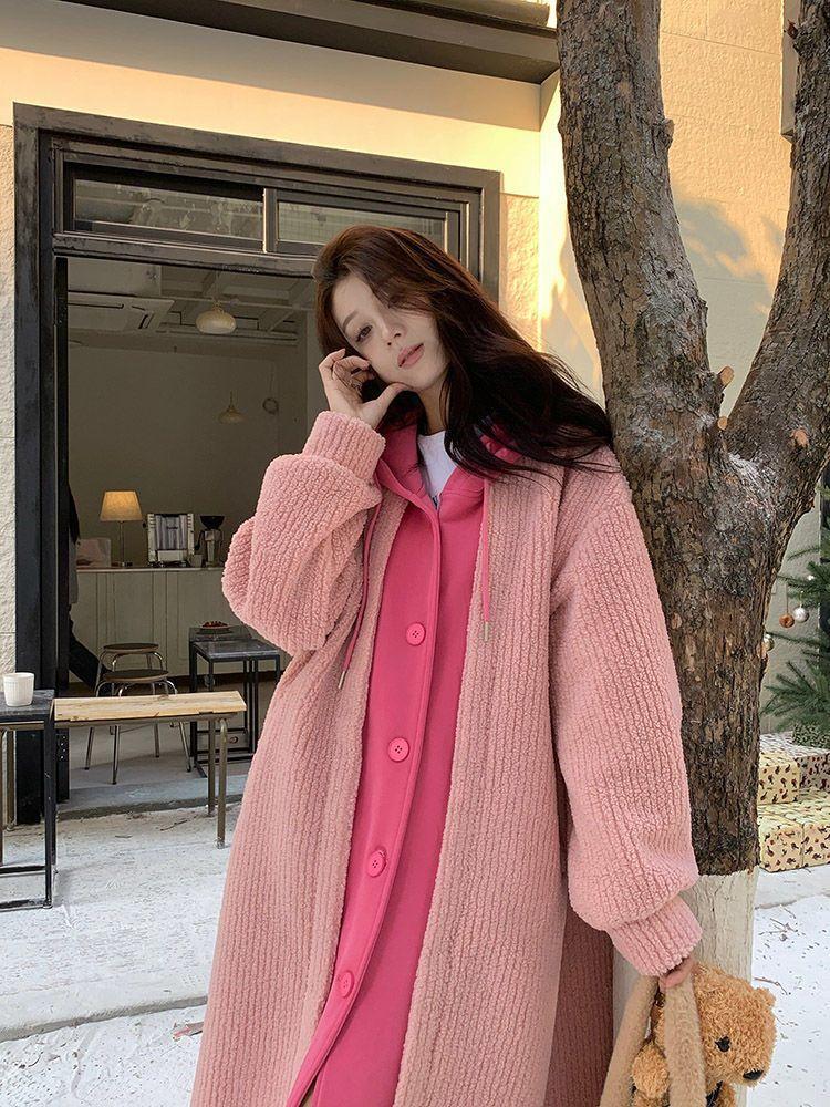 Abrigo Rosa de Dos Piezas Falso con Capucha y Costuras Invierno Estilo Coreano 2025 Nuevo Diseño Sensación Forrado de Polar Abrigo Grueso