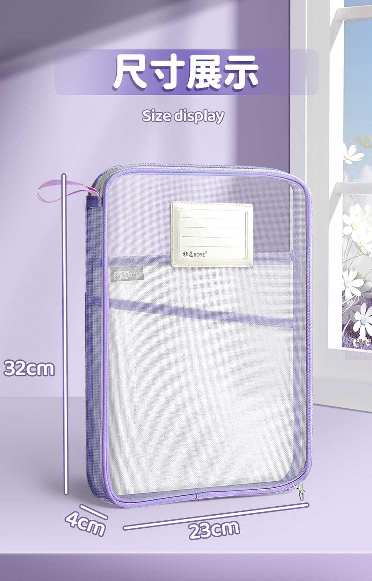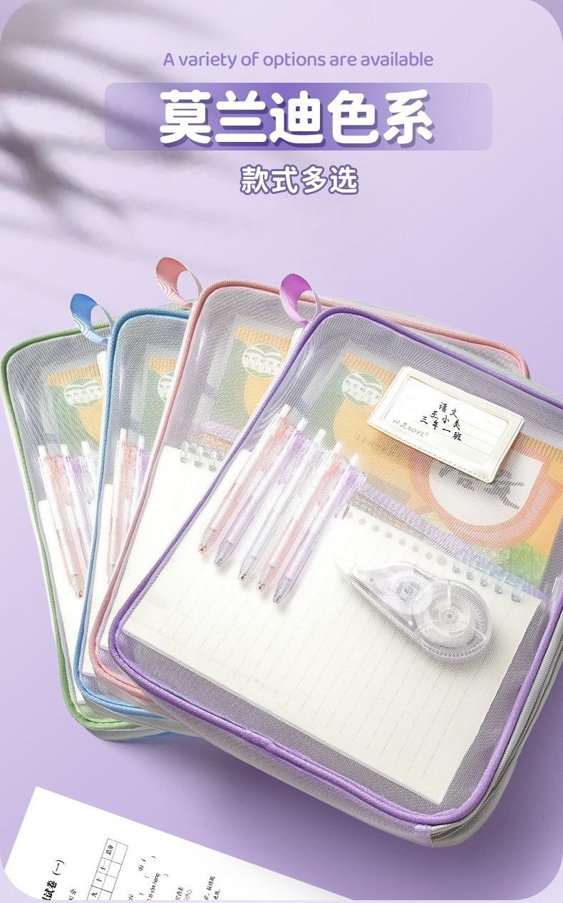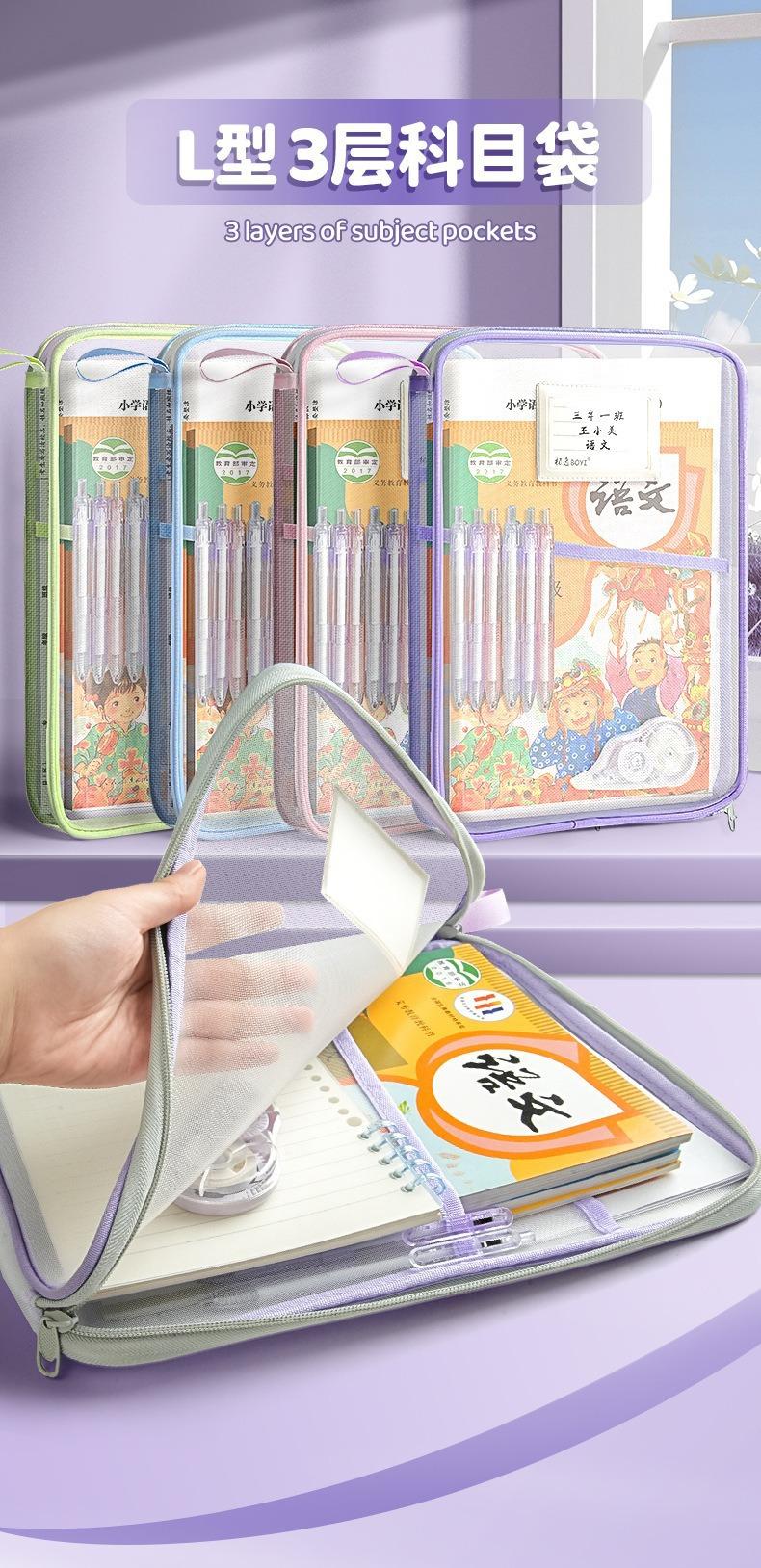 Bolsa de documentos A4 de tres capas, gran capacidad, en forma de L, con abertura grande, bolsa de almacenamiento de malla transparente para estudiantes