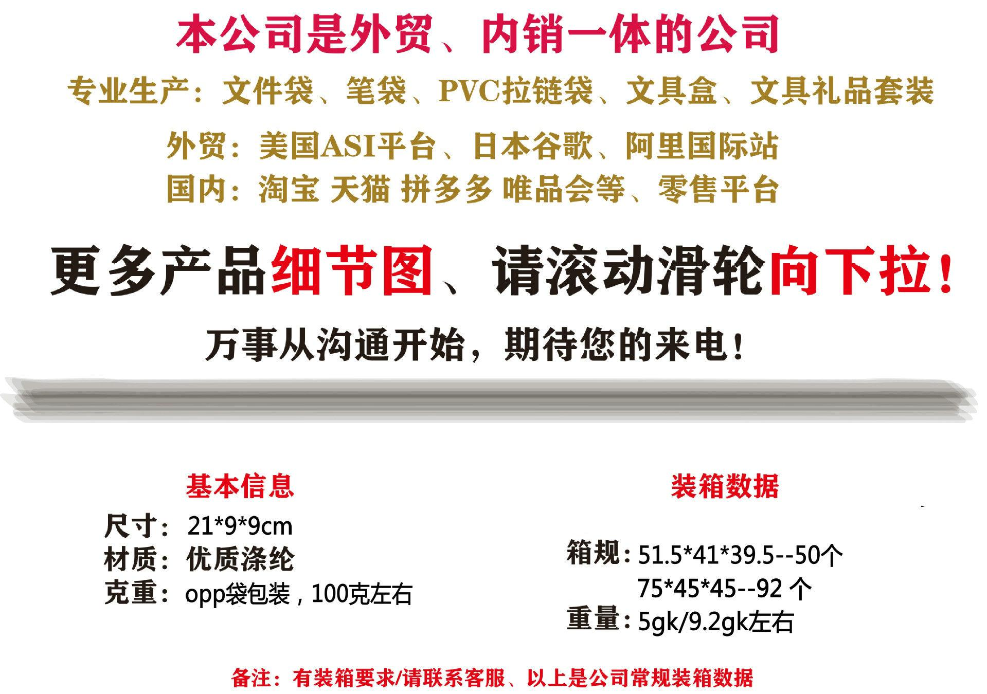 La Papelería Yiwu Ruili (anteriormente Papelería Laozhao) fue fundada en 1992. Es una empresa integral que integra diseño, producción y ventas..Especializados en la producción y venta de bolsas de PVC con cremallera, estuches finos para lápices, estuches para papelería, mochilas escolares, etc. Desde su establecimiento, la empresa se ha centrado en la investigación y el desarrollo de productos, y en la creación constante de productos según las necesidades del mercado y los clientes, de modo que los tipos de productos son constantemente completos y los estilos se enriquecen constantemente. Gestión científica, estricto control de calidad, con excelente calidad, precios razonables y un servicio atento a la mayoría de los clientes. En los últimos años, la empresa se ha desarrollado de forma constante y sus productos se exportan a Estados Unidos, Europa, el Sudeste Asiático y otros lugares. Debido a la alta calidad de los productos, la fina mano de obra y los estilos novedosos, ha ganado el favor de los empresarios extranjeros y ha establecido relaciones de cooperación comercial estables con muchos empresarios extranjeros.