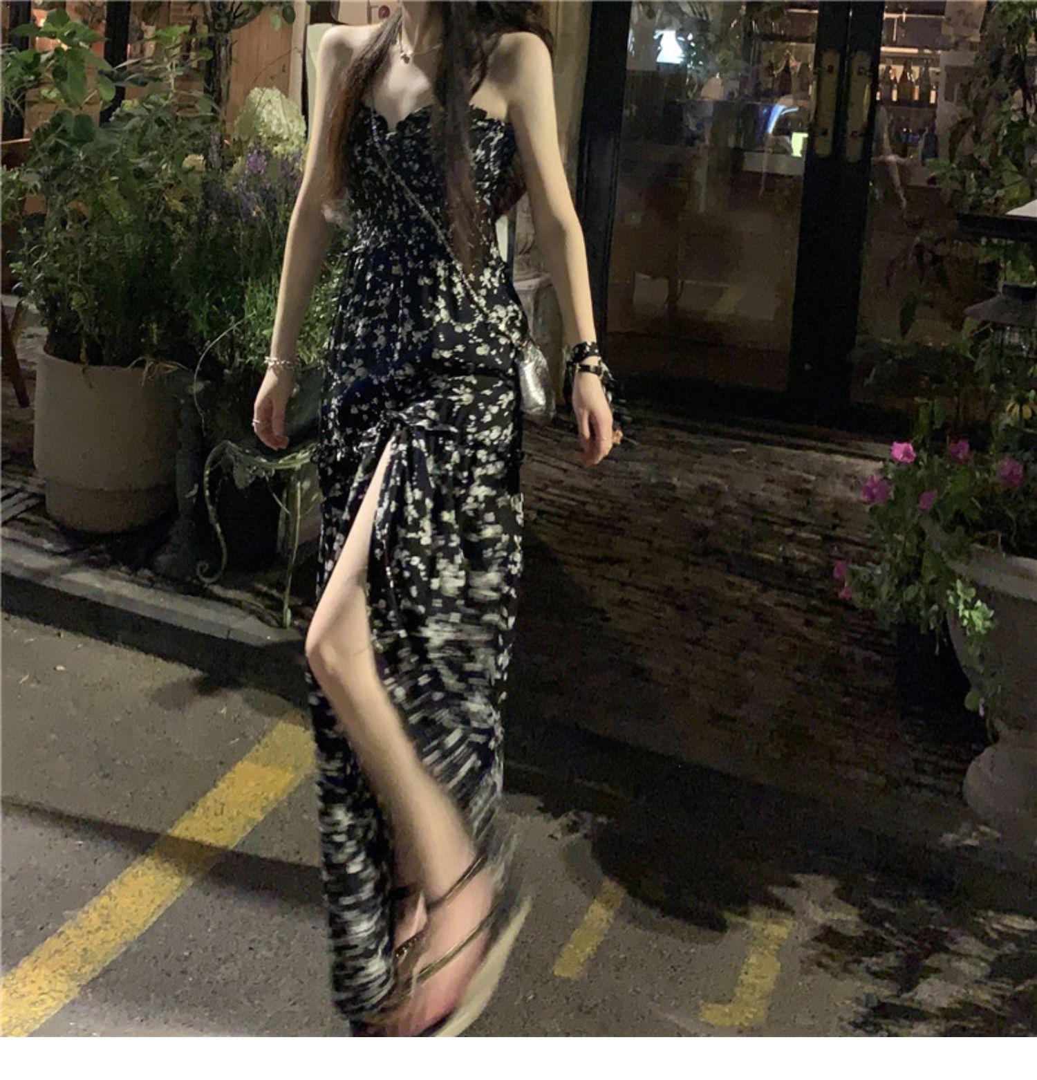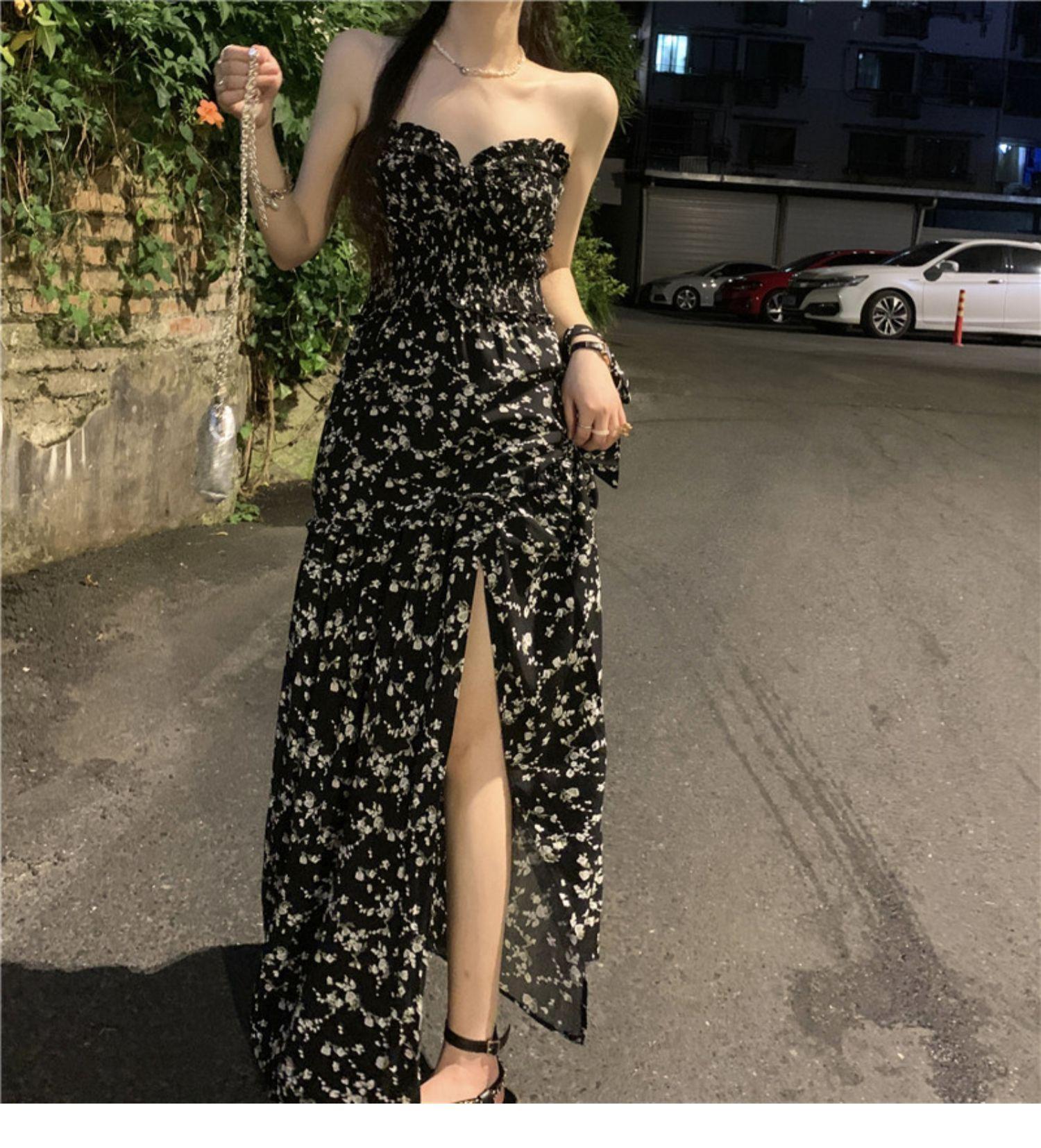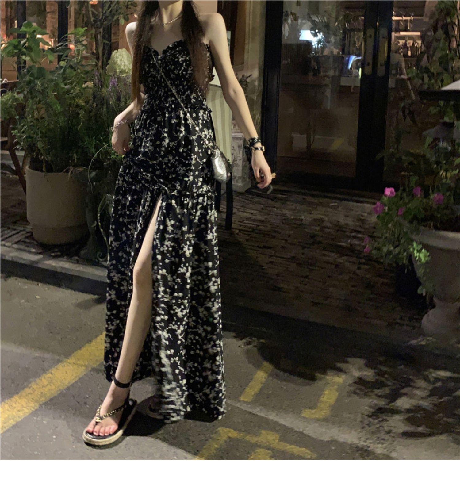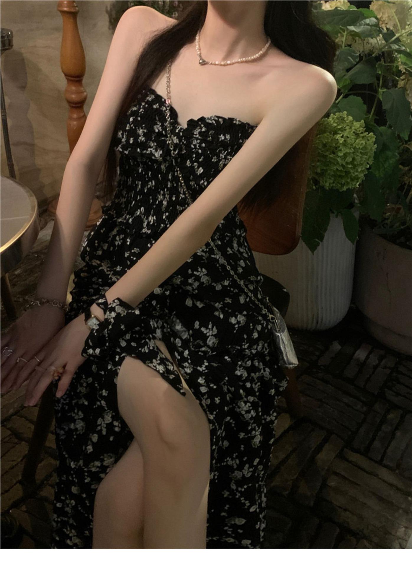 (Correa de hombro transparente) Vestido Largo de Verano para Mujer Estilo Francés Hora del Té Floral Negro con Abertura Sin Tirantes para la Playa