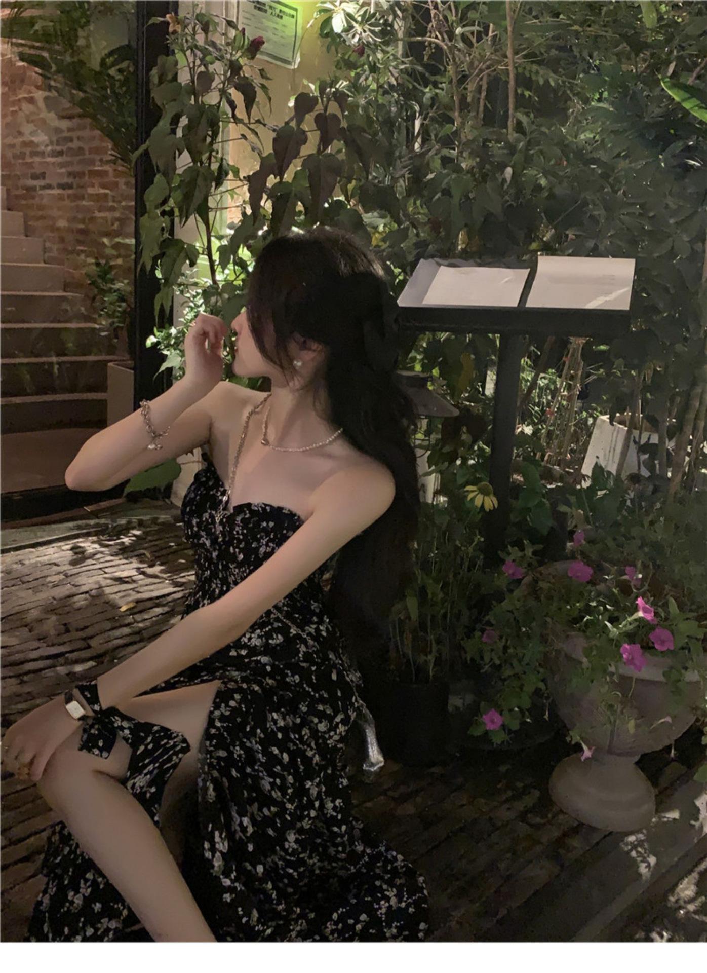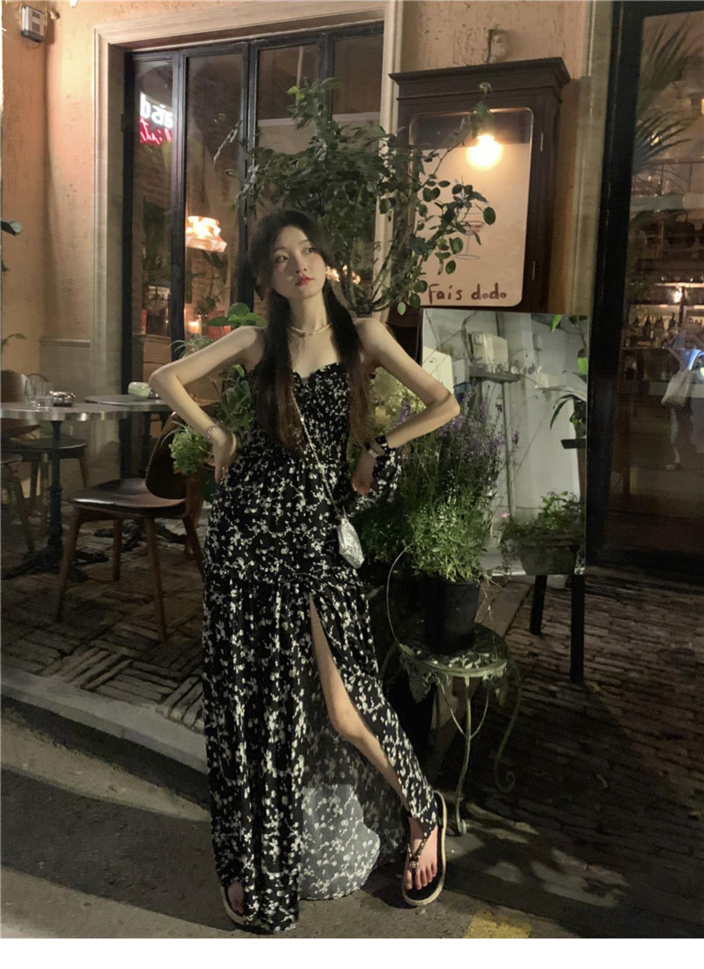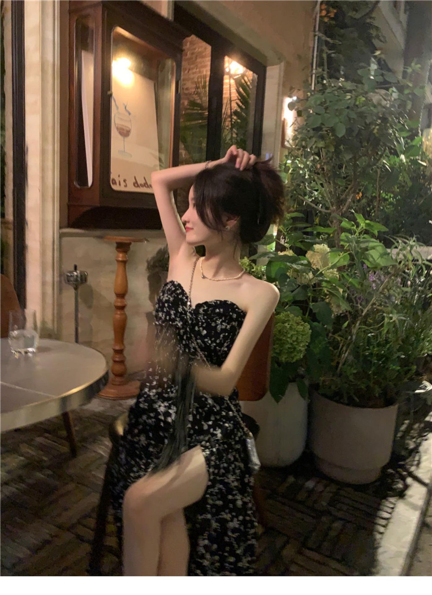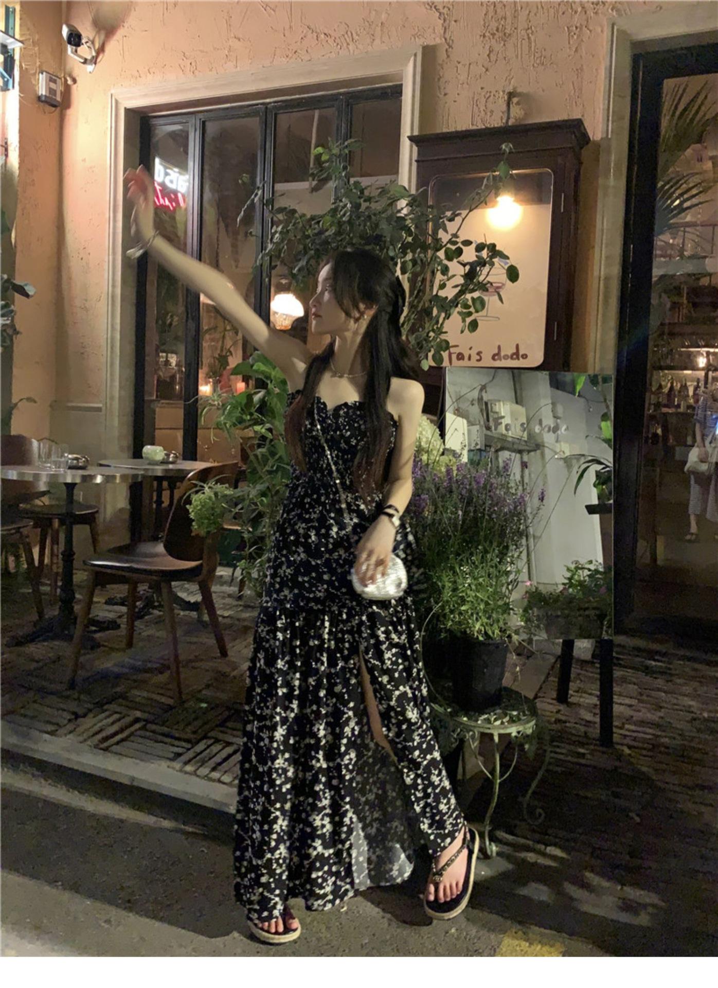 (Correa de hombro transparente) Vestido Largo de Verano para Mujer Estilo Francés Hora del Té Floral Negro con Abertura Sin Tirantes para la Playa
