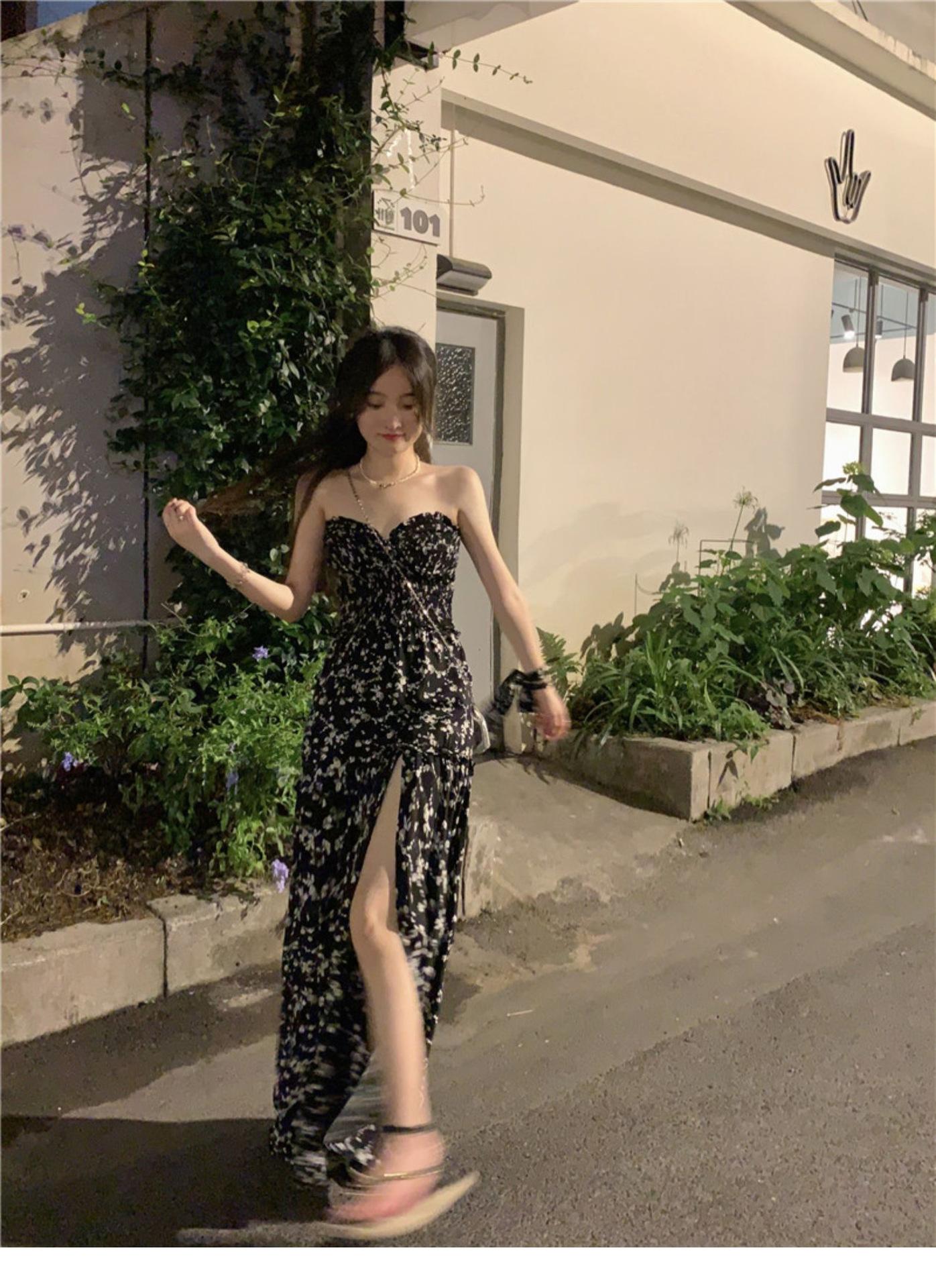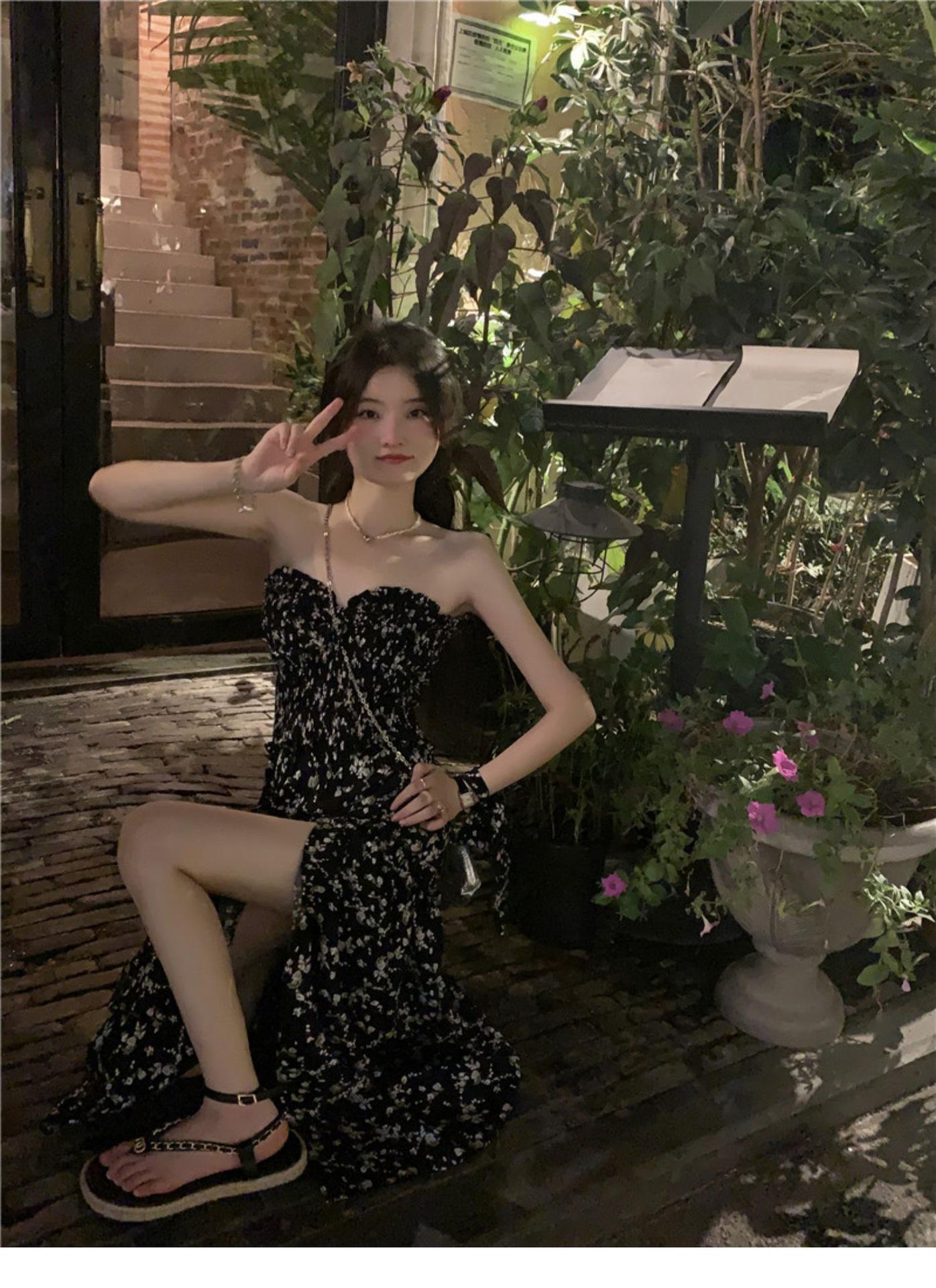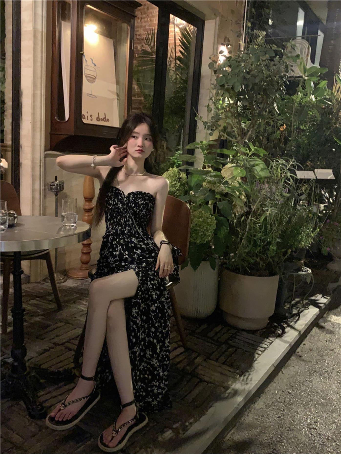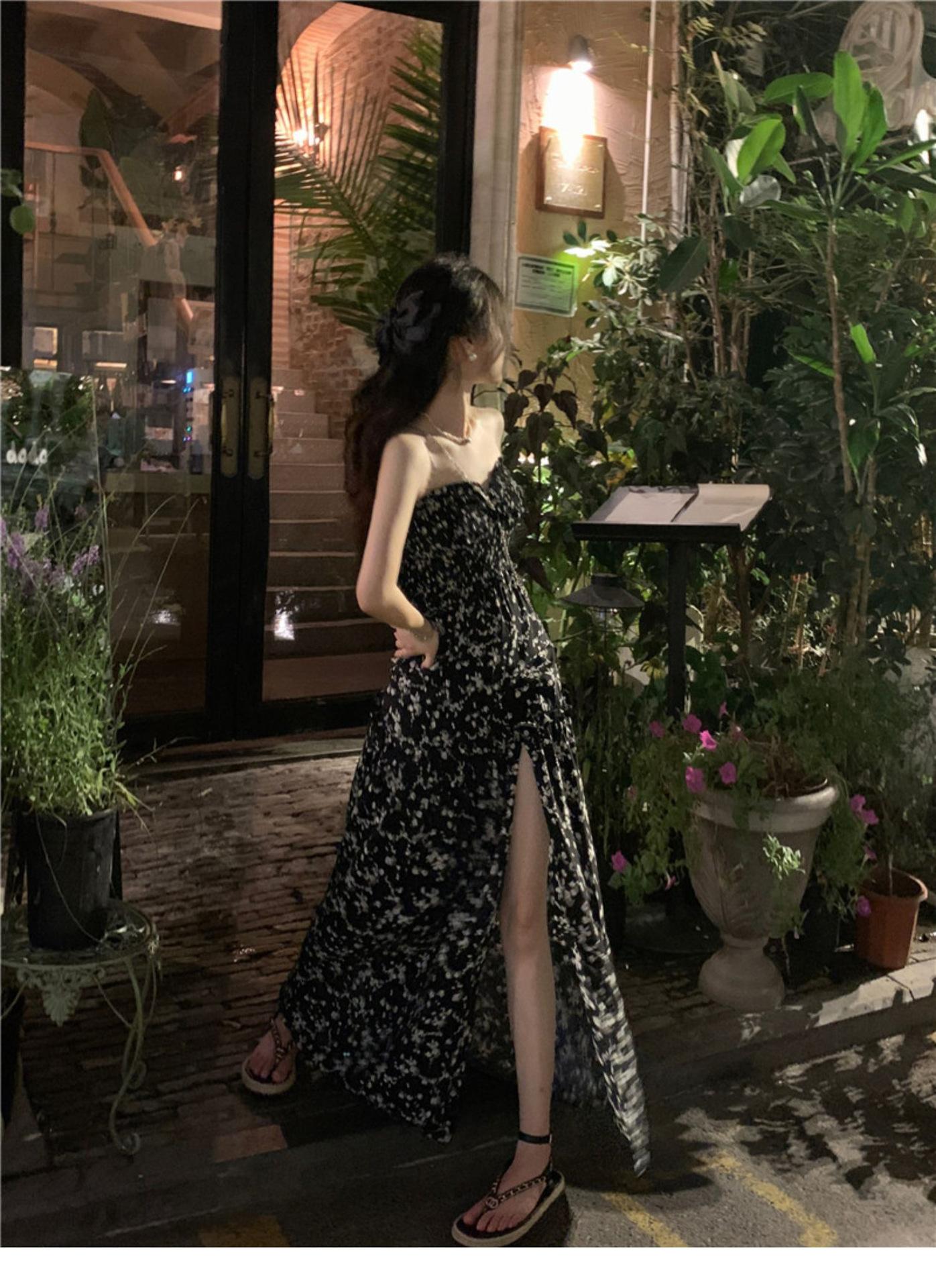(Correa de hombro transparente) Vestido Largo de Verano para Mujer Estilo Francés Hora del Té Floral Negro con Abertura Sin Tirantes para la Playa