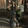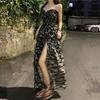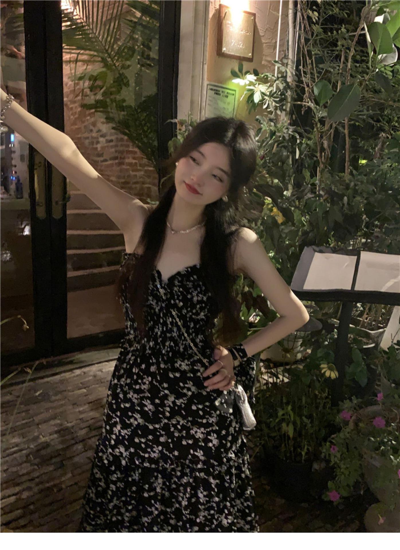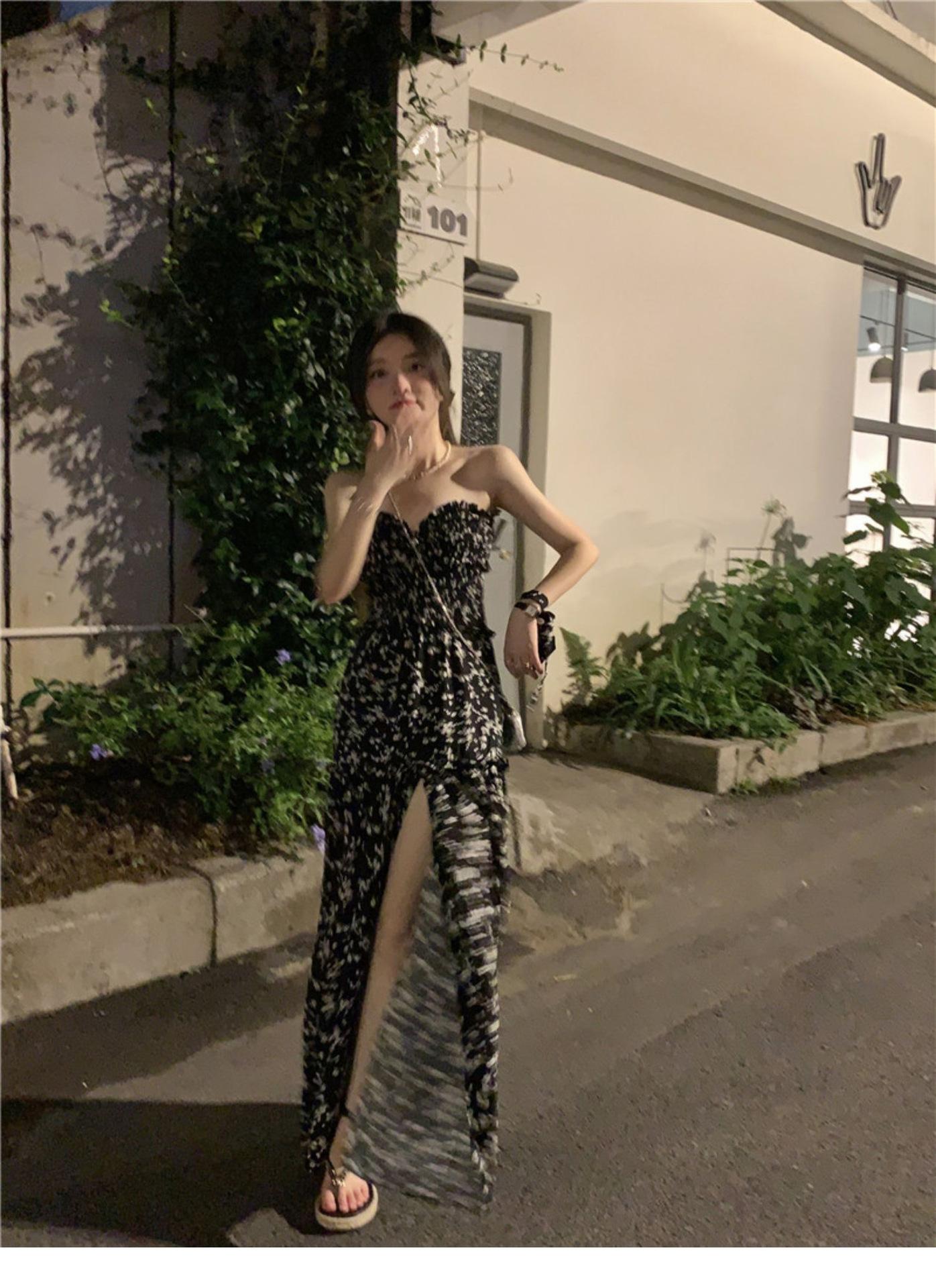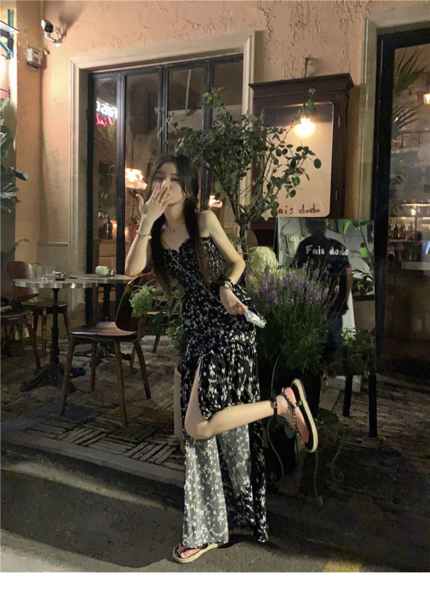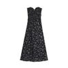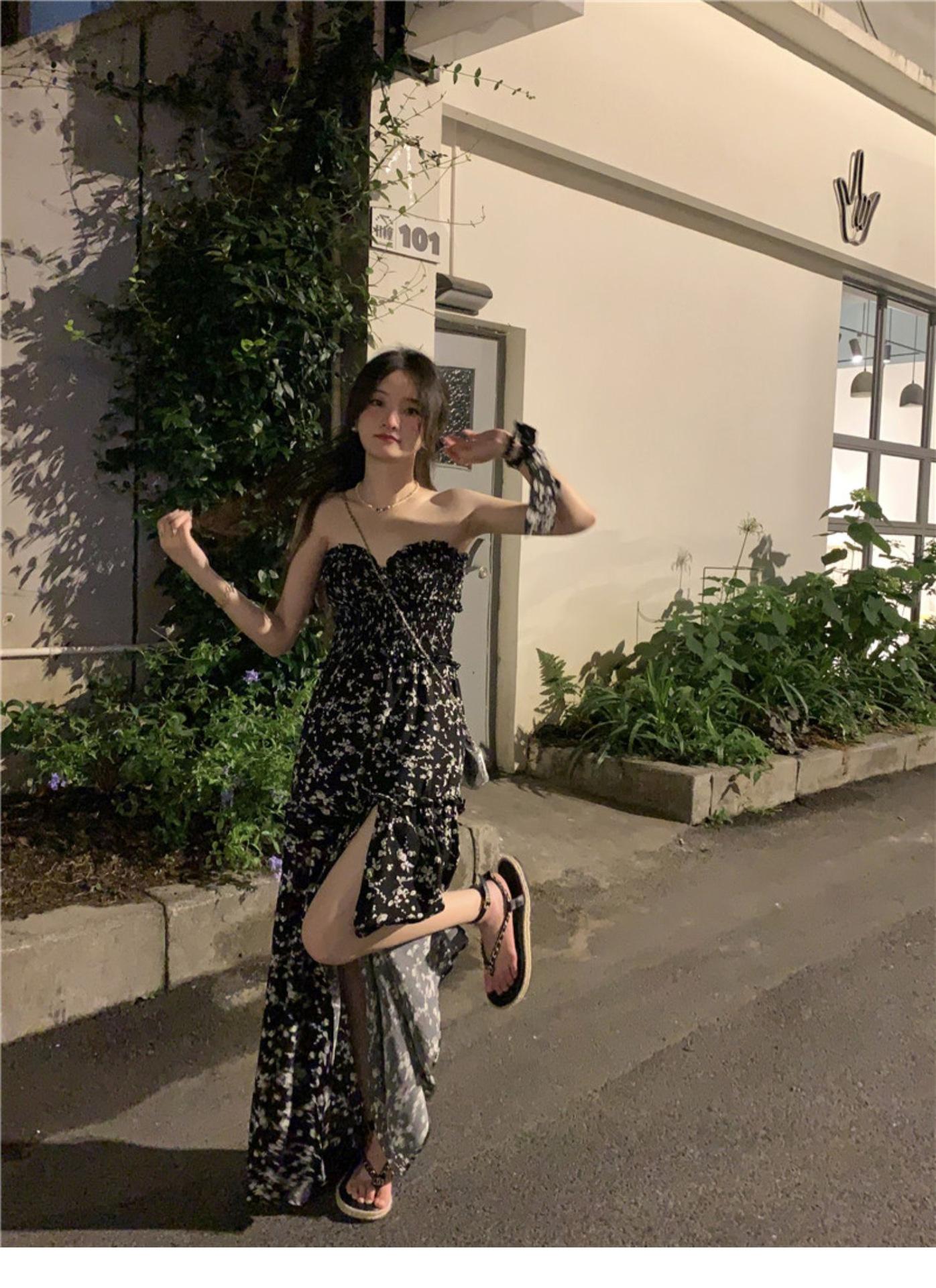 (Correa de hombro transparente) Vestido Largo de Verano para Mujer Estilo Francés Hora del Té Floral Negro con Abertura Sin Tirantes para la Playa