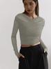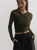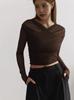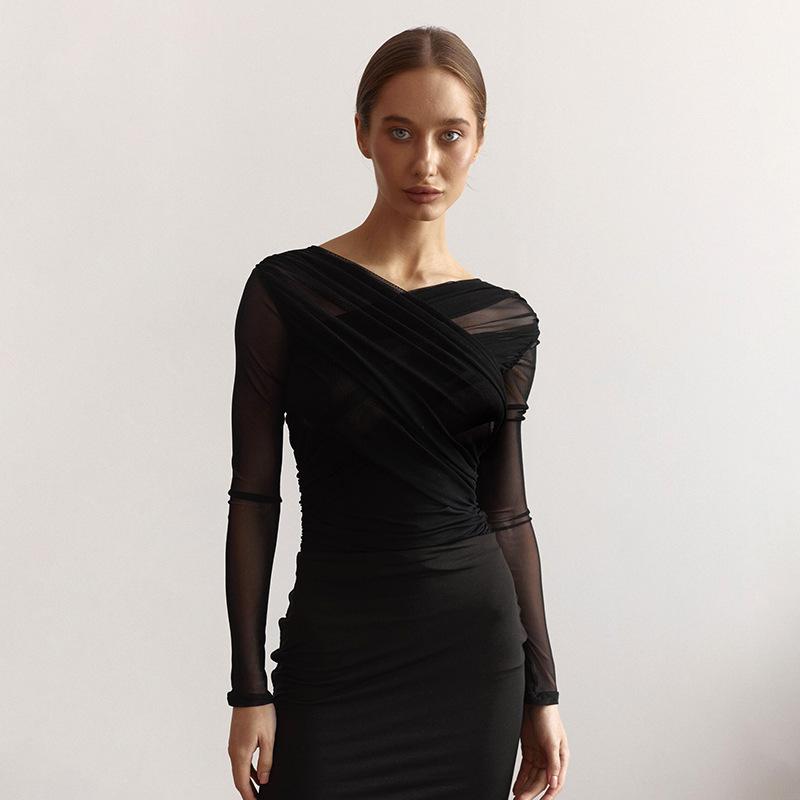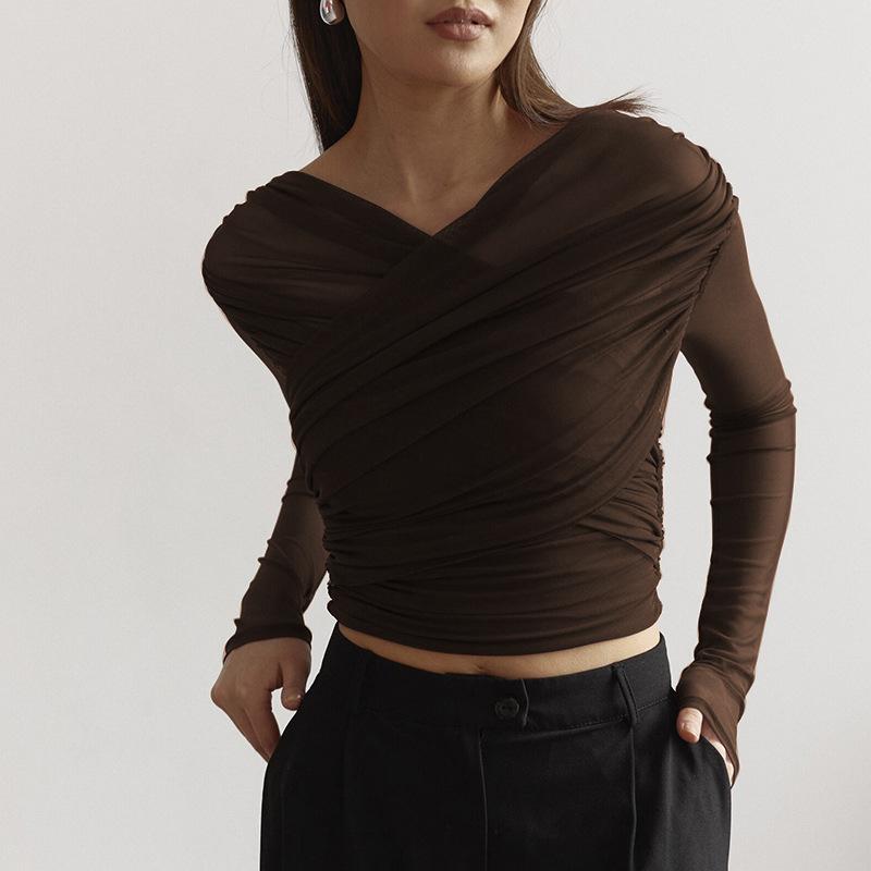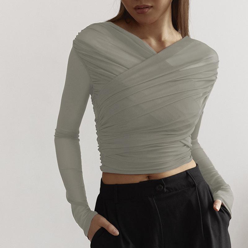 Camiseta top de manga larga plisada sexy de malla de color sólido nueva de otoño para mujer europea y americana