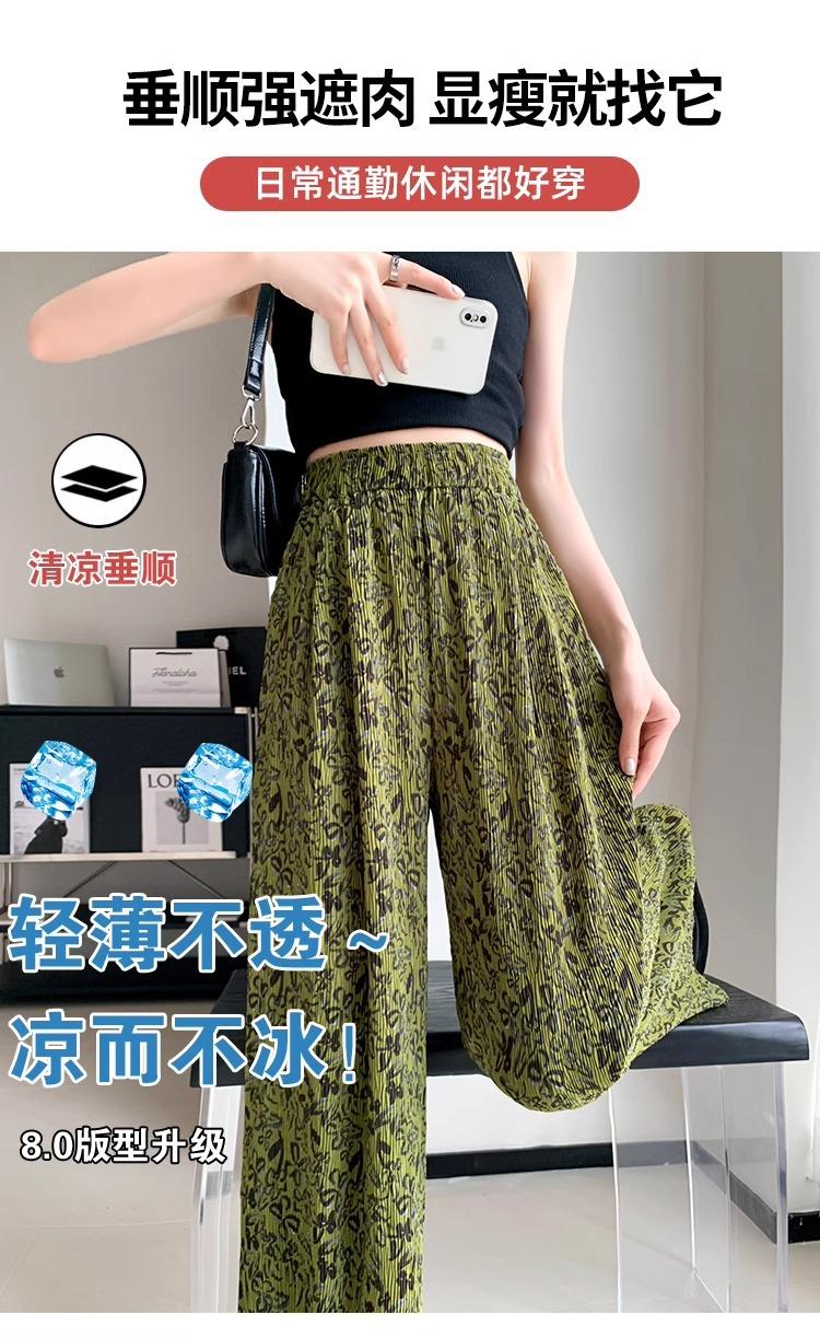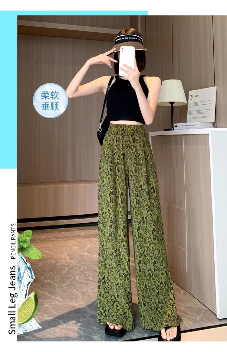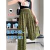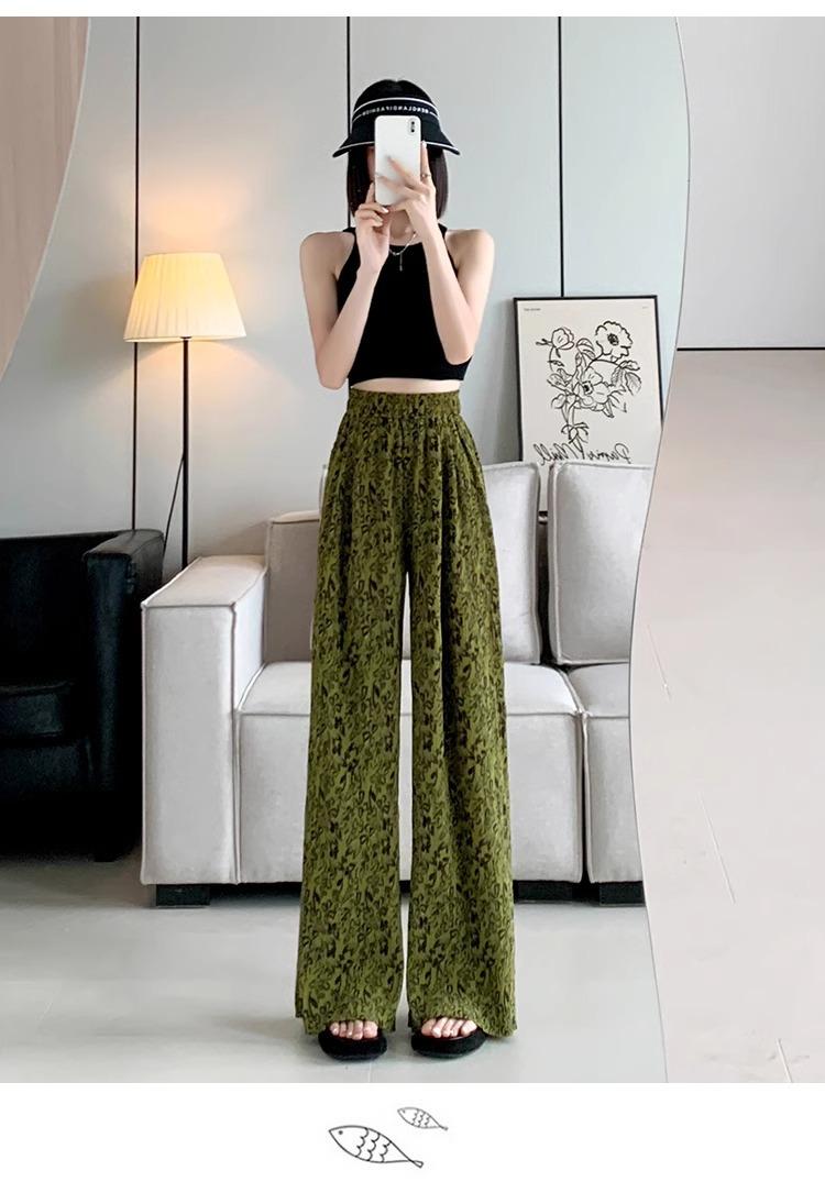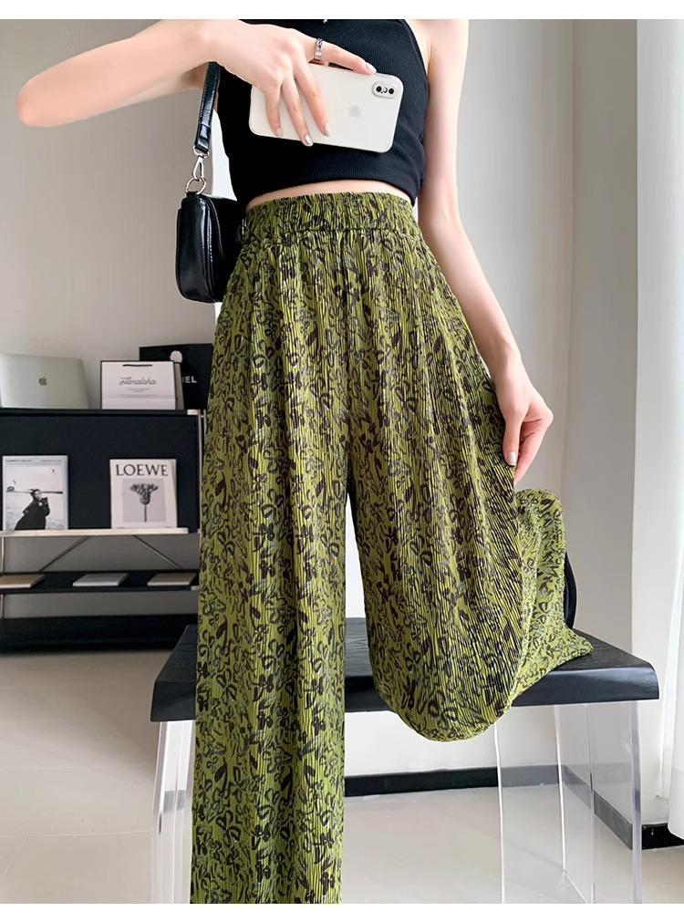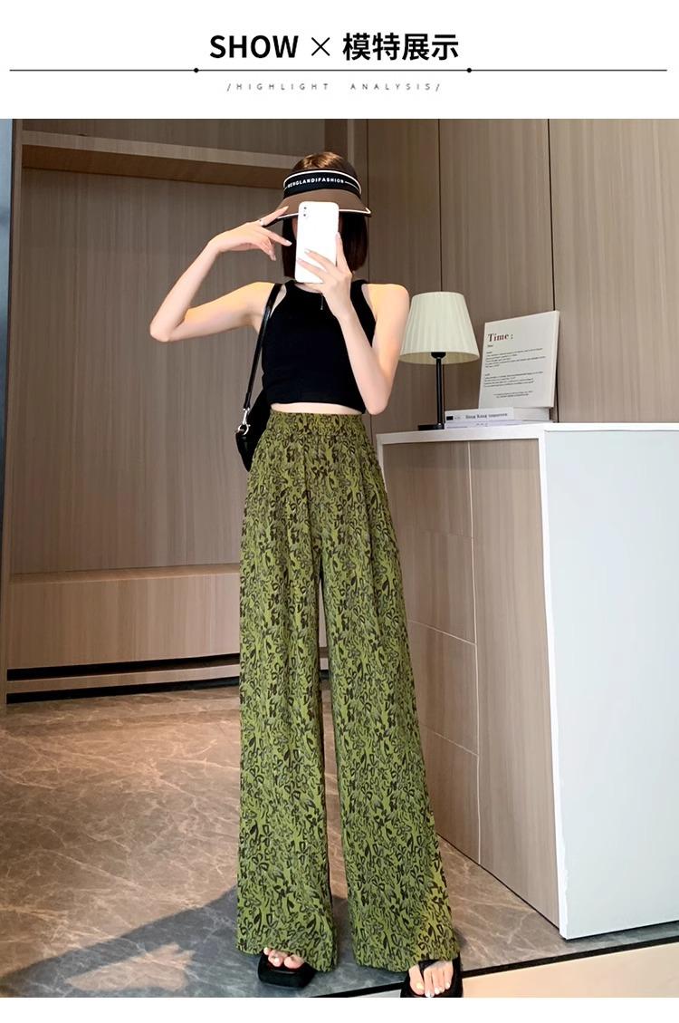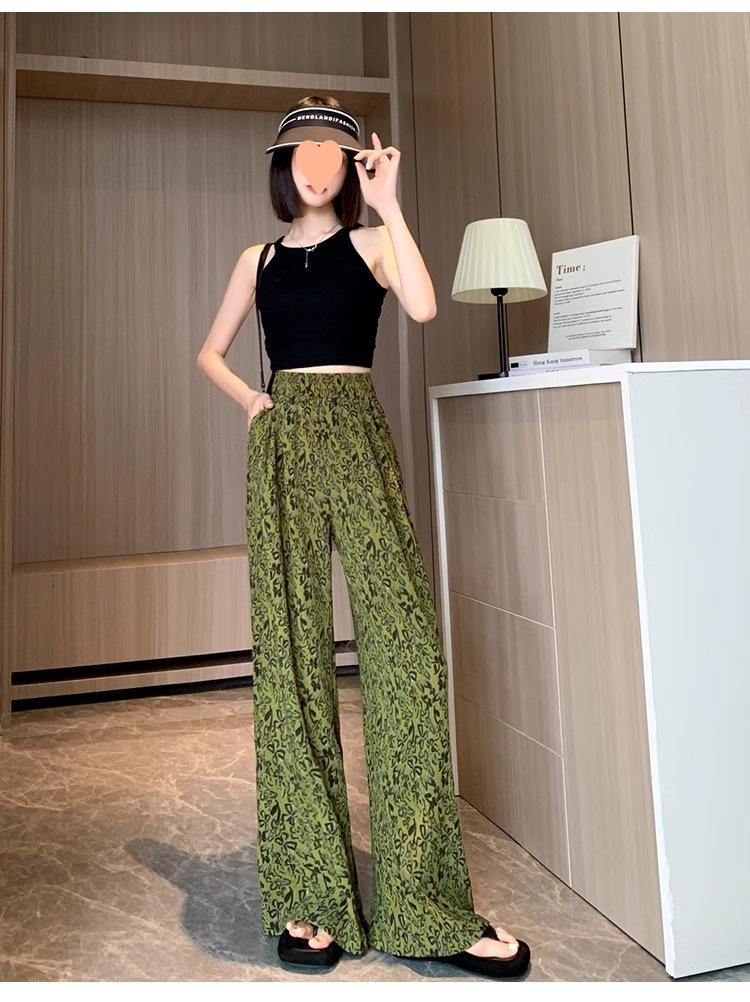 2025 Nuevo Pantalón Verde Estampado de Seda de Hielo de Pierna Ancha para Mujer Verano Delgado Cintura Alta Drapeado Chifón Plisado Pantalón Largo Hasta el Piso
