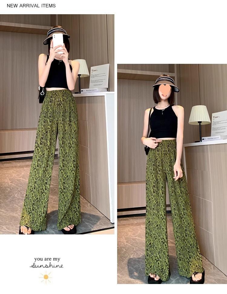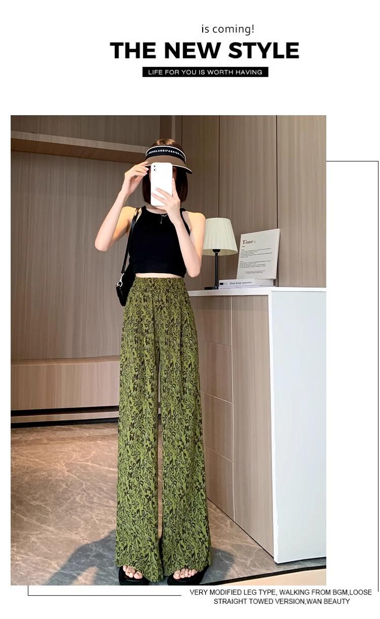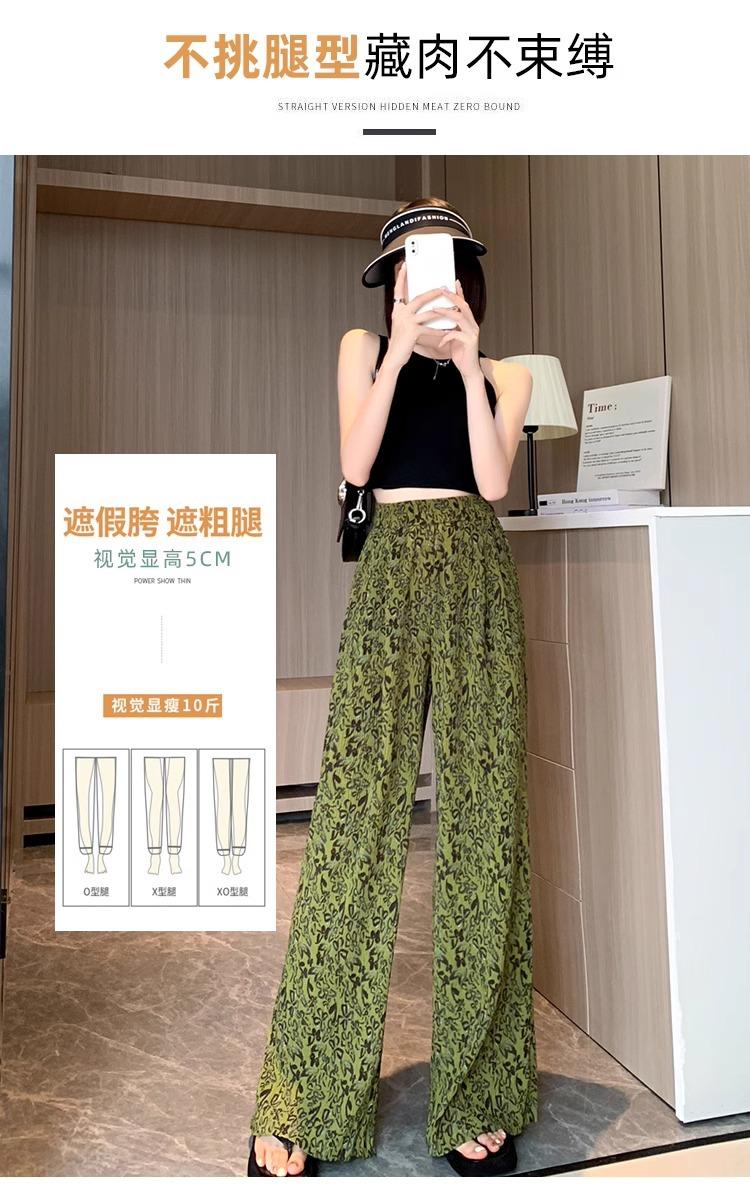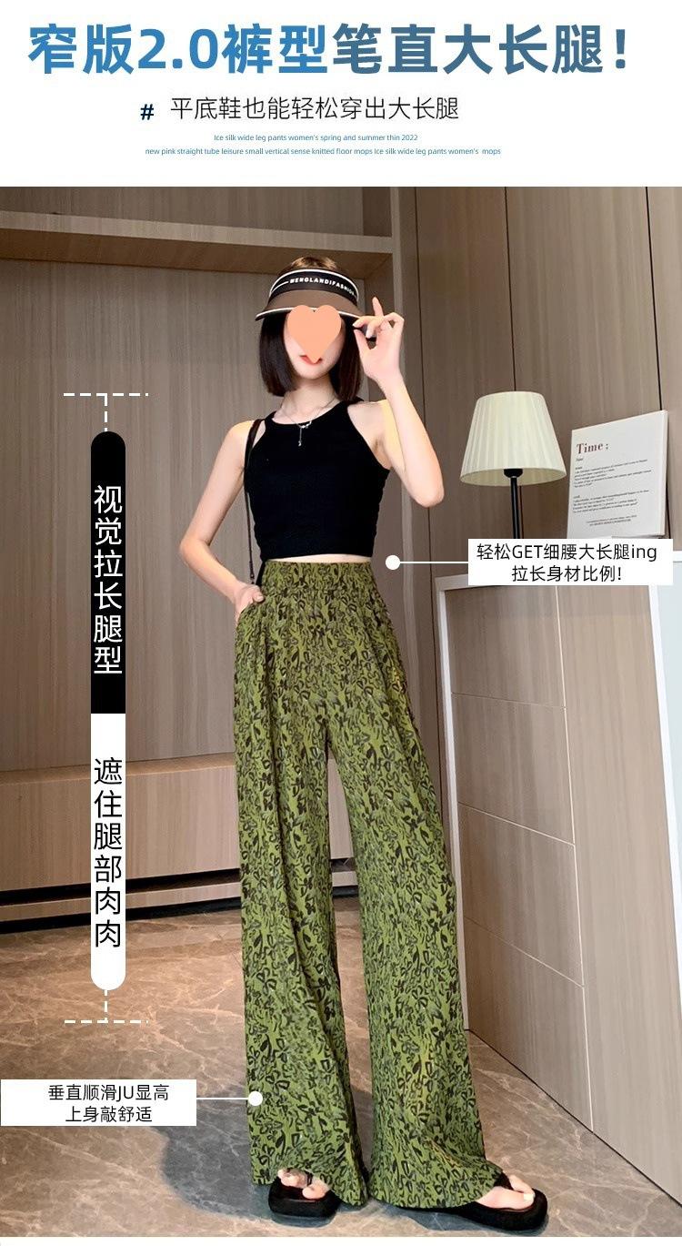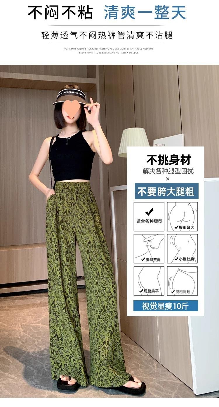 2025 Nuevo Pantalón Verde Estampado de Seda de Hielo de Pierna Ancha para Mujer Verano Delgado Cintura Alta Drapeado Chifón Plisado Pantalón Largo Hasta el Piso