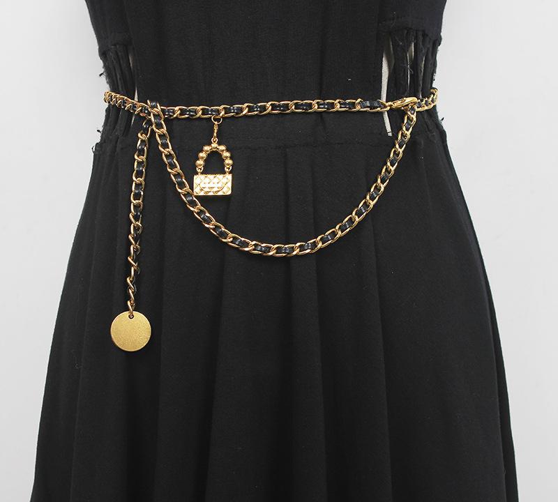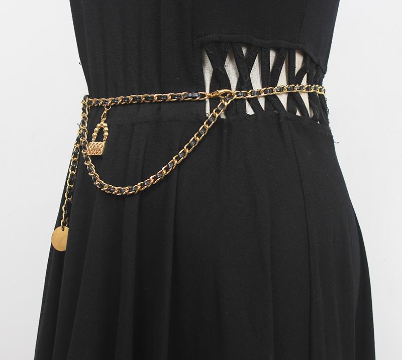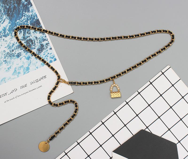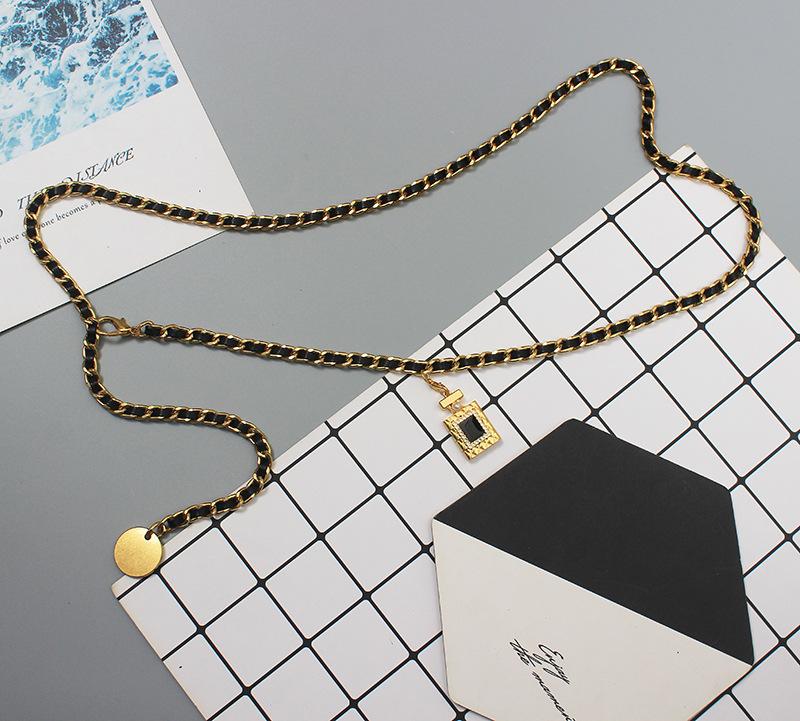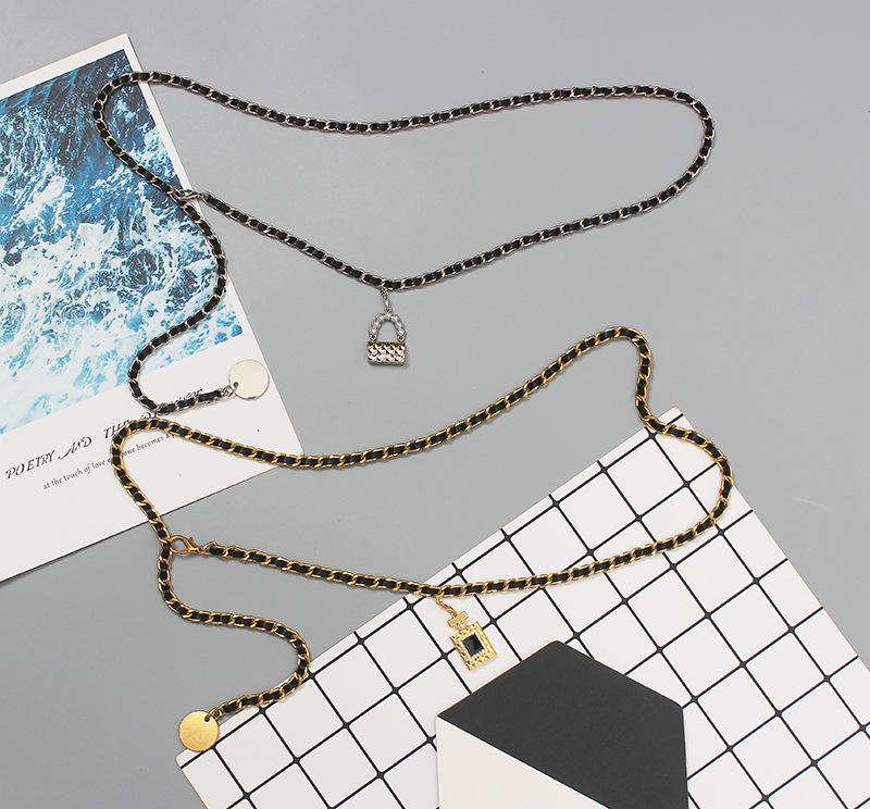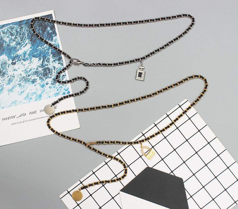 Cinturón de cadena tejido de cuero de alta calidad de lujo ligero estilo francés, elegante y a la moda, con colgante de candado, accesorios