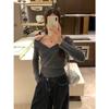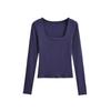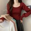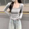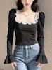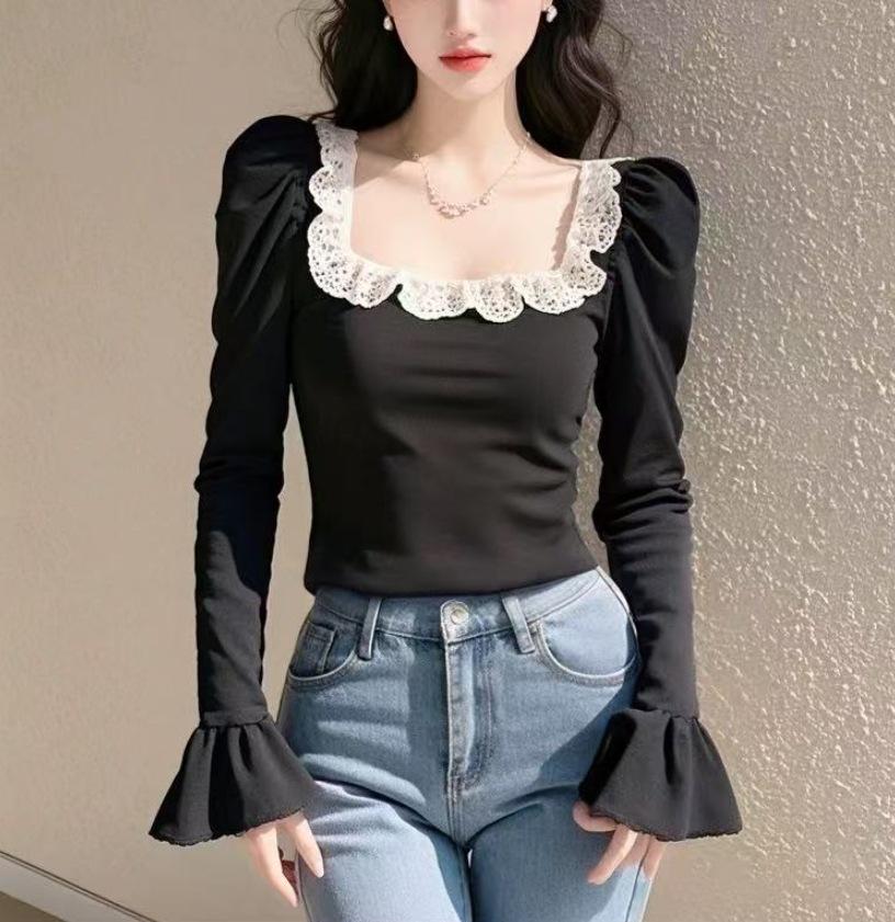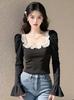 Camiseta de manga larga con cuello cuadrado para mujer, primavera y otoño, nueva, elegante, ajustada, combinable, negra, con mangas acampanadas.