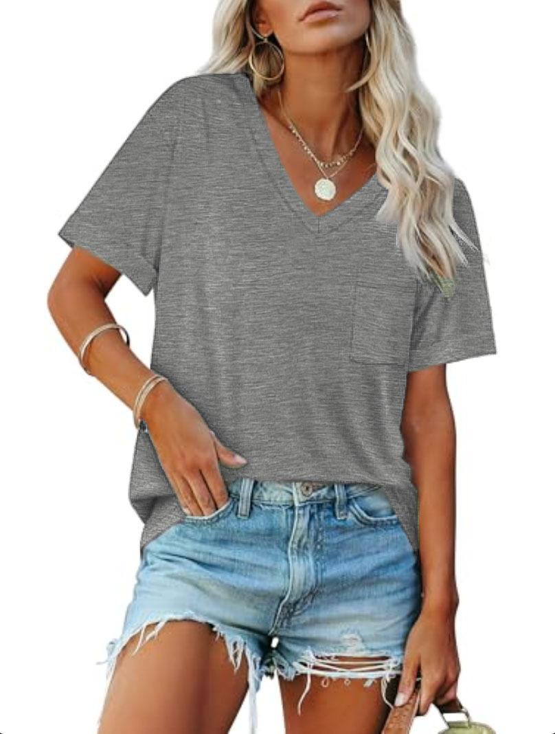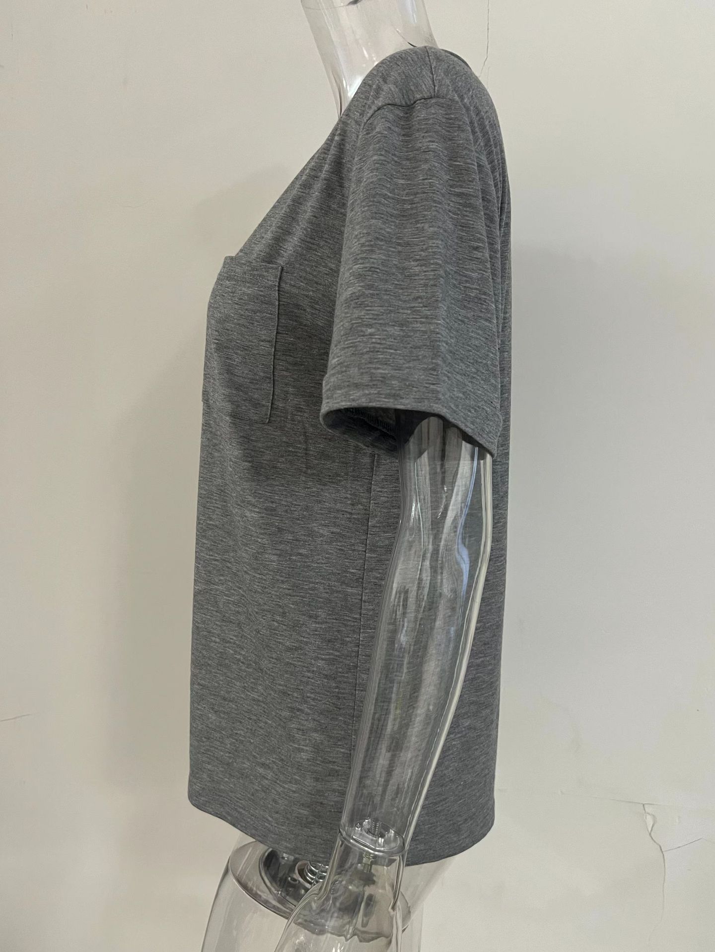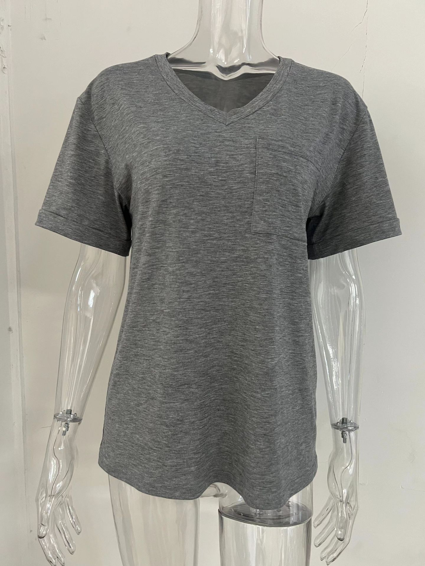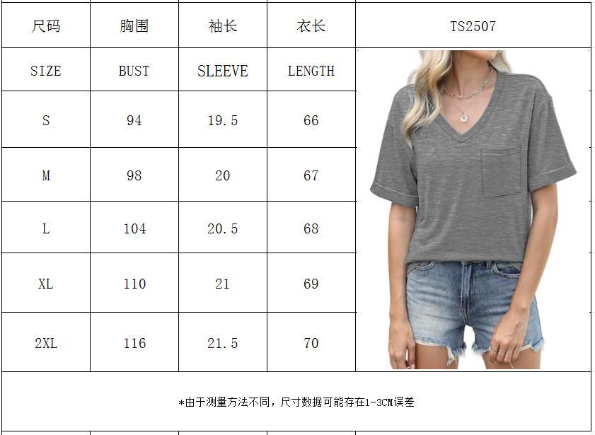 Camiseta de verano 2025 para mujer, de comercio exterior transfronterizo entre Europa y América, holgada, informal, con cuello en V, manga corta y bolsillo, de color liso