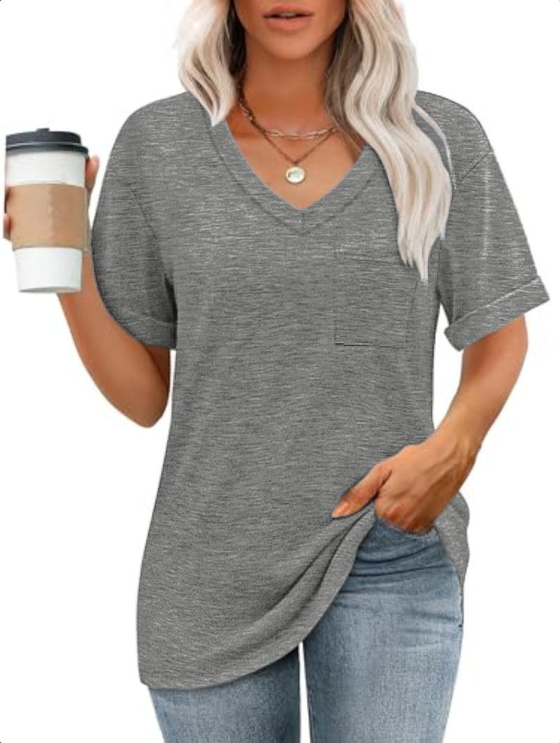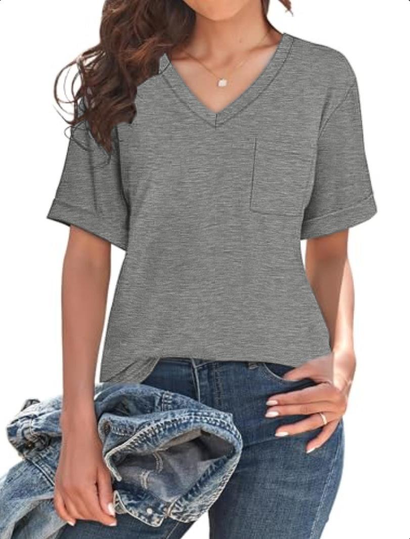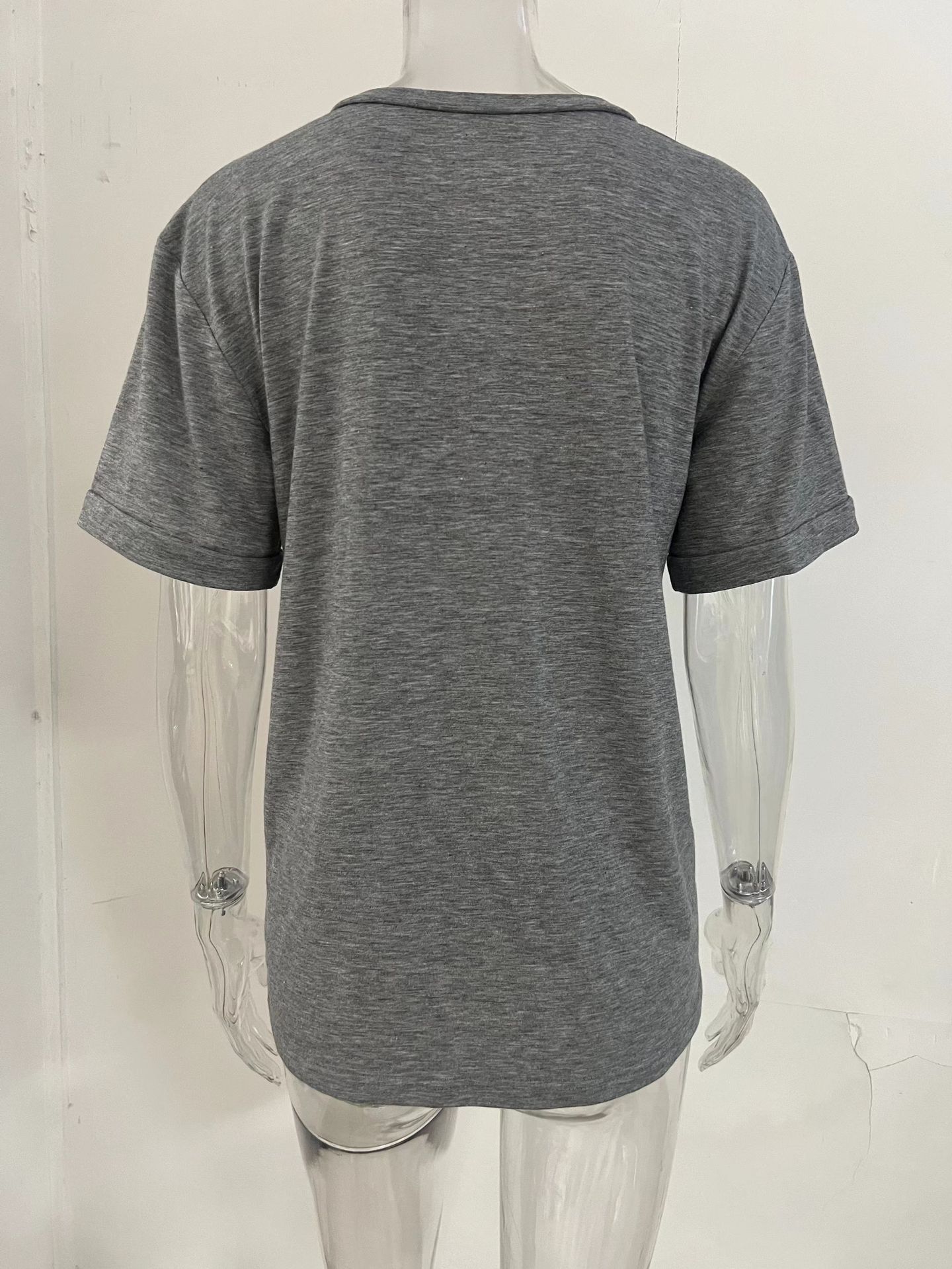 Camiseta de verano 2025 para mujer, de comercio exterior transfronterizo entre Europa y América, holgada, informal, con cuello en V, manga corta y bolsillo, de color liso