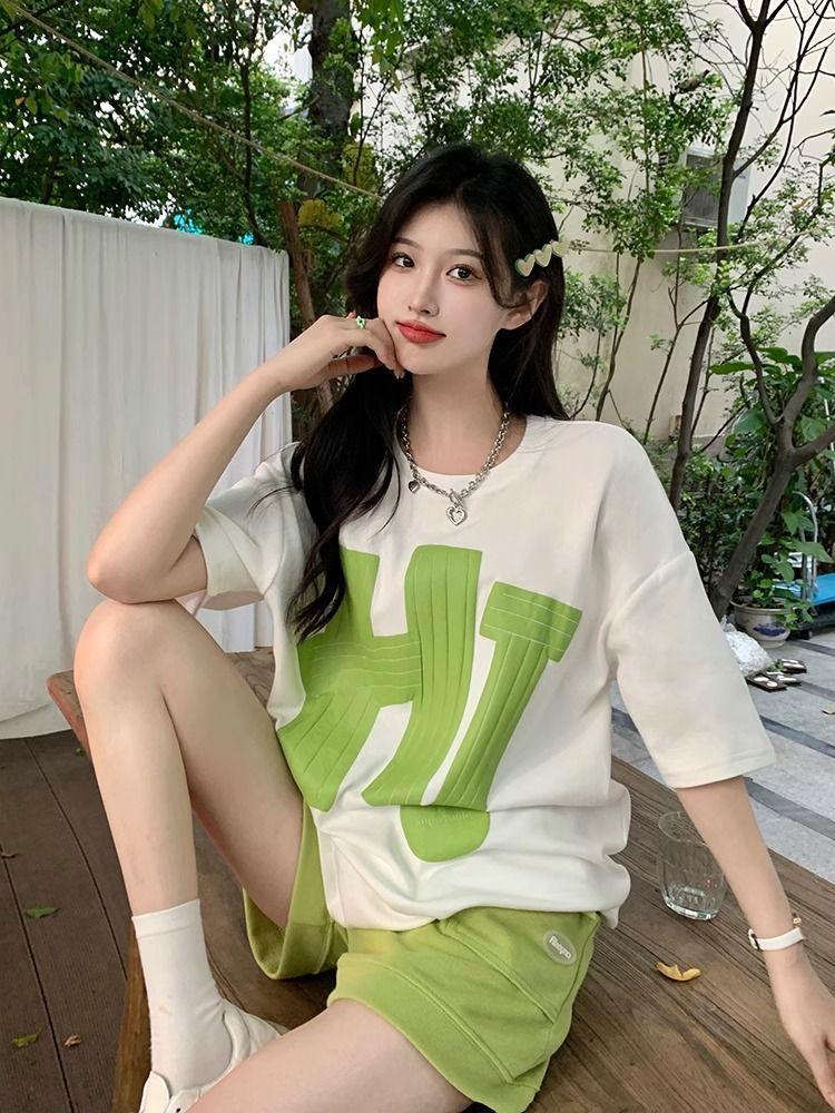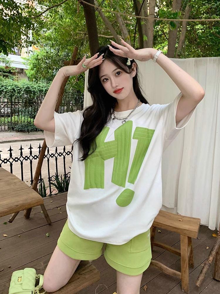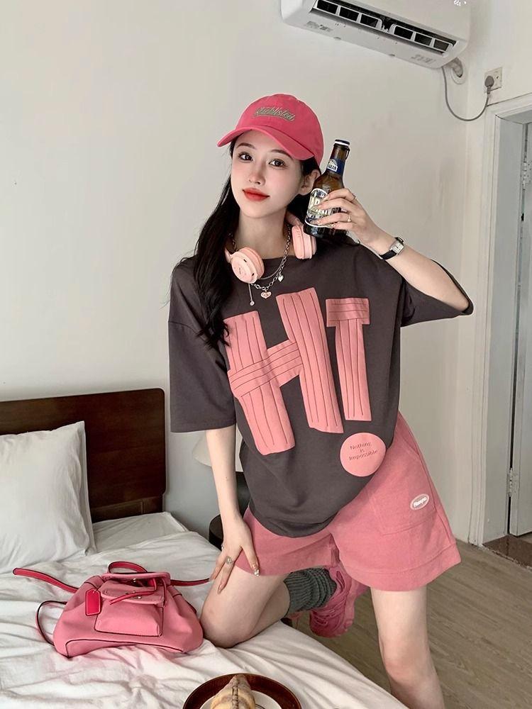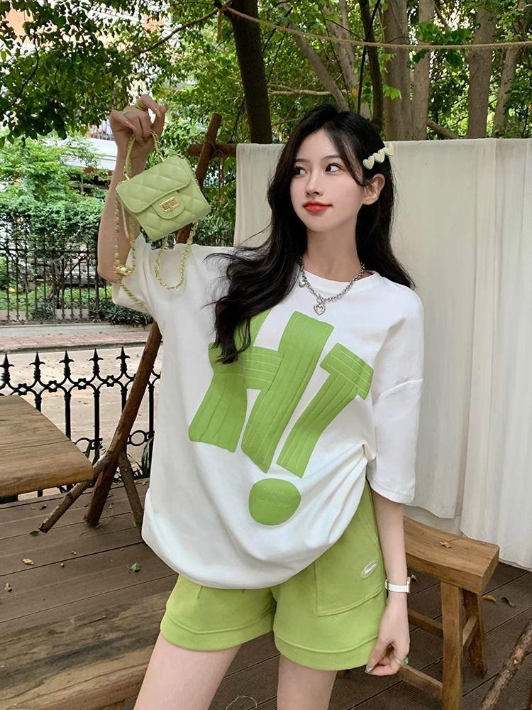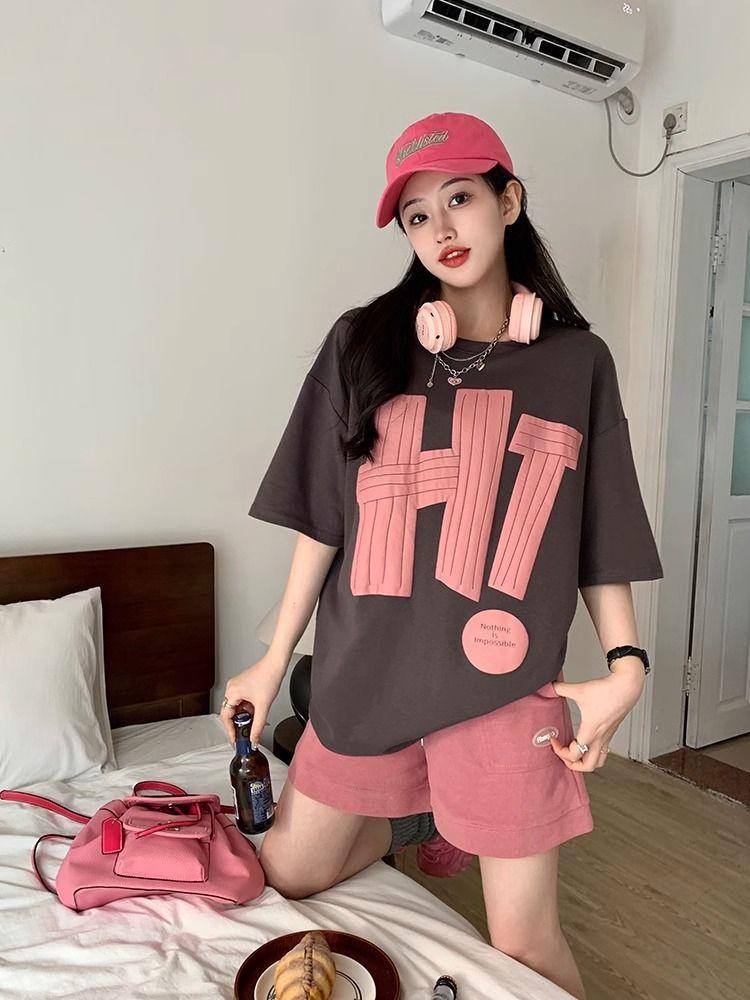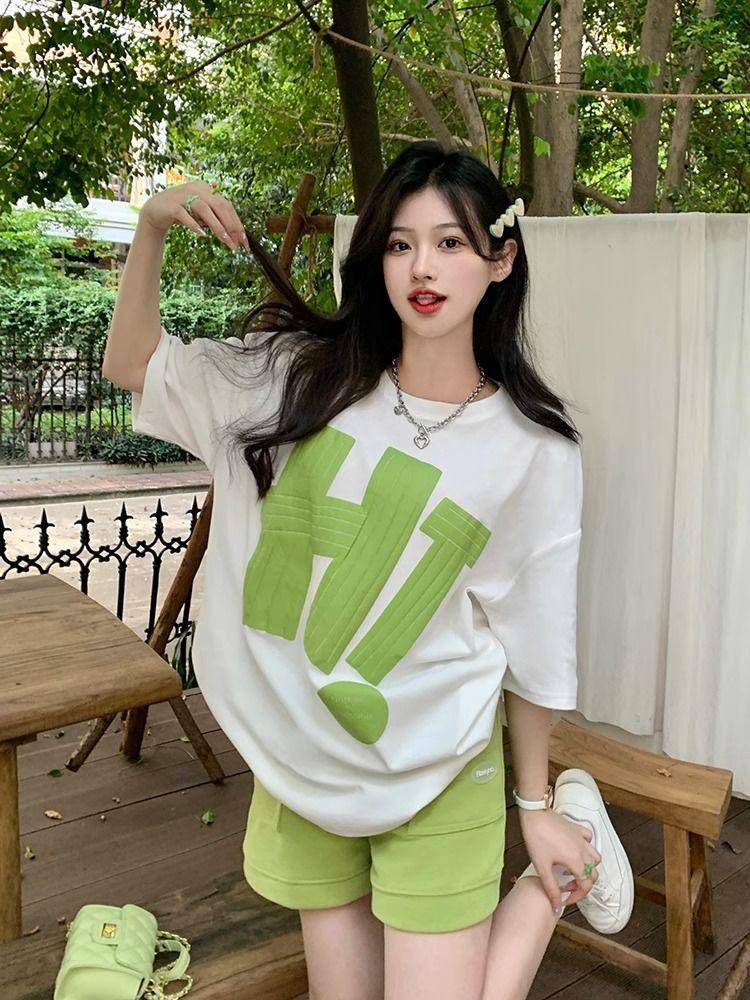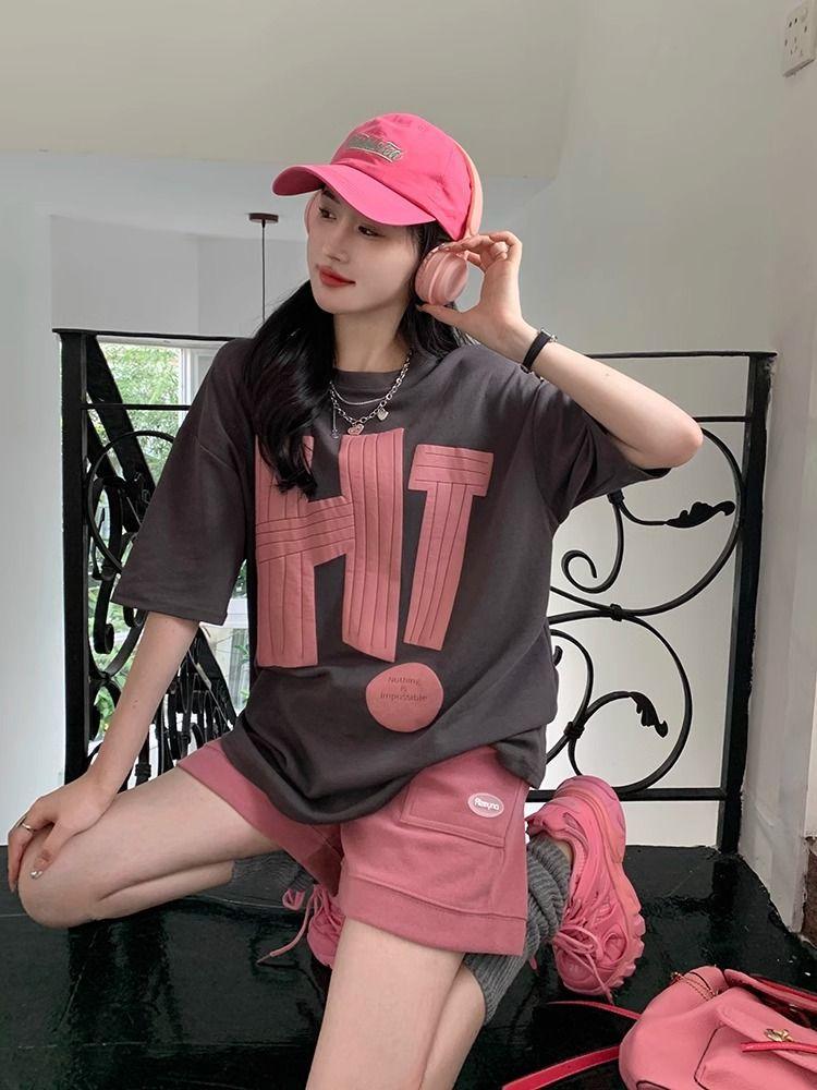 Verano 2024 Deportes Ocio Internet Popular Novedad Traje Mujer Pantalones Cortos Anchos Moda Estampado Manga Corta Conjunto Americano de Dos Piezas