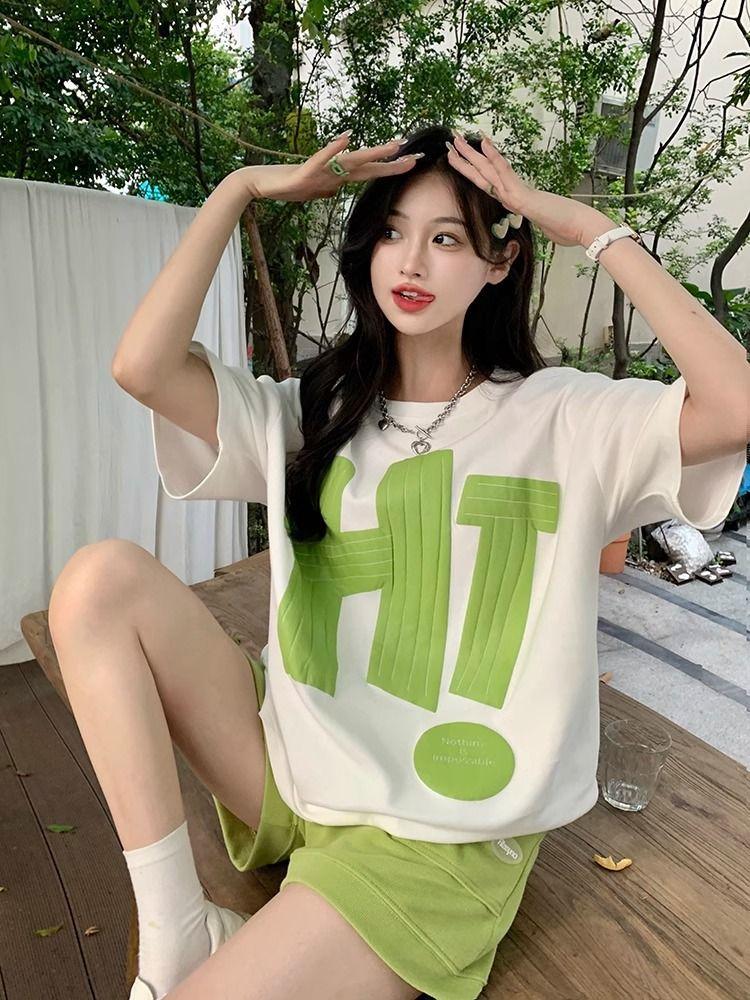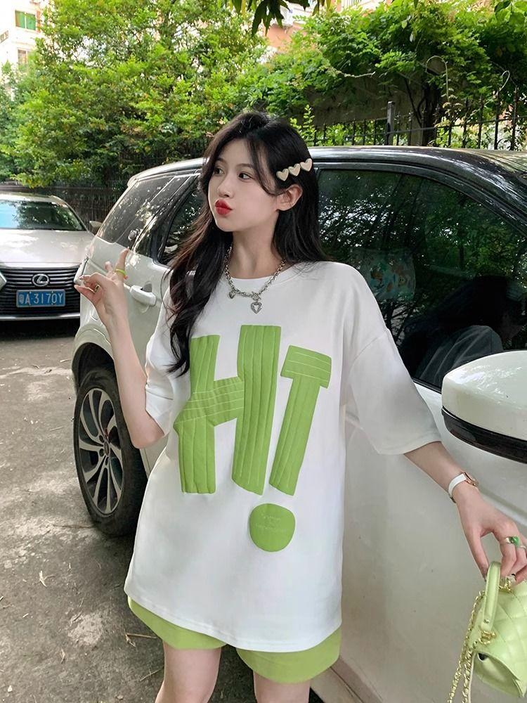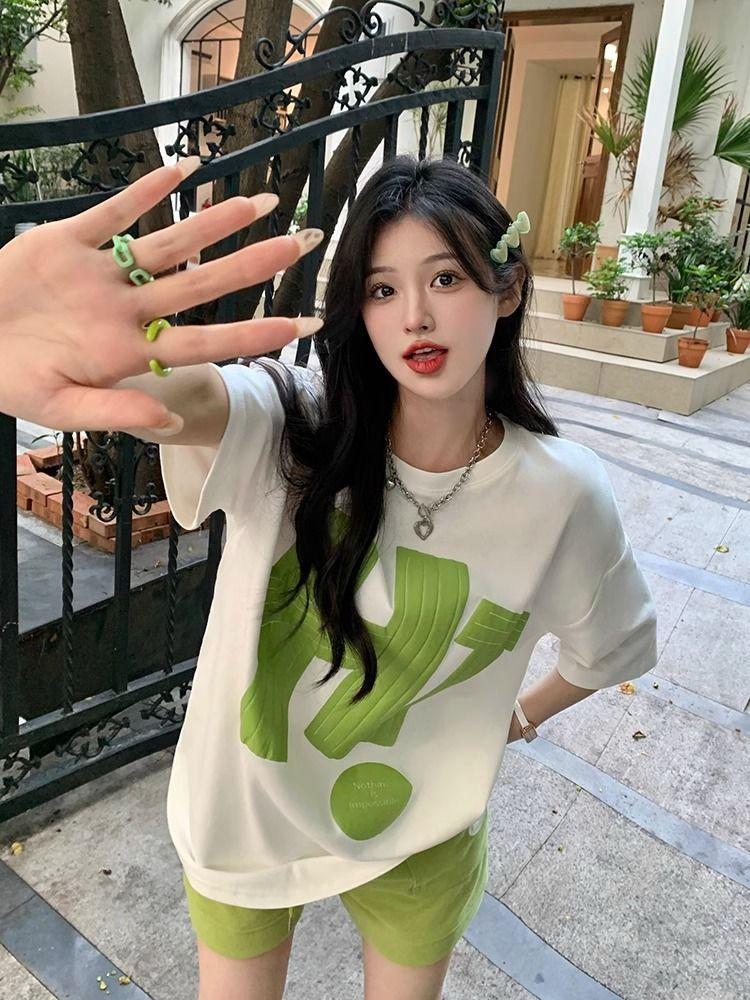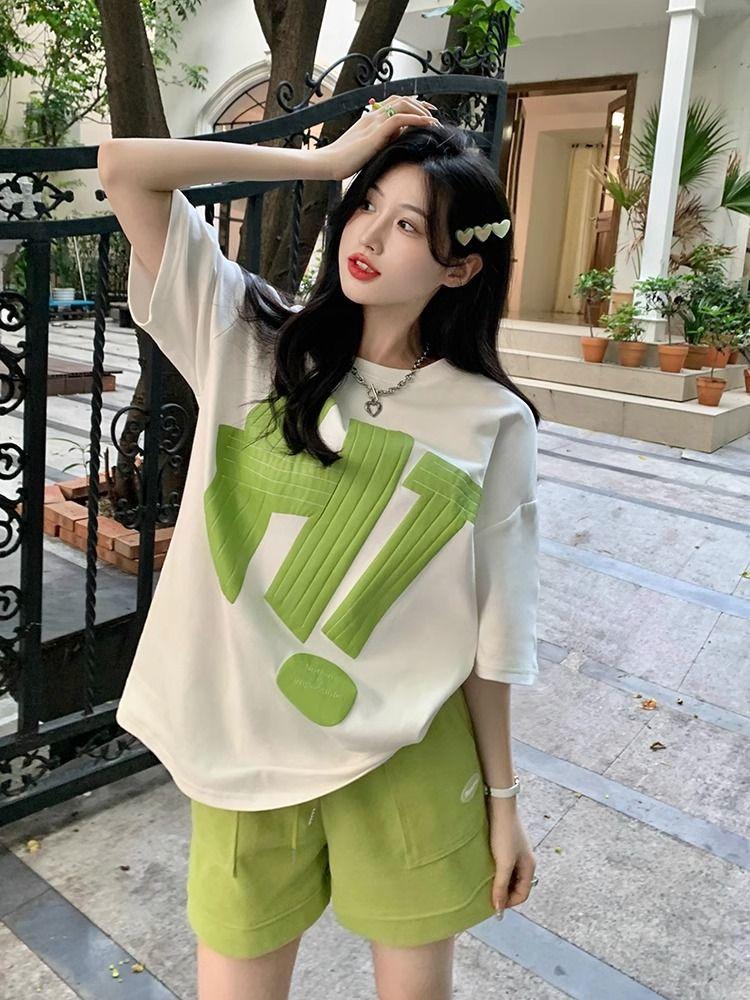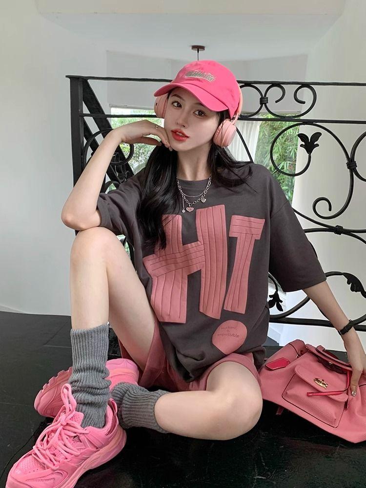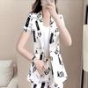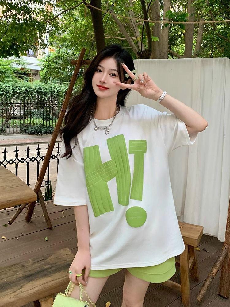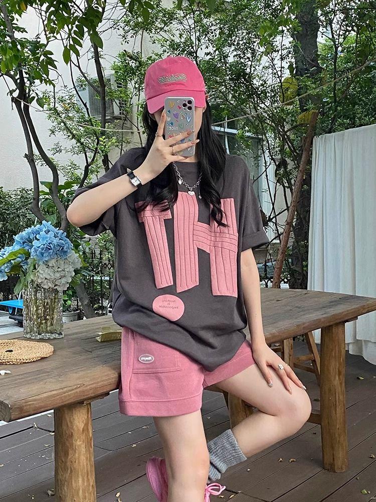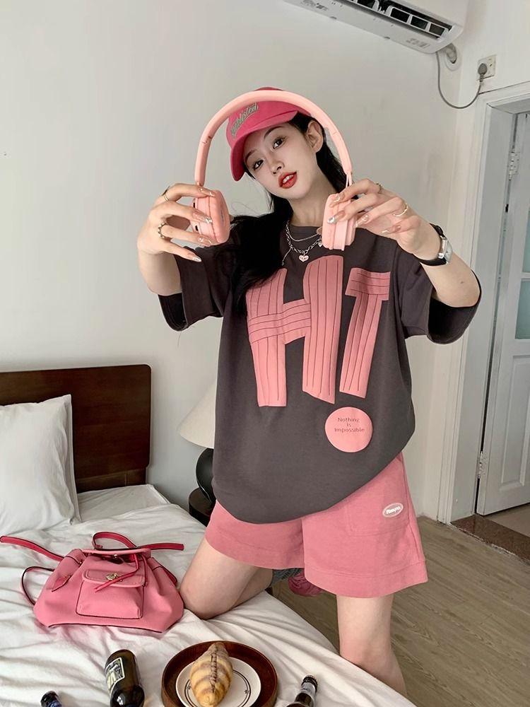 Verano 2024 Deportes Ocio Internet Popular Novedad Traje Mujer Pantalones Cortos Anchos Moda Estampado Manga Corta Conjunto Americano de Dos Piezas