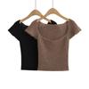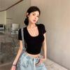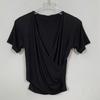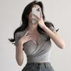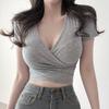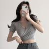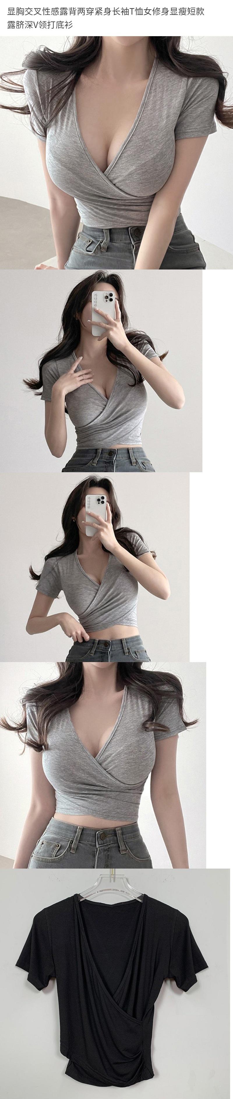 Top escotado que revela el pecho, espalda cruzada descubierta, dos formas de uso, ajustado, manga corta, tipo T, entallado, adelgazante, corto, ombligo, escote en V profundo, camisa base