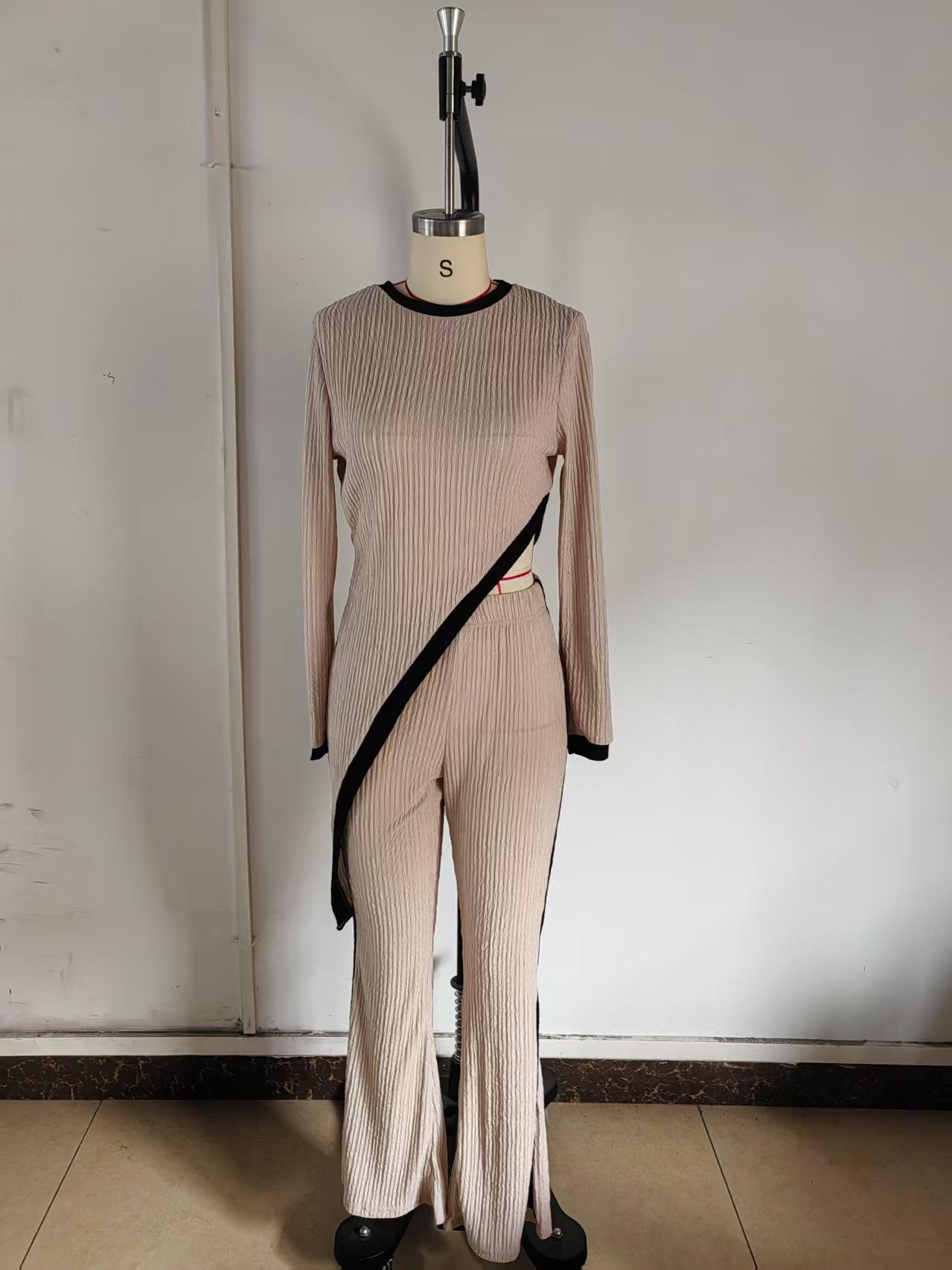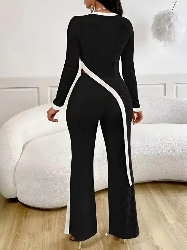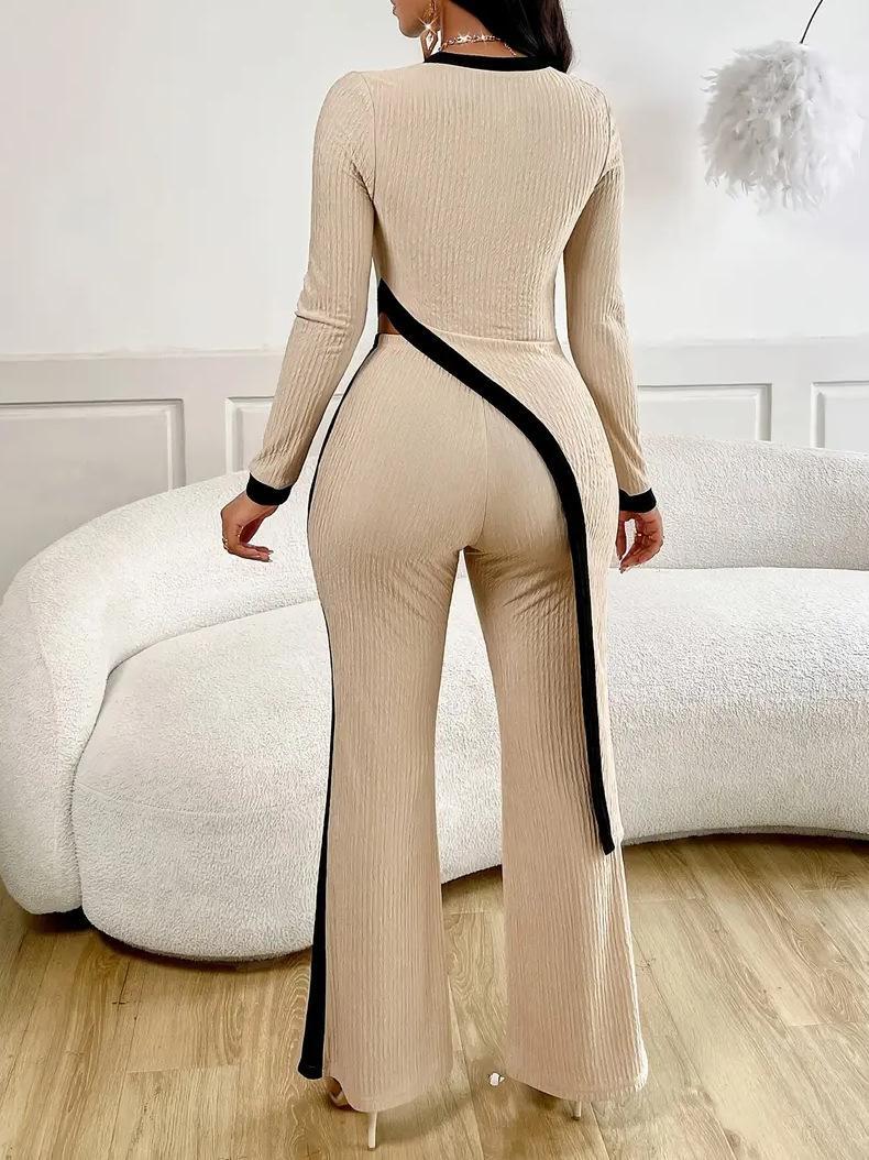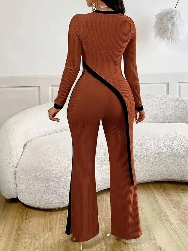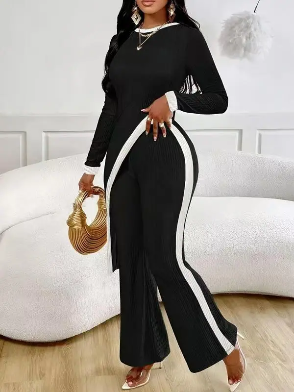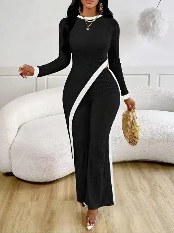 Europa y Estados Unidos Amazon 2025 otoño transfronterizo nueva moda para mujer manga larga contraste de color abertura camiseta costuras pantalones mujer