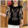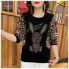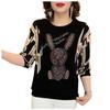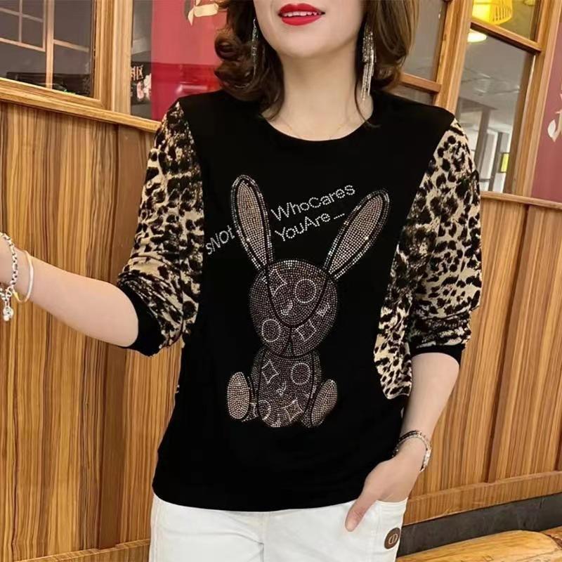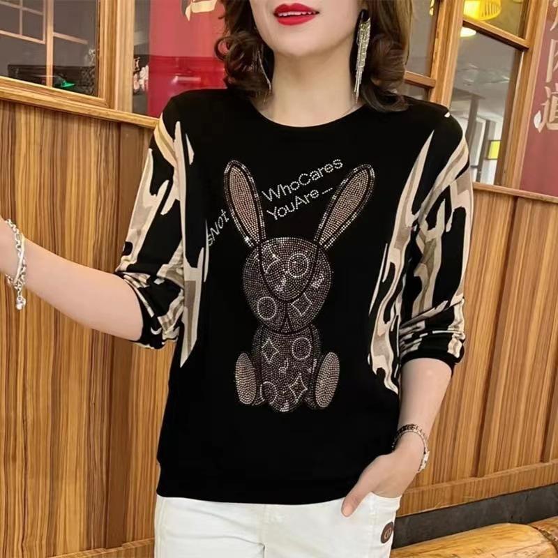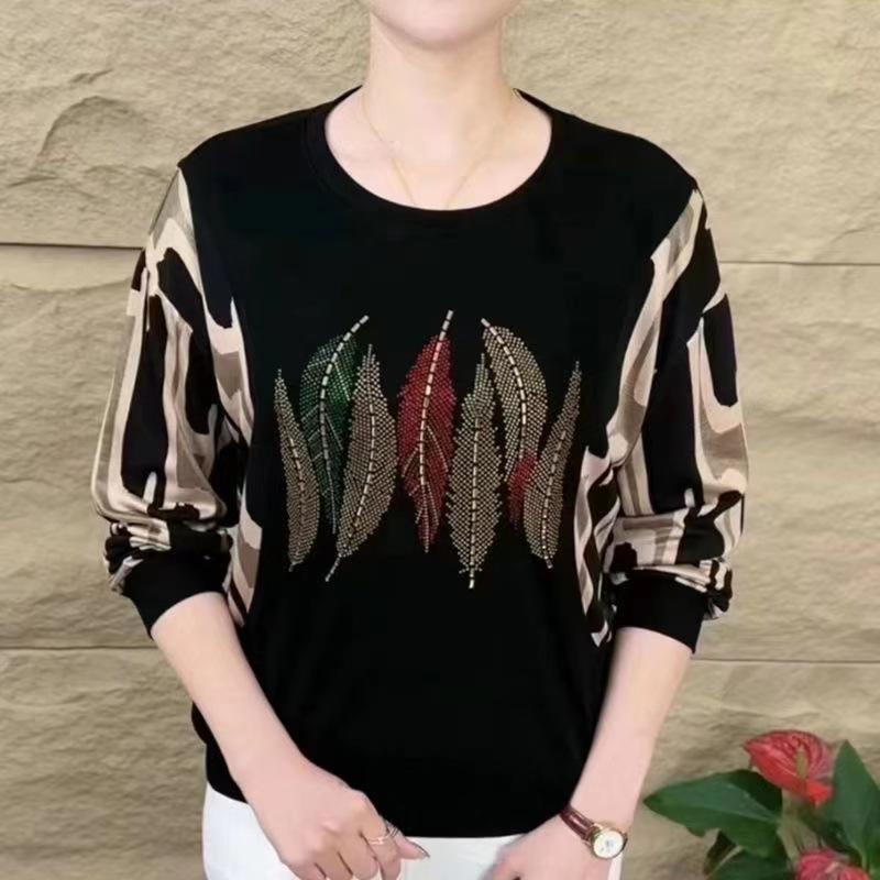 Camiseta de manga larga para mujer, cuello redondo, diseño de diamante, nuevo estilo para primavera y otoño, corte holgado para mamás, cubre vientre, efecto estilizador, tops de moda para mujeres de mediana edad.