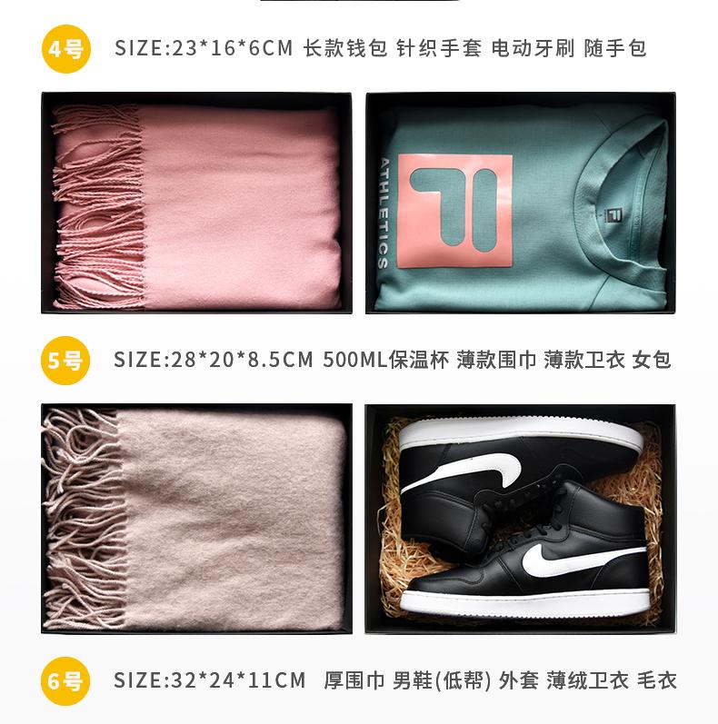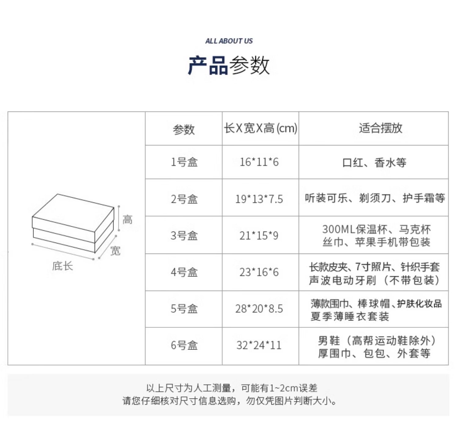 No. 1 16*11*6cm, No. 2 19*13*7.5cm, No. 3 21*15*9cm, No. 4 23*16*6cm, No. 5 28*20*8.5cm, No. 6 32*24*11cm