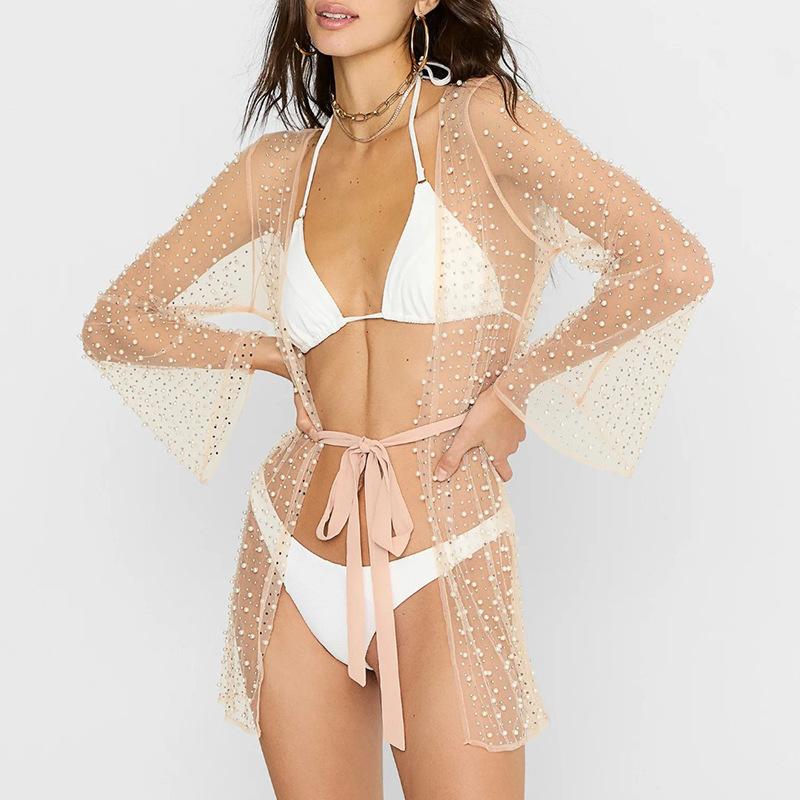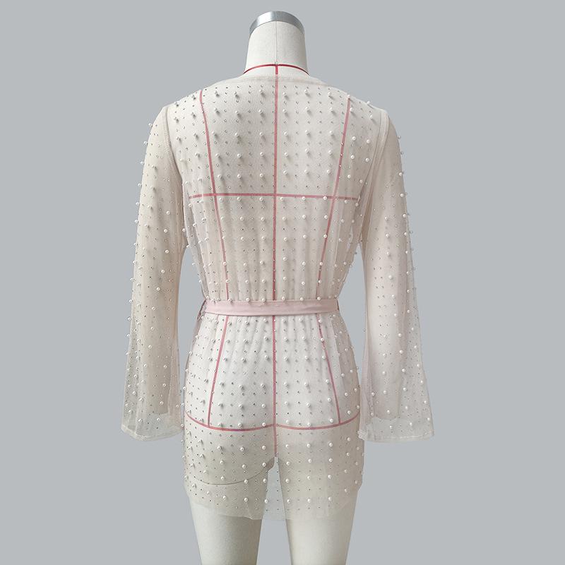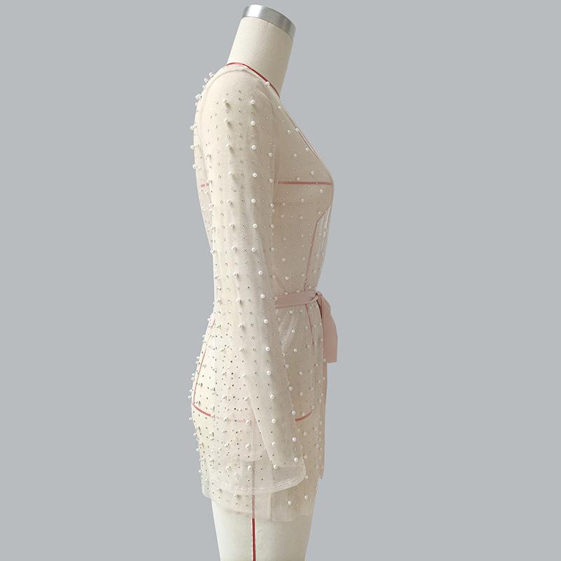 Europa y Estados Unidos nueva perspectiva sexy ropa interior mujeres brillantes diamante burbuja cuentas malla manga de cuerno playa falda cárdigan cinturón vestido