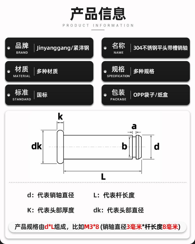 Pasador de cabeza plana ranurado de acero inoxidable 304, pasador de retención, pasador cilíndrico de posicionamiento, pasador de retención M3M4M5M6M8M10M12