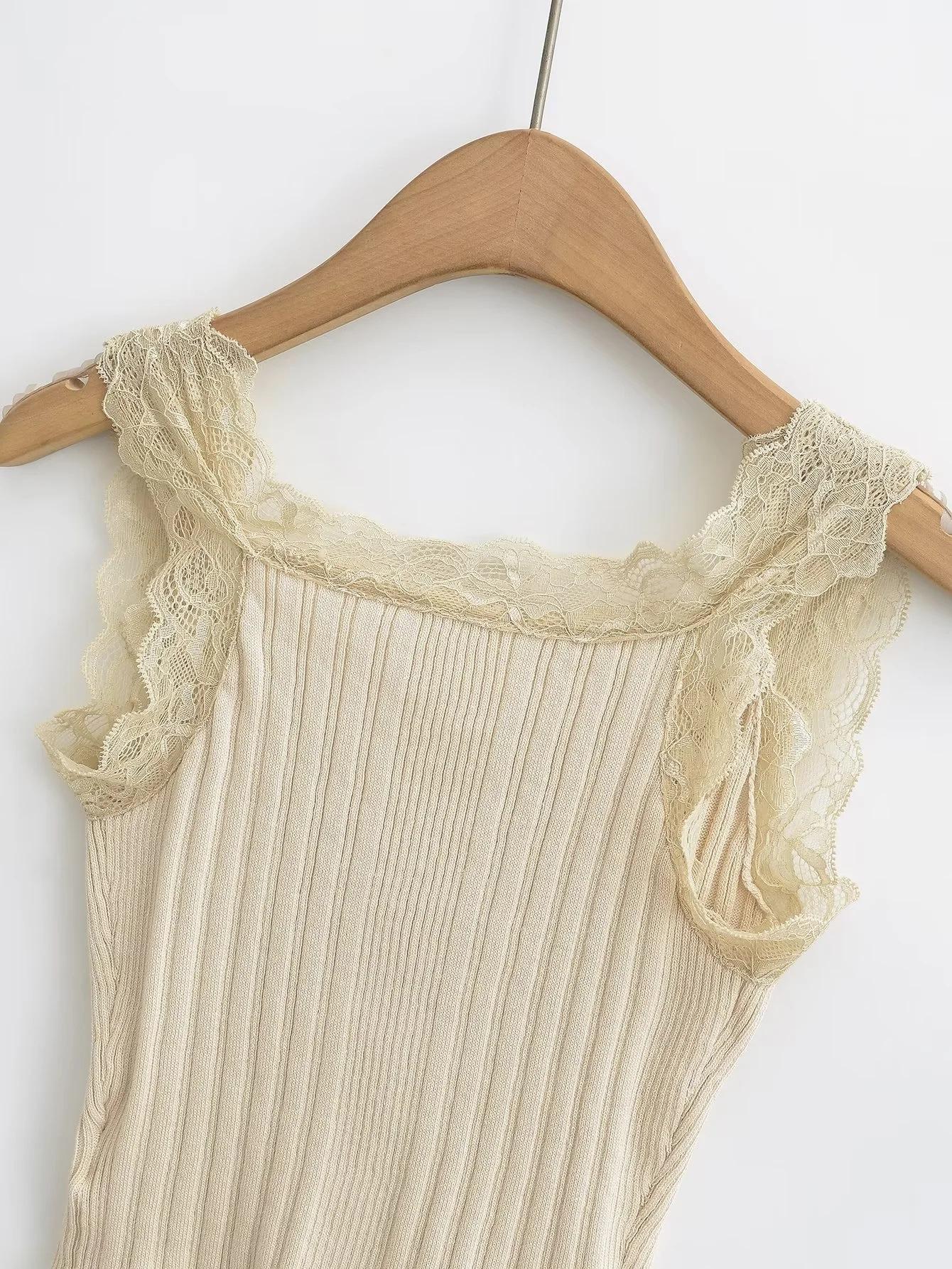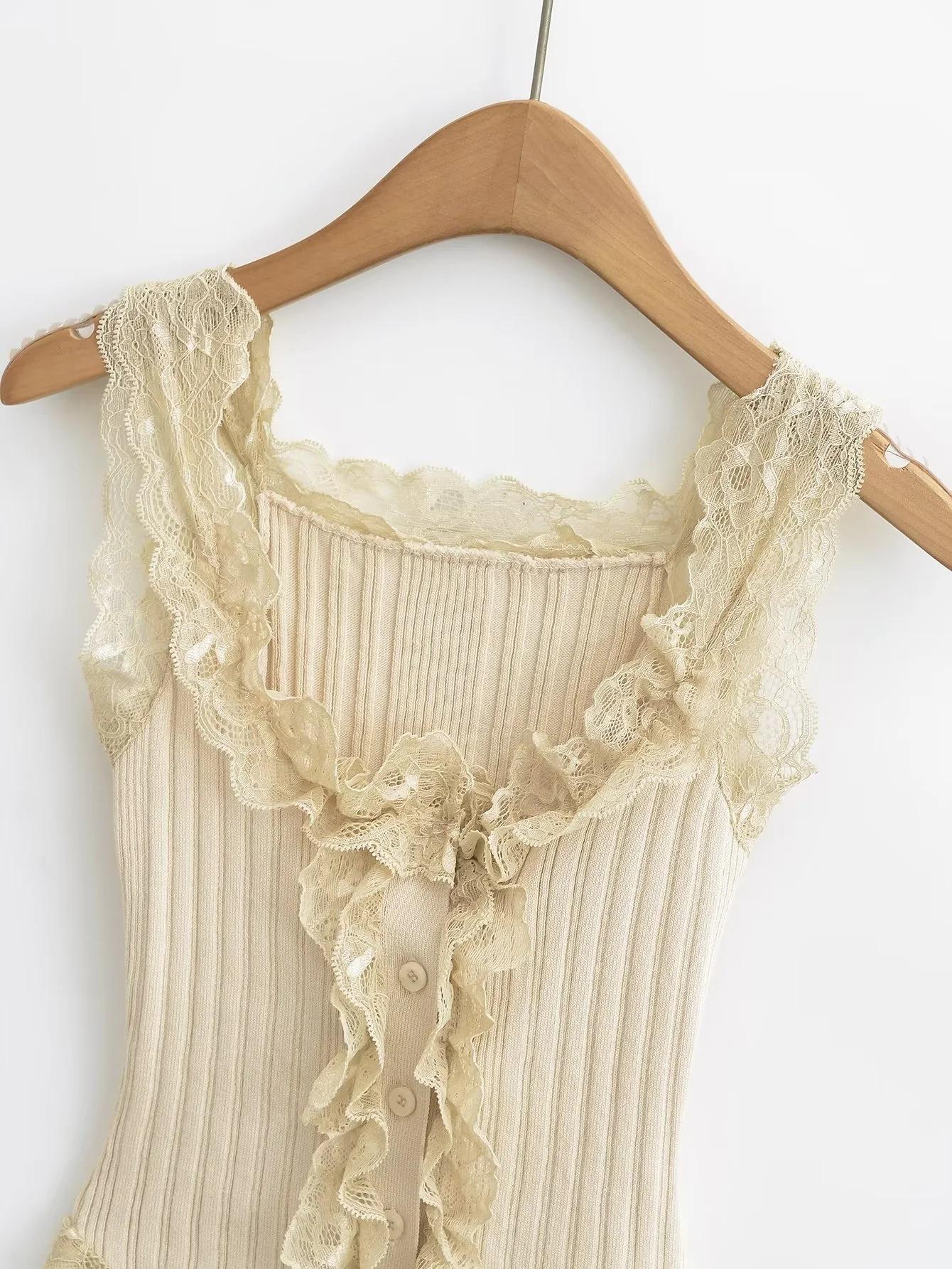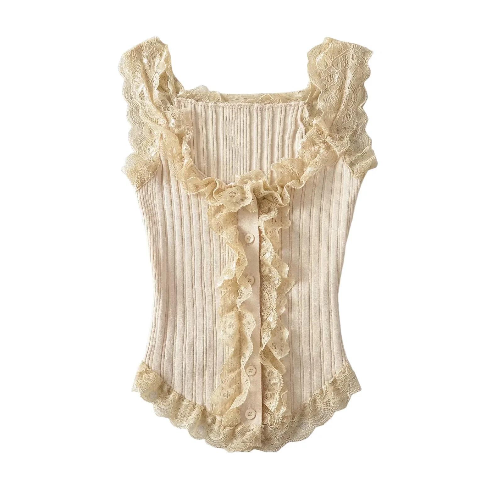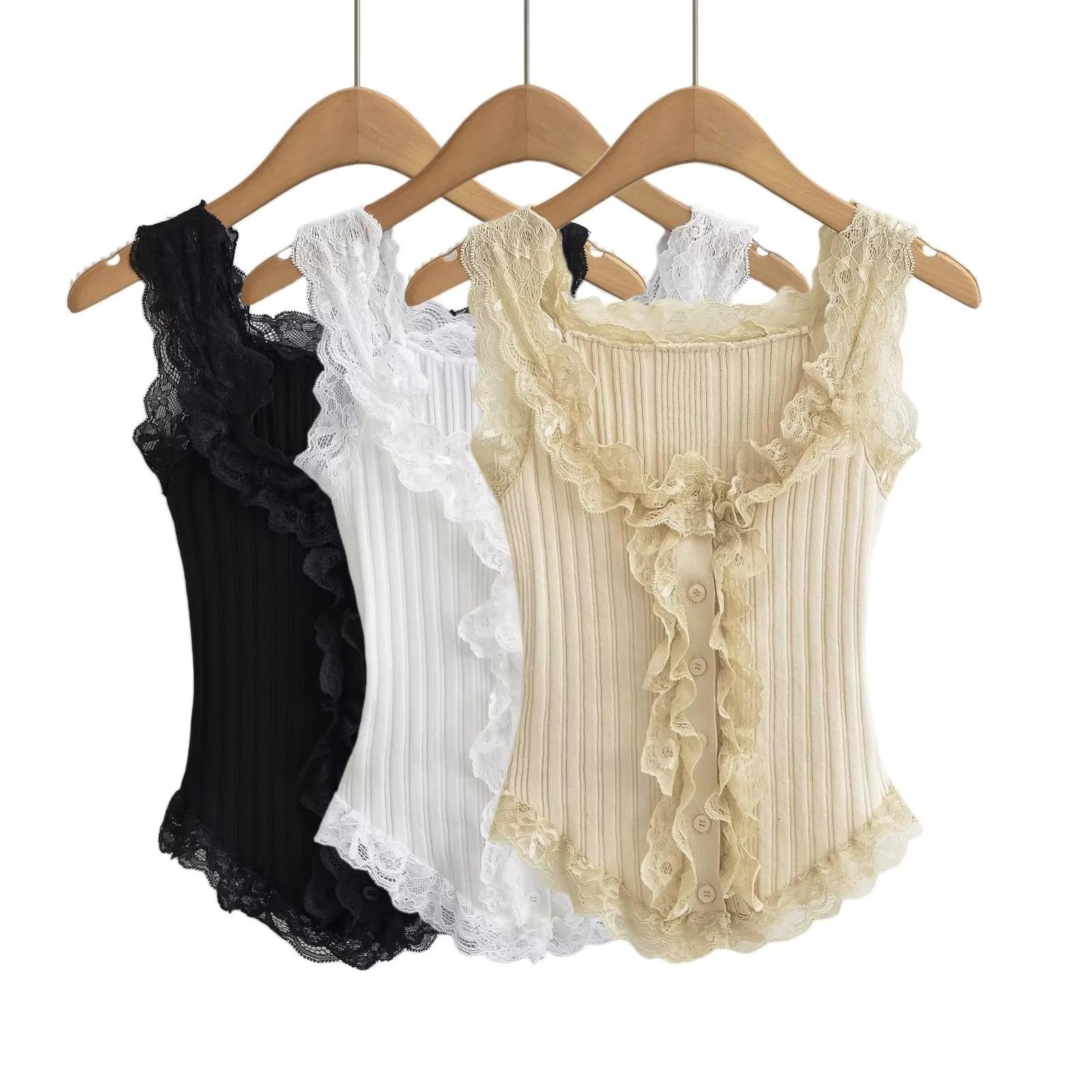 Chaleco sin mangas de encaje sexy de estilo dulce y picante de verano 2024 para mujer, nuevo estilo de deseo puro, top de punto con tiras interiores