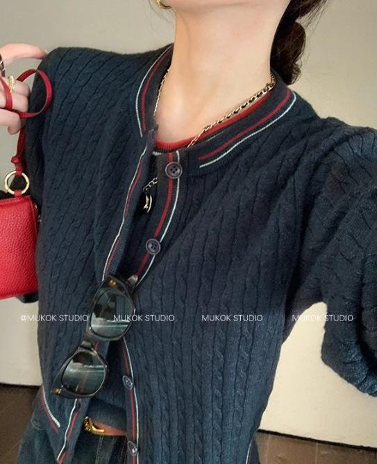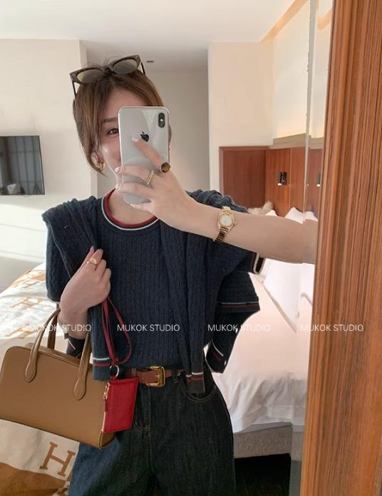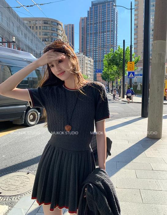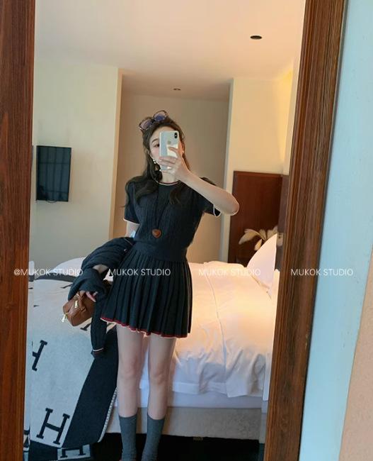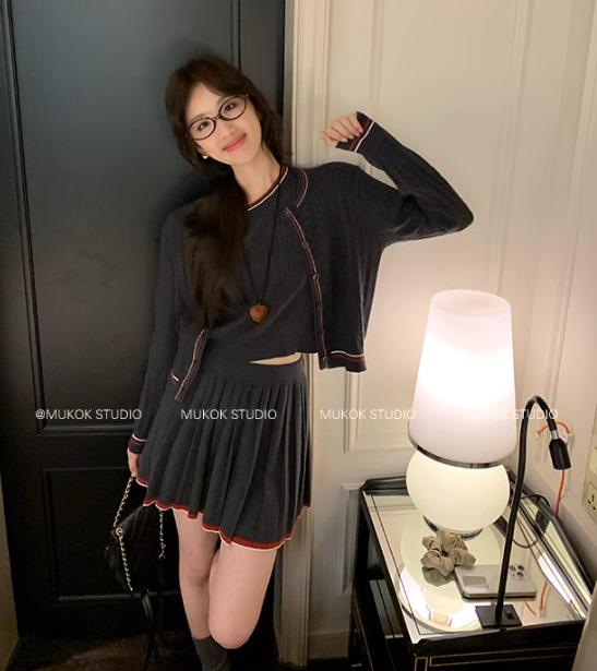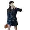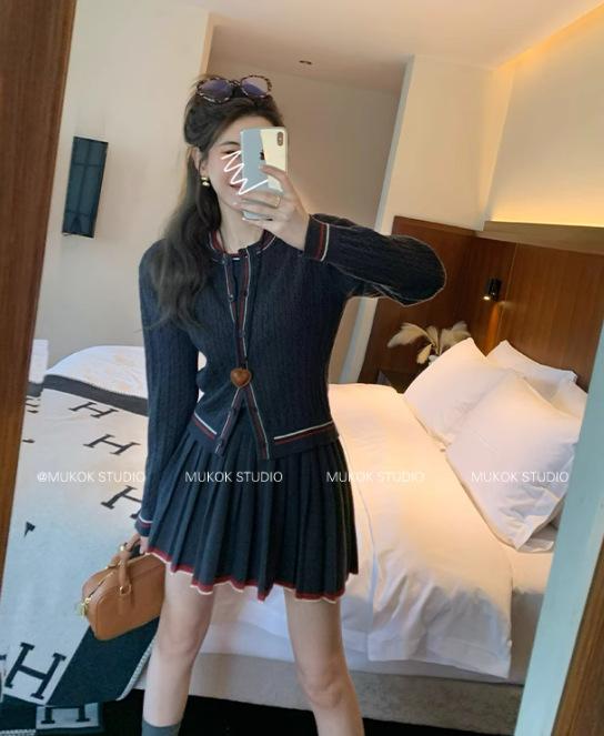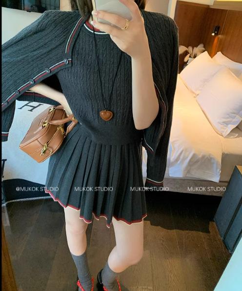 Cárdigan de punto de diseño con estilo preppy intelectual de otoño 2025 + falda plisada traje de tres piezas que reduce la edad