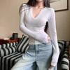 Camiseta básica con cuello en V para mujer, top ajustado de manga larga para otoño e invierno, nueva camiseta de algodón con hilo, camisa adelgazante de estilo europeo y estilo occidental.