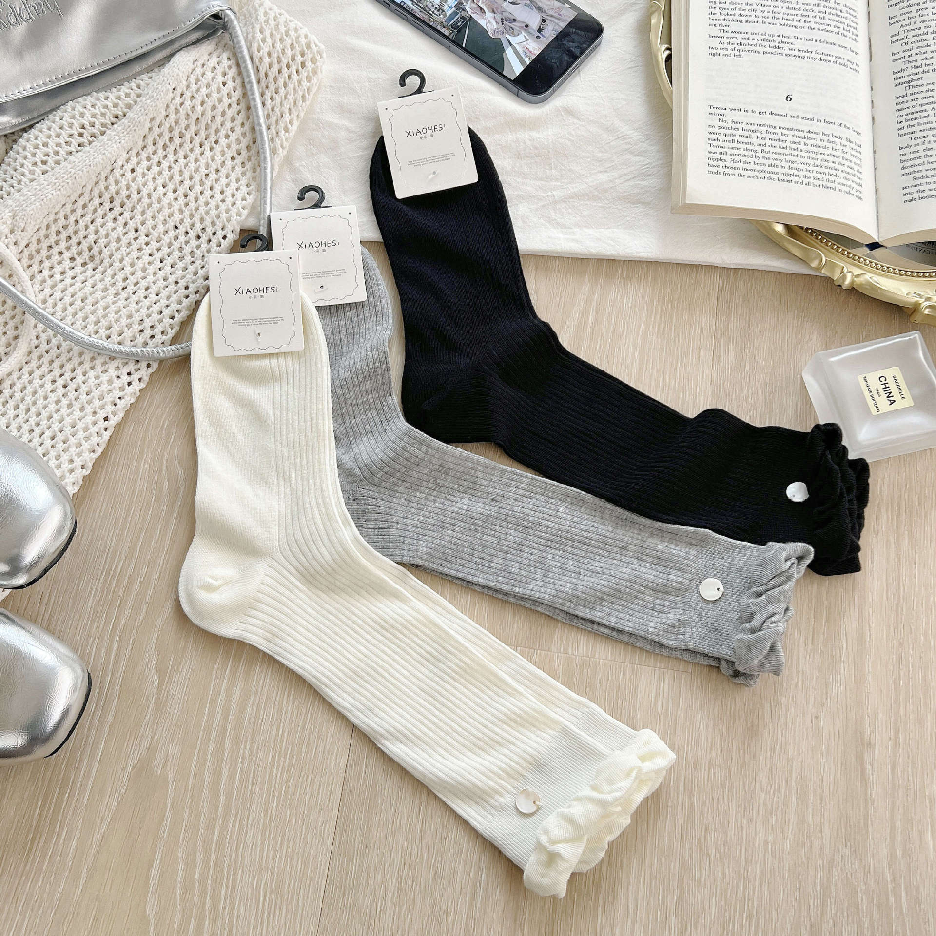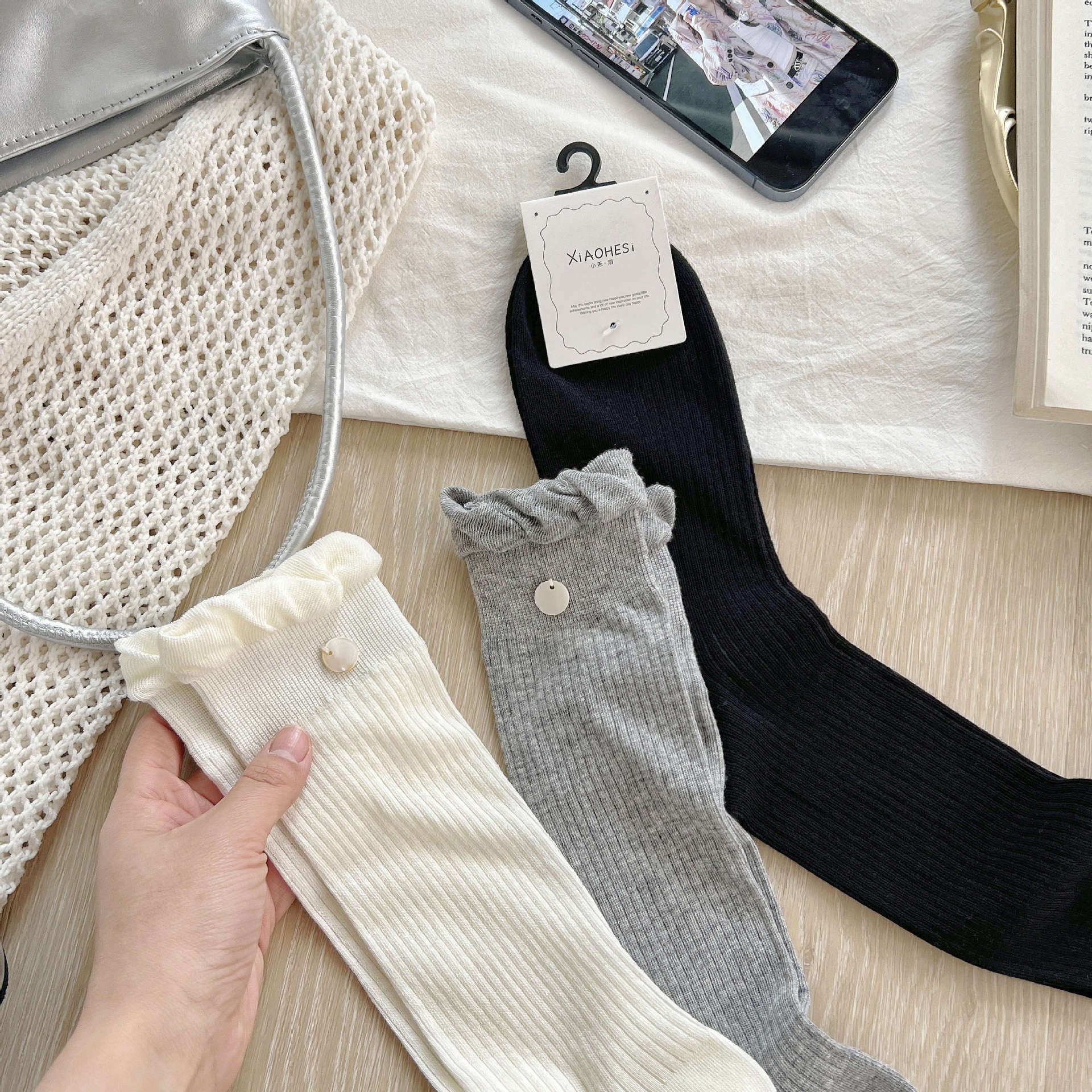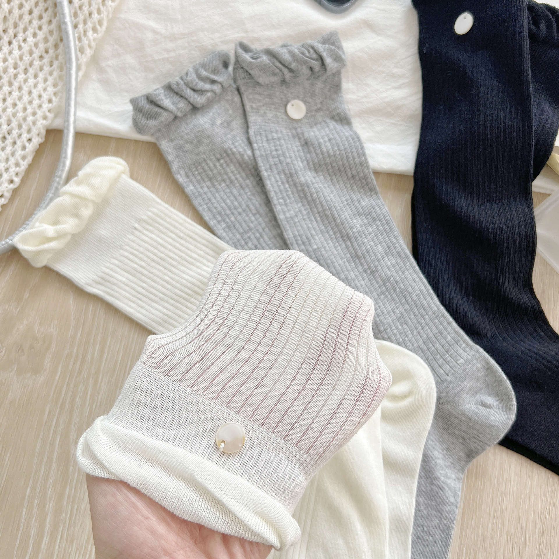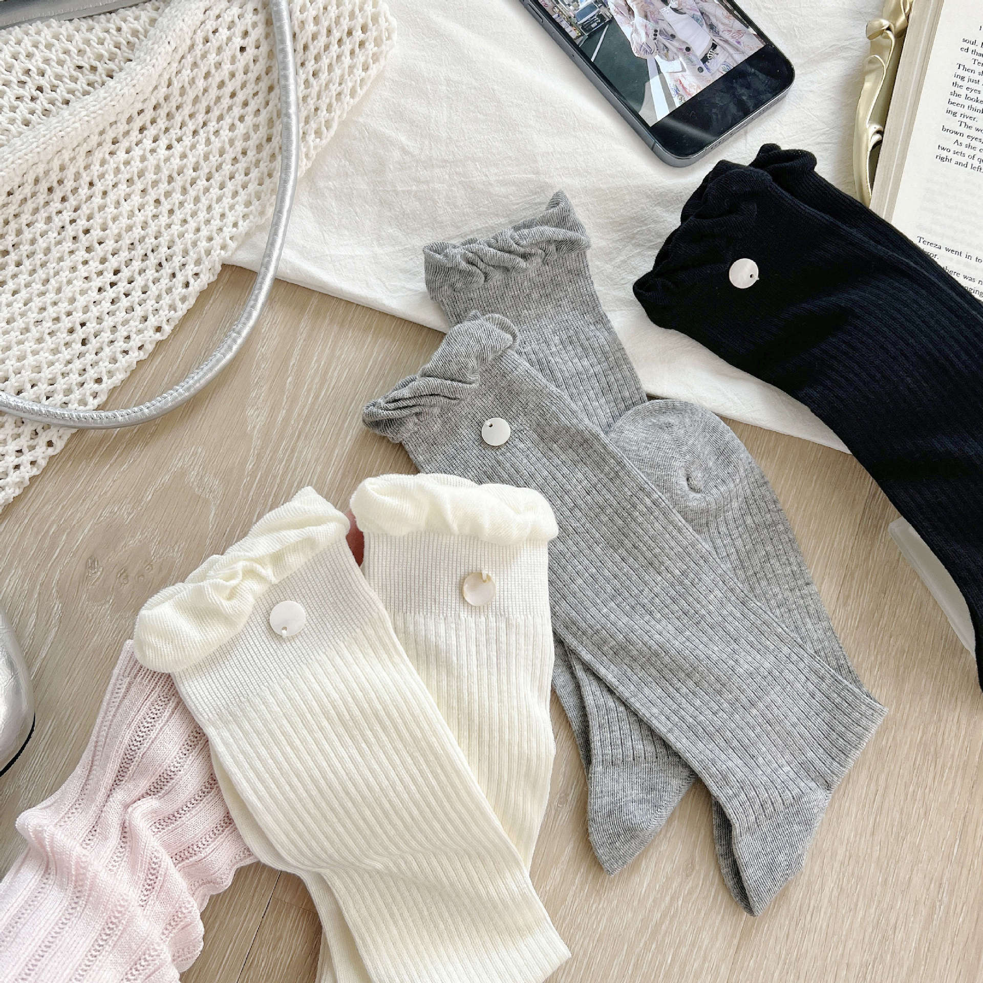 Calcetines de primavera y verano, nuevos calcetines blancos con botones de concha, calcetines decorativos de color liso para mujer, calcetines de algodón estilo academia, calcetines de tubo medio para niña.