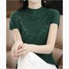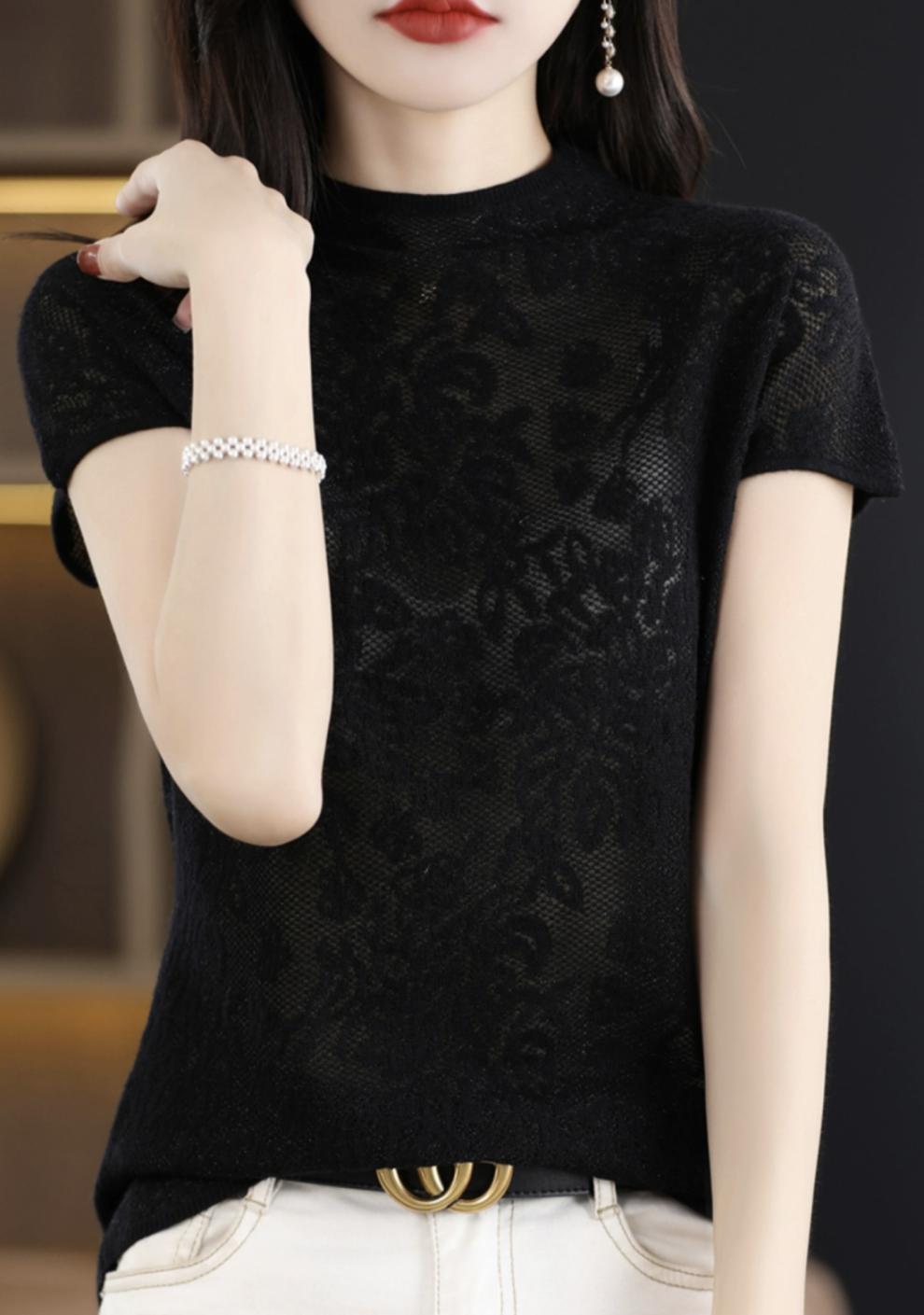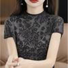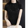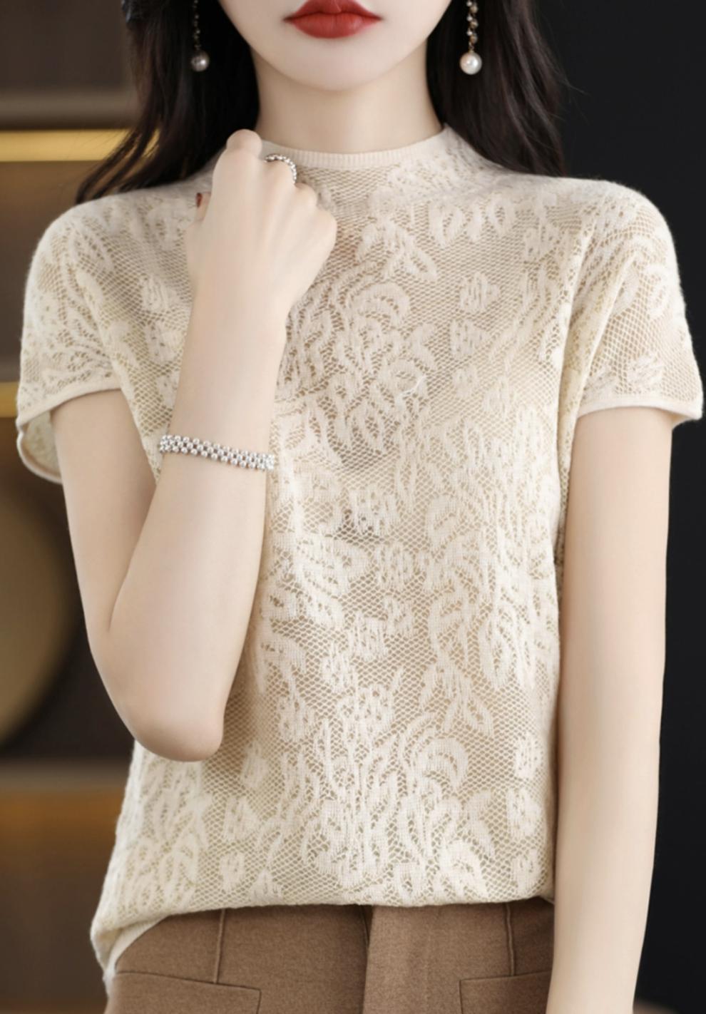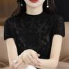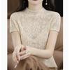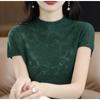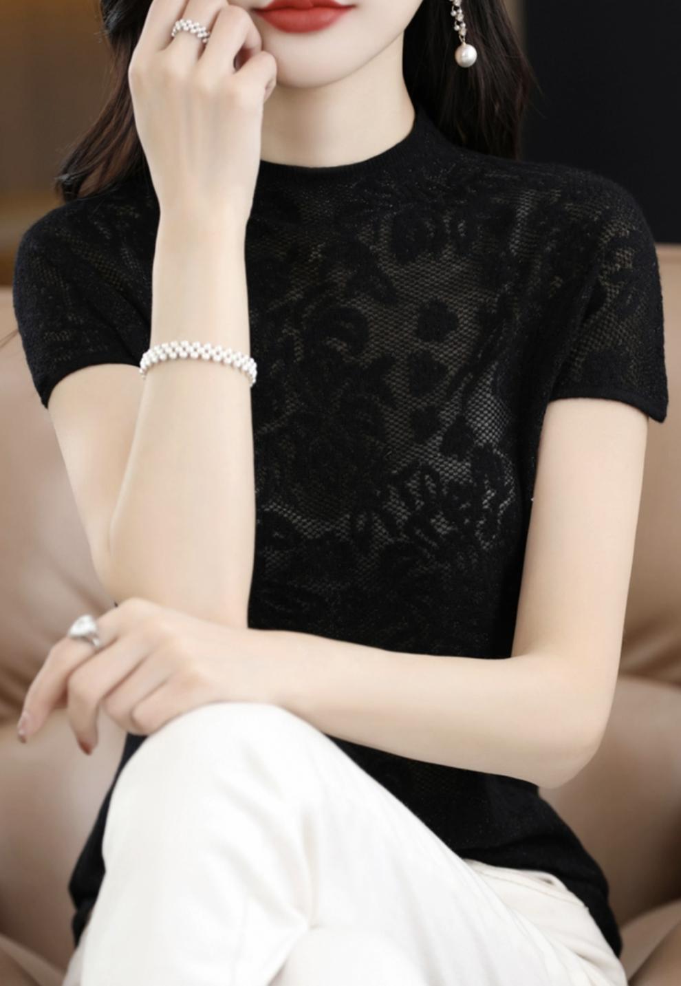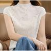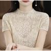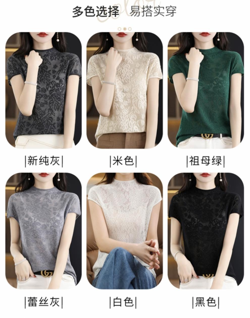 2025 Verano Nuevo Estilo Coreano Encaje Tejido Manga Corta Mujer Cuello Medio Alto Calado Versátil Adelgazante Manga Media Camiseta Top Trendy
