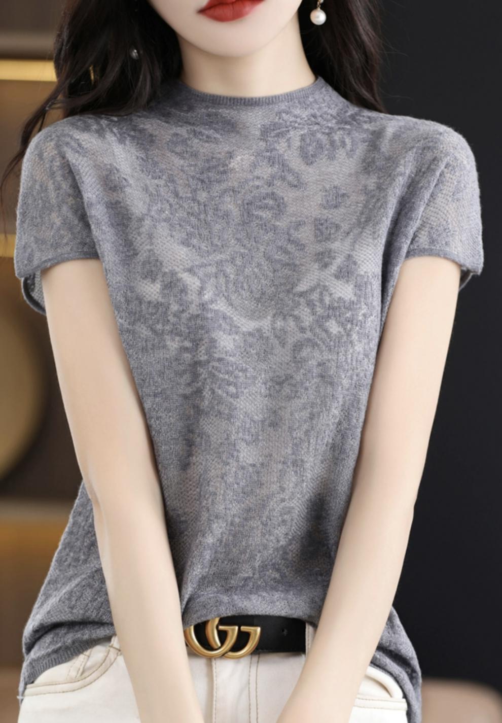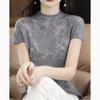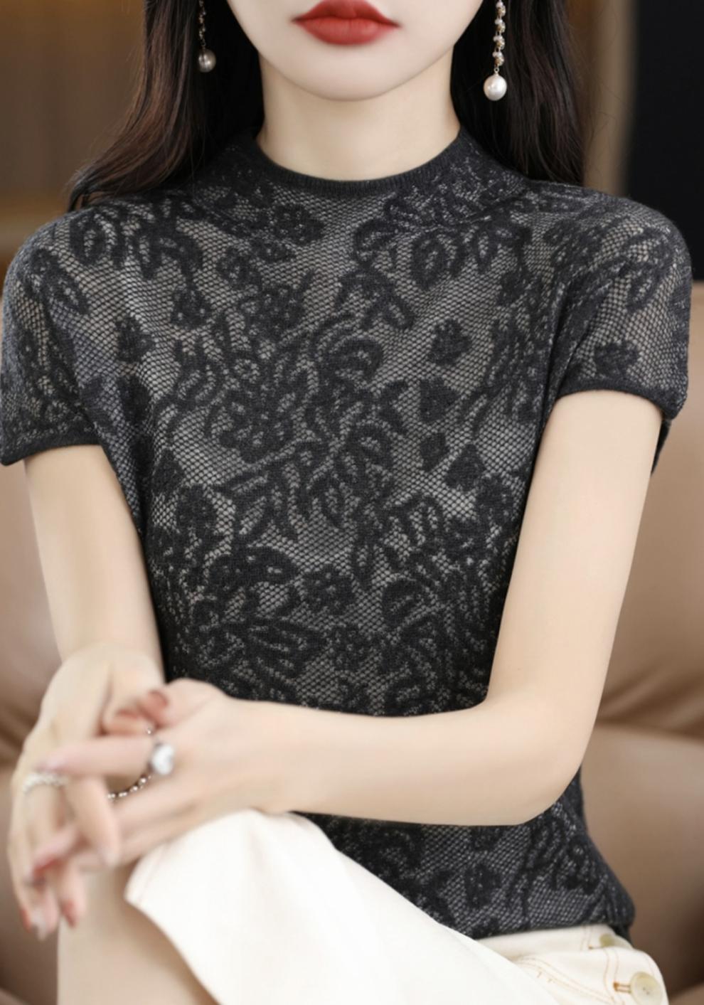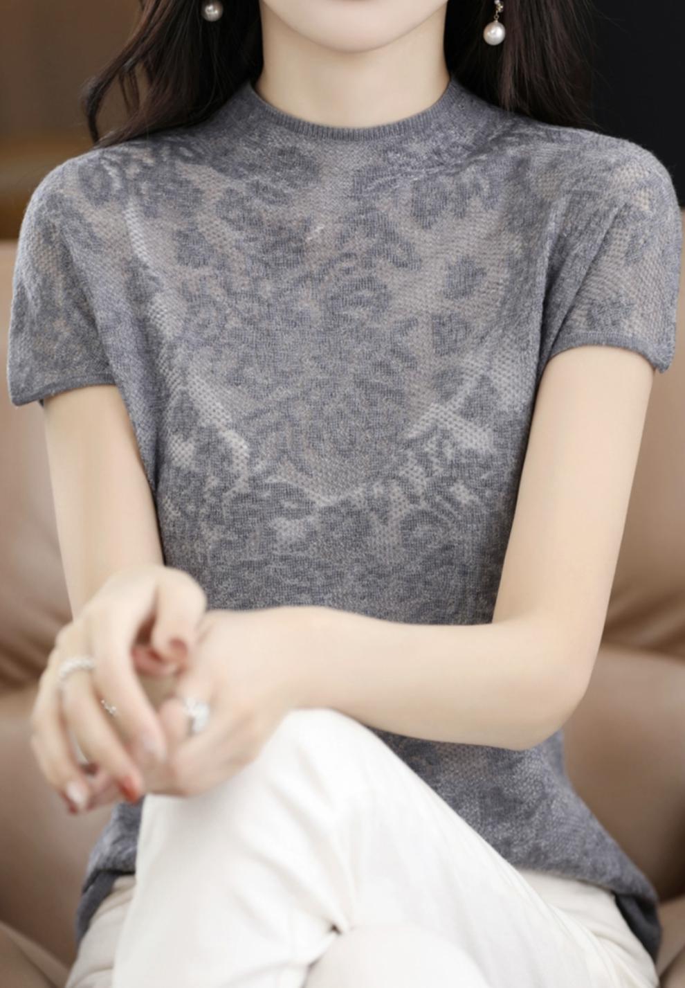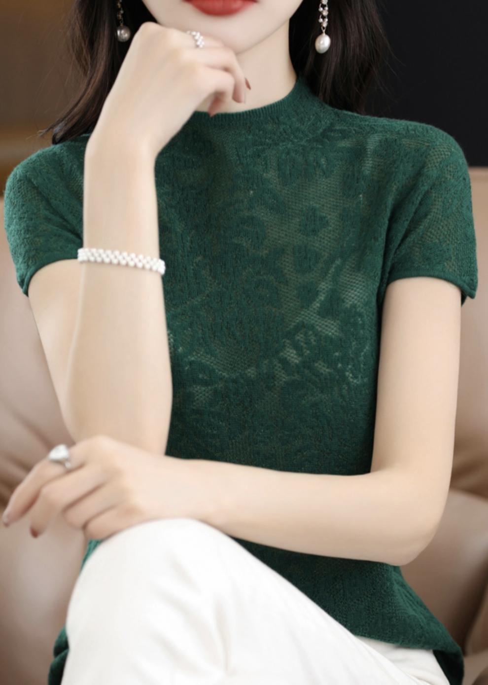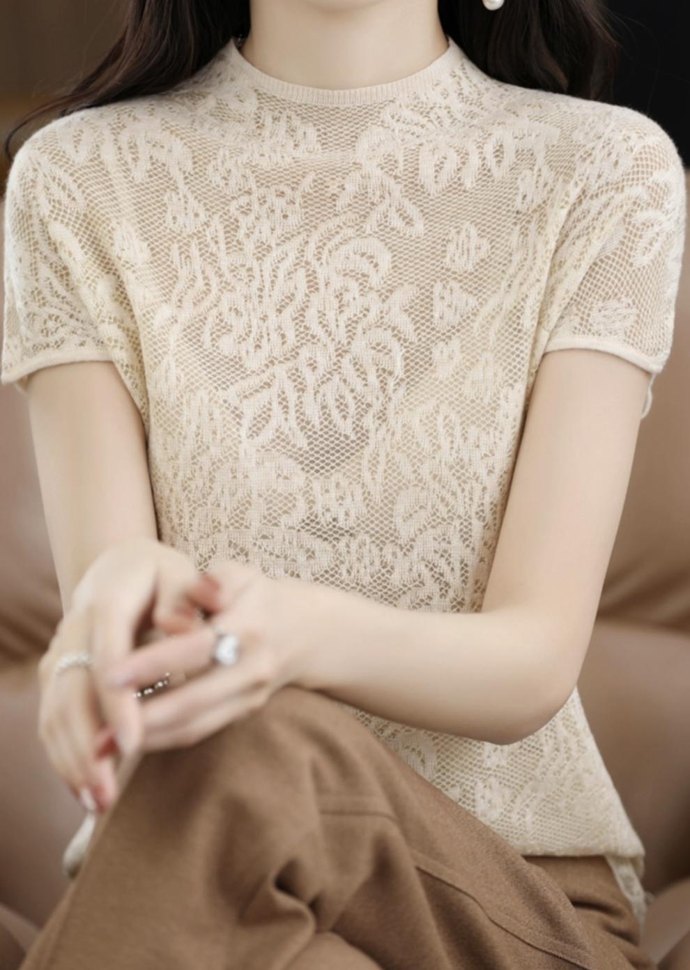 2025 Verano Nuevo Estilo Coreano Encaje Tejido Manga Corta Mujer Cuello Medio Alto Calado Versátil Adelgazante Manga Media Camiseta Top Trendy