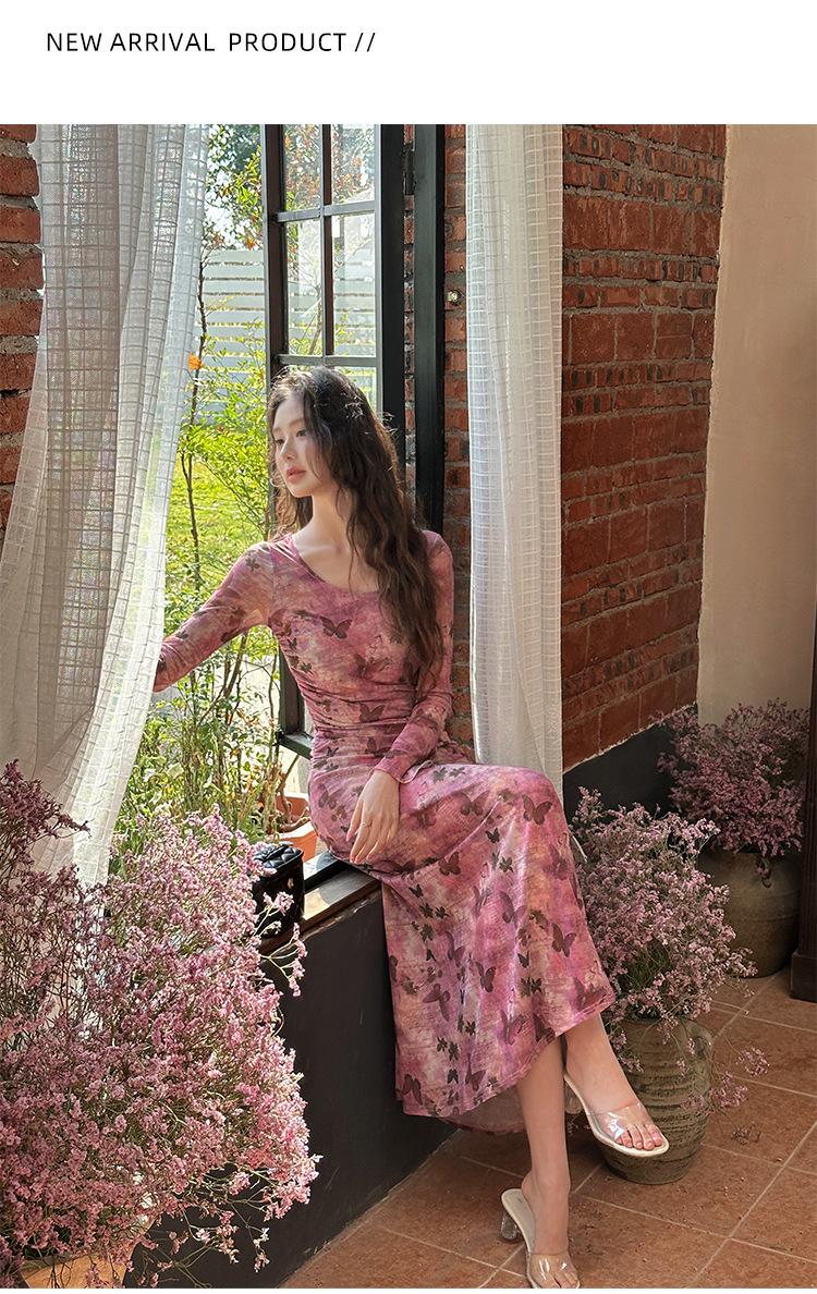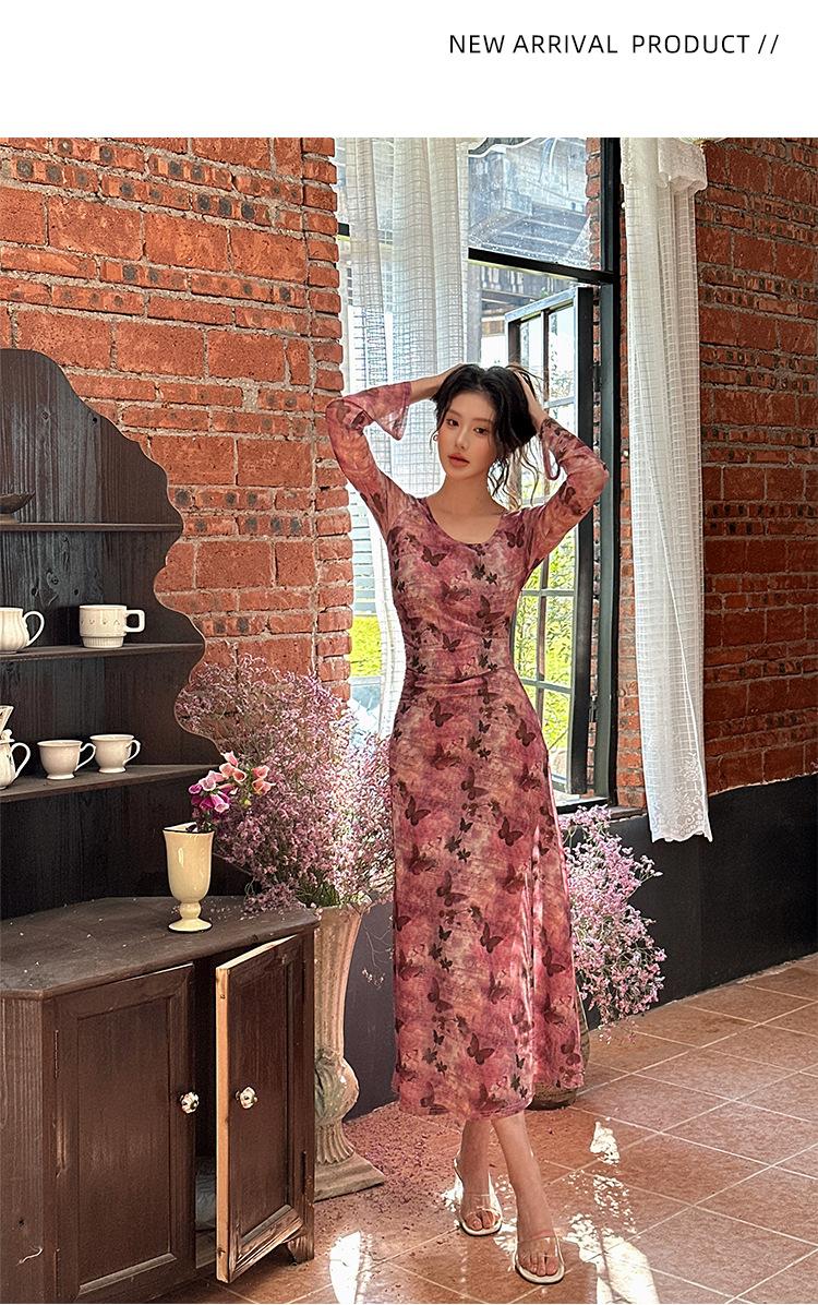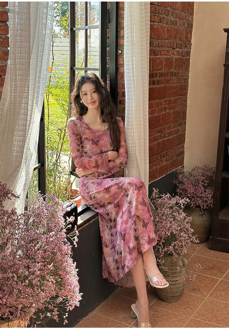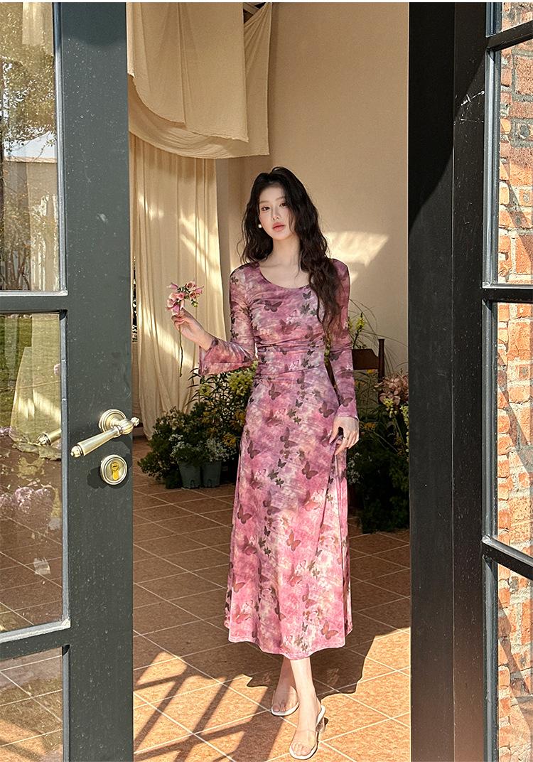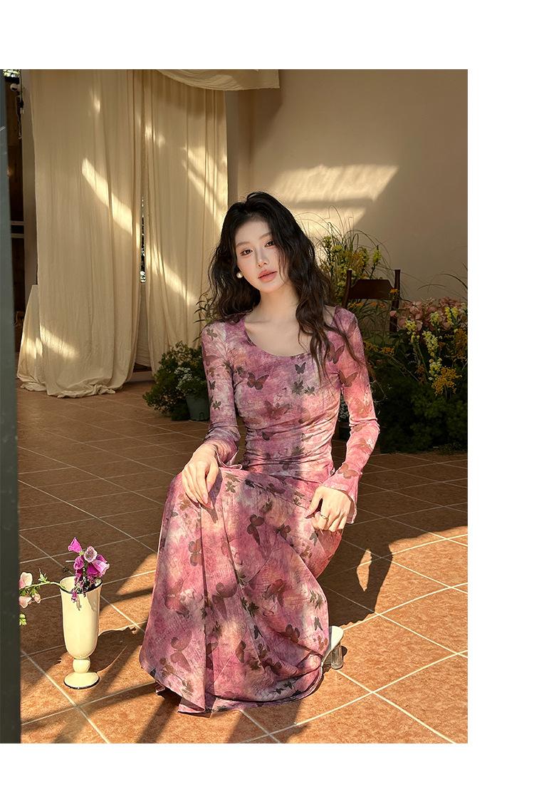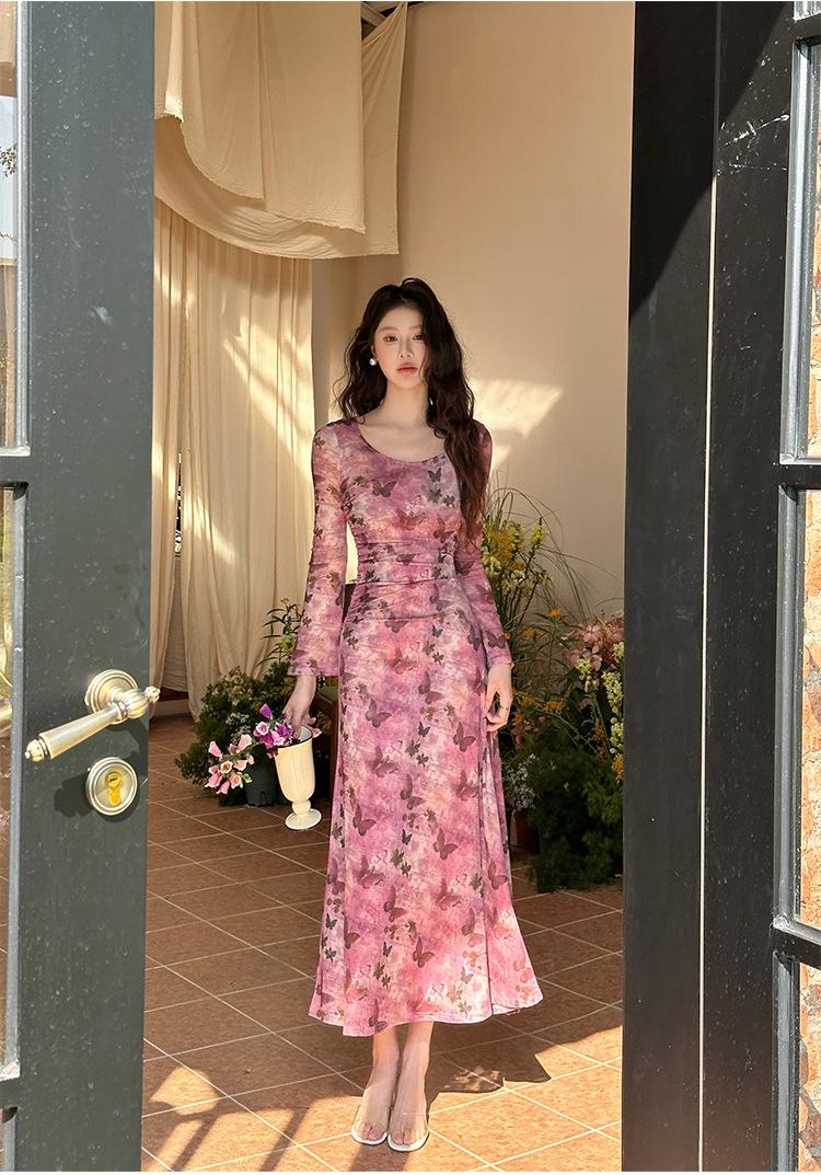 Vestido estilo francés retro elegante que reduce la edad y es elegante para niña, de malla y gasa con estampado de mariposas, vestido de cola de pez, vestido para vacaciones en la playa