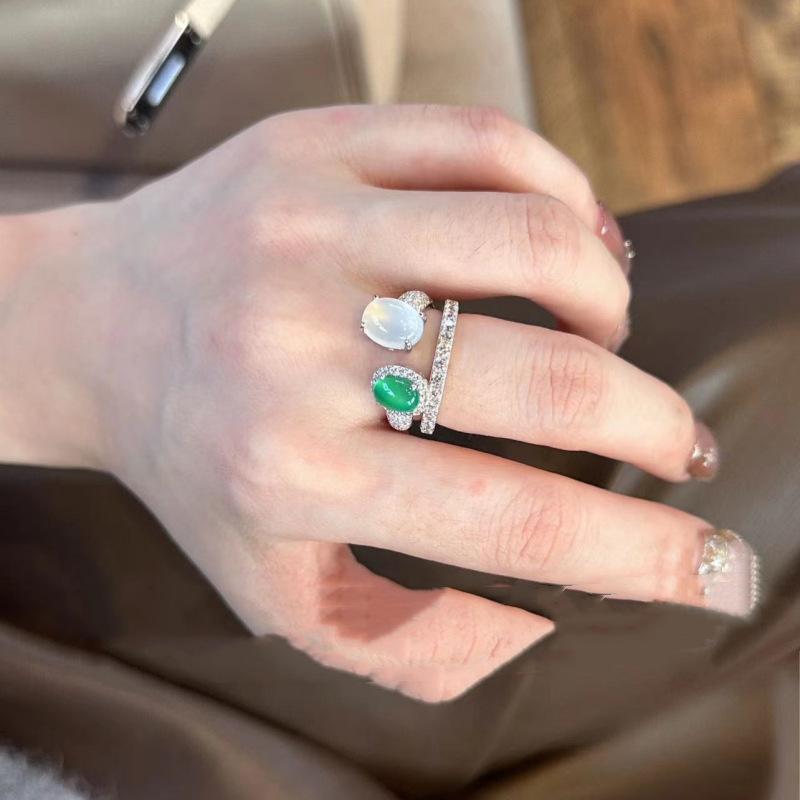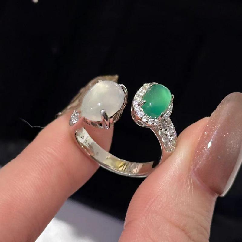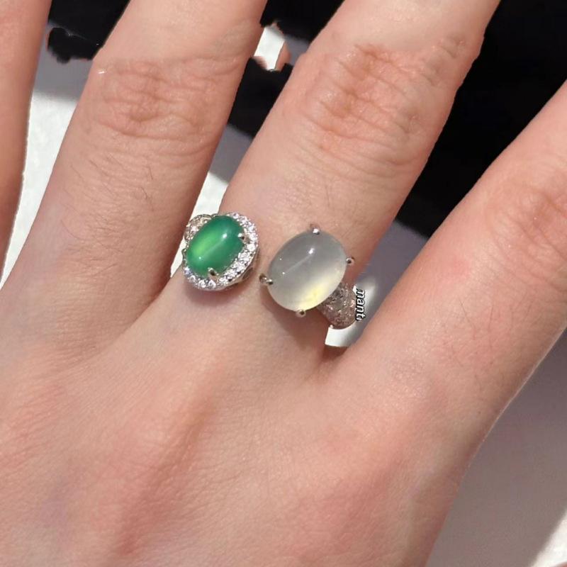 Nuevo anillo abierto de moda con forma de huevo de calcedonia verde blanca de estilo chino, de alta calidad, temperamento versátil, anillo del mismo estilo de celebridad de Internet