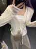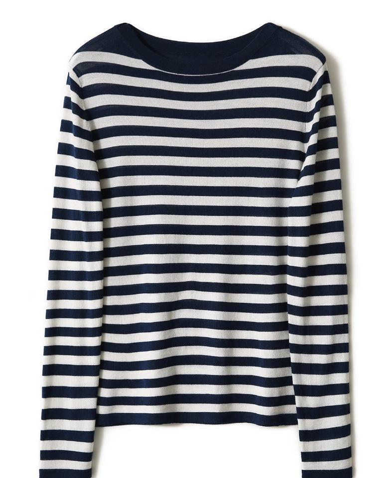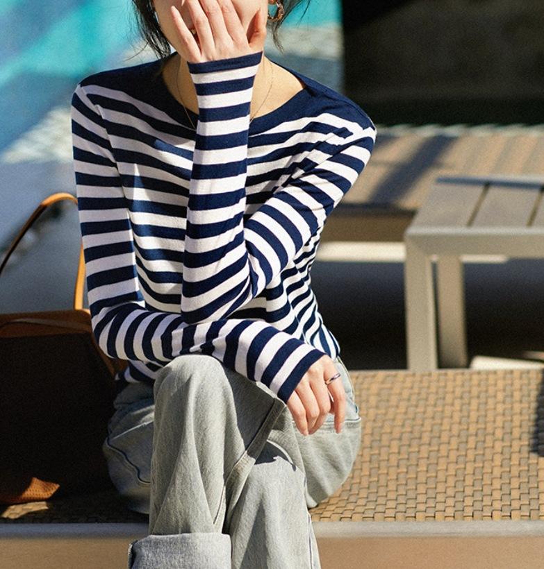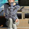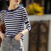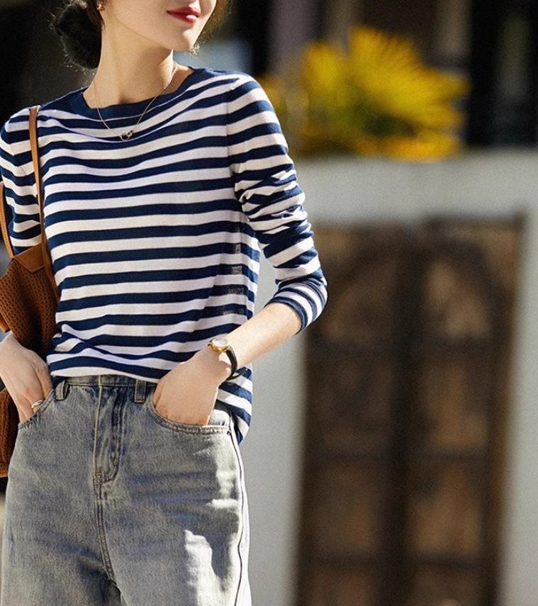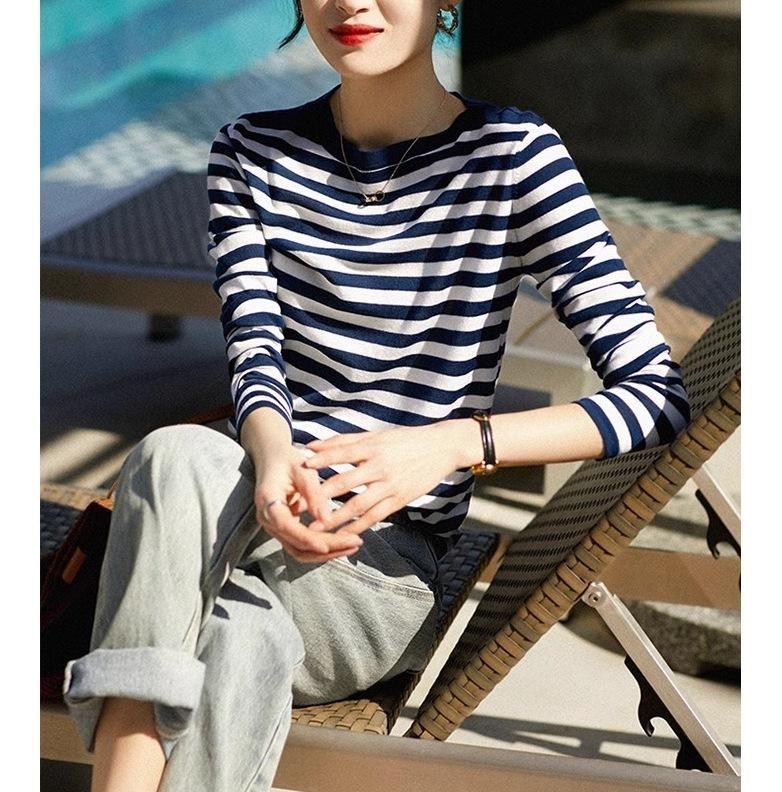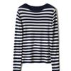 Camisa de lana fina de estilo japonés y coreano para primavera y otoño, camiseta holgada de manga larga con cuello interior elegante y base de punto a rayas para mujer