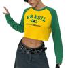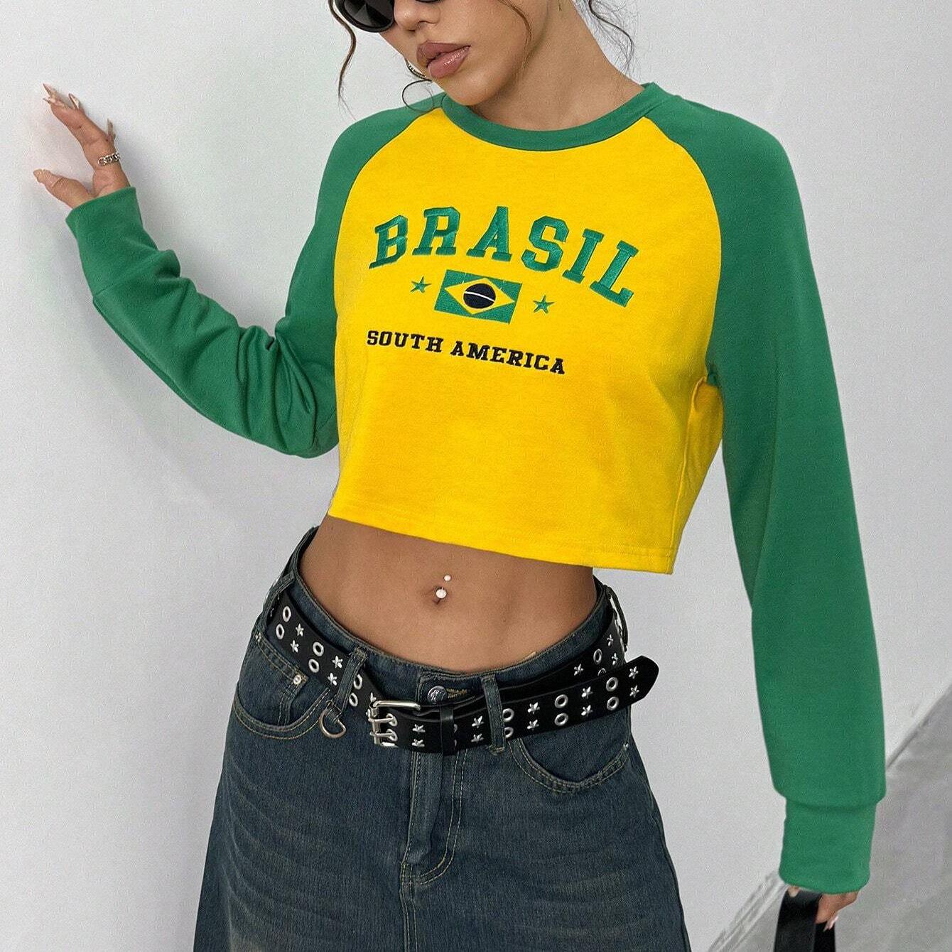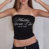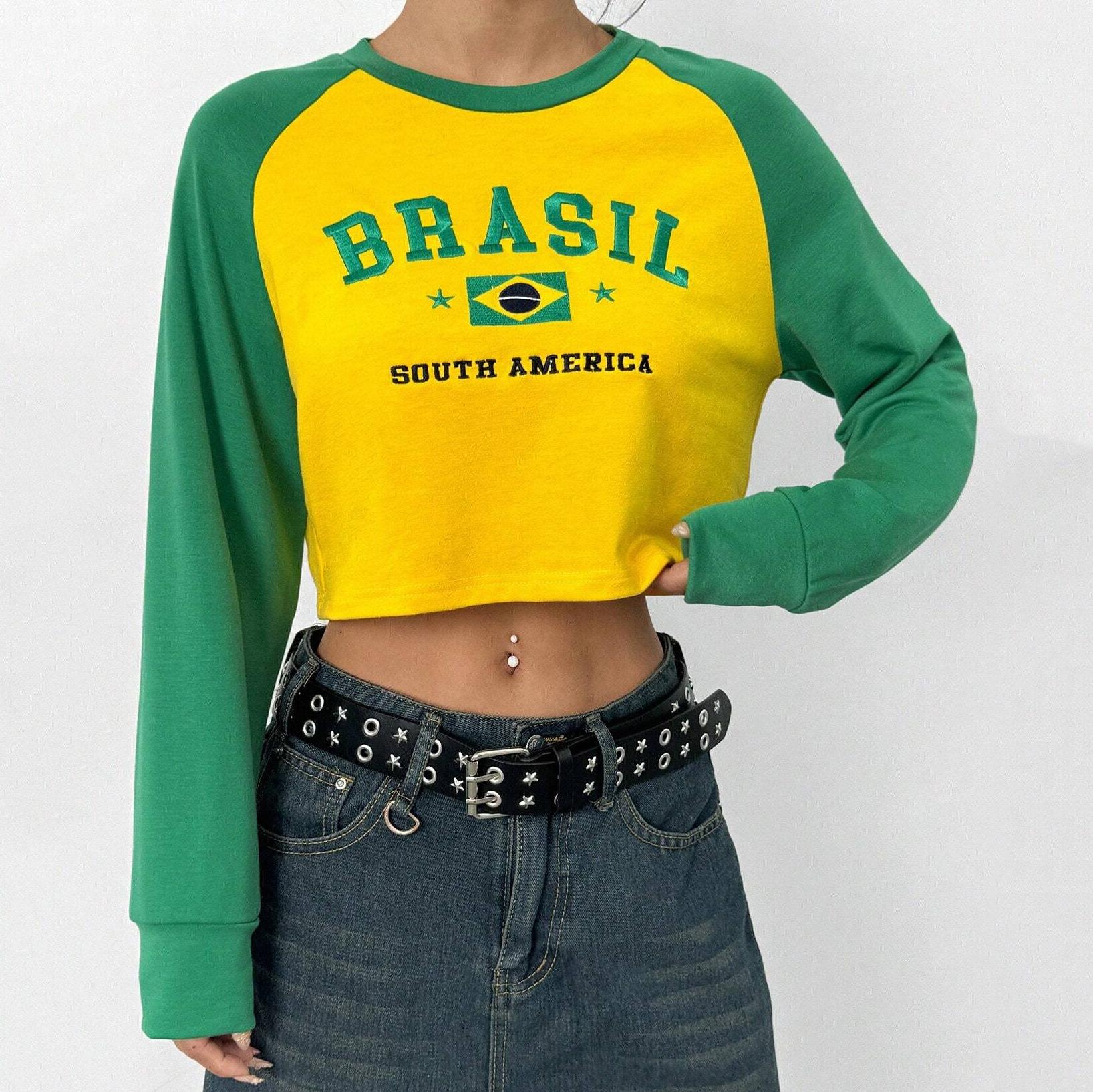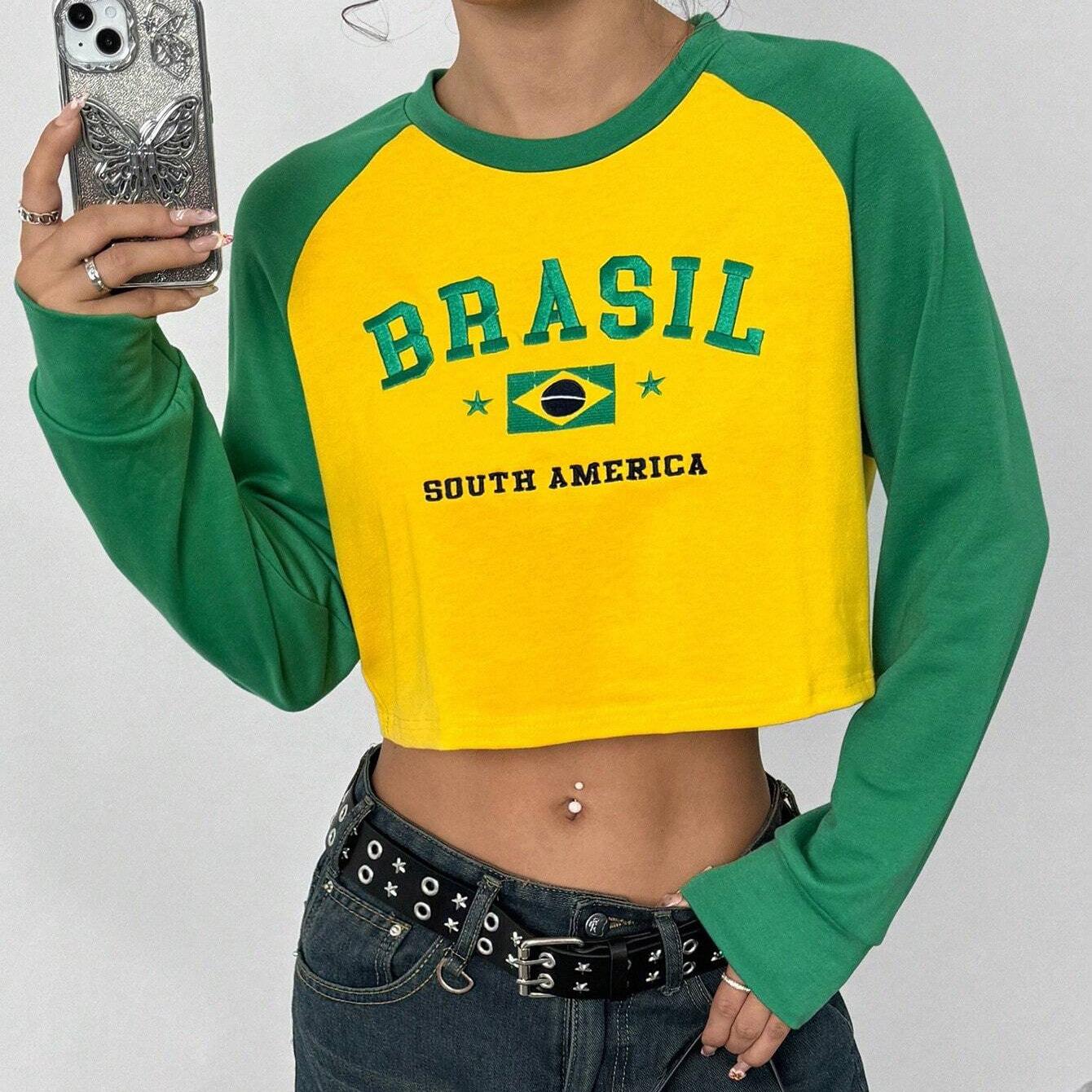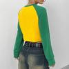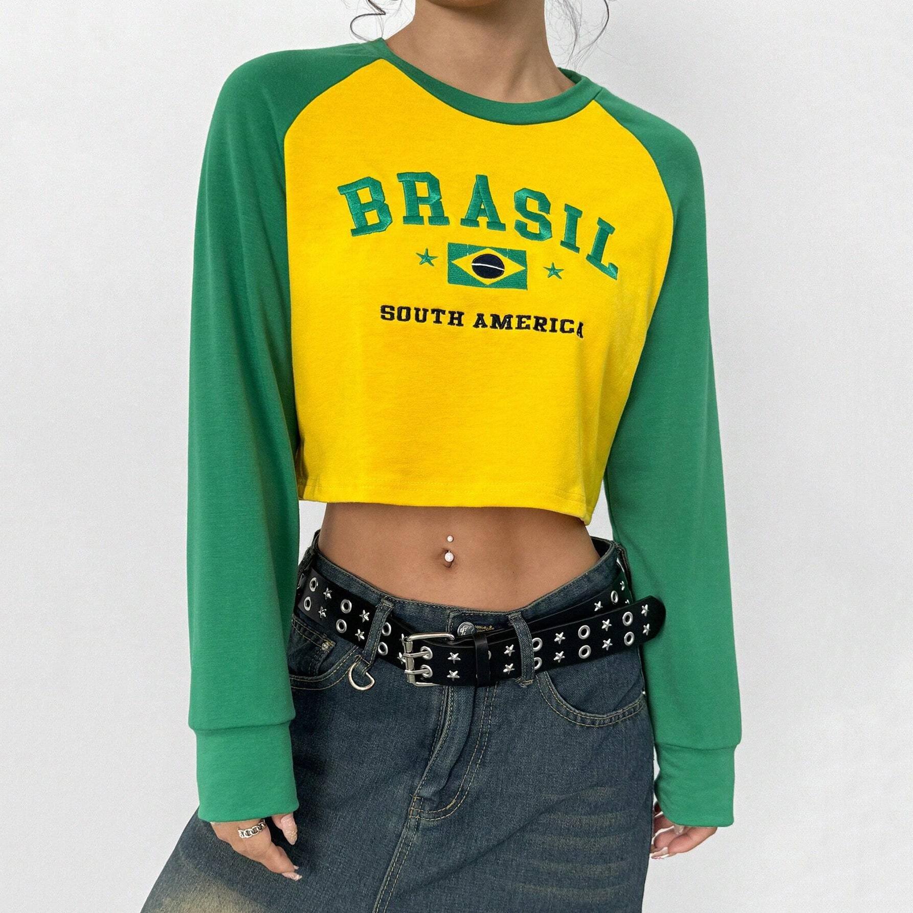 Camiseta de manga larga personalizada con hombros descubiertos, diseño transfronterizo europeo y americano, nueva camiseta de verano de 2024 con letras en contraste de color y cuello redondo.