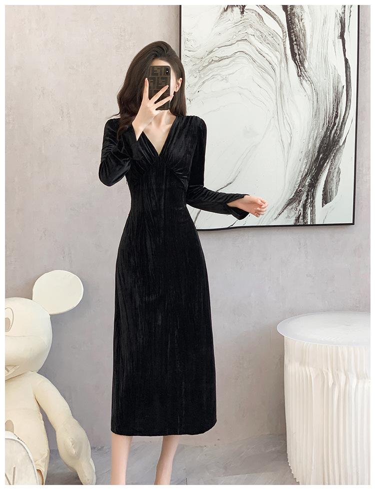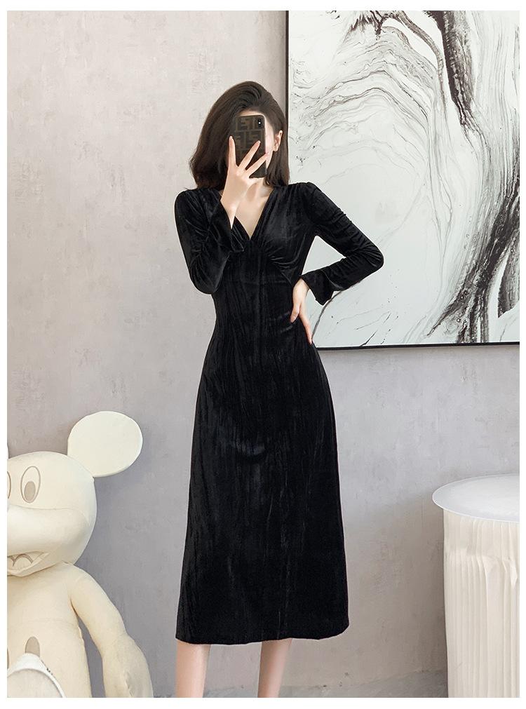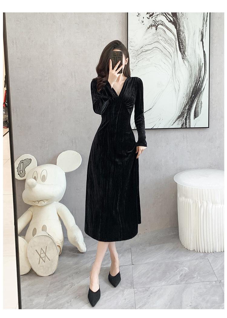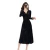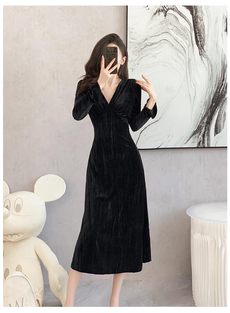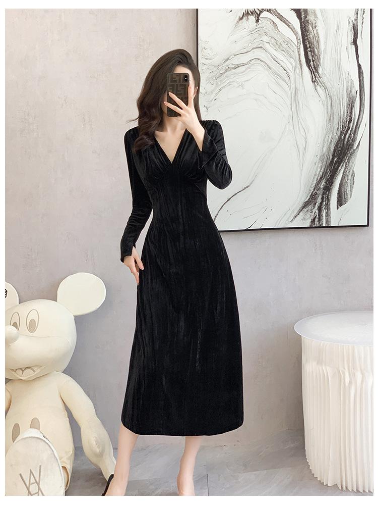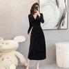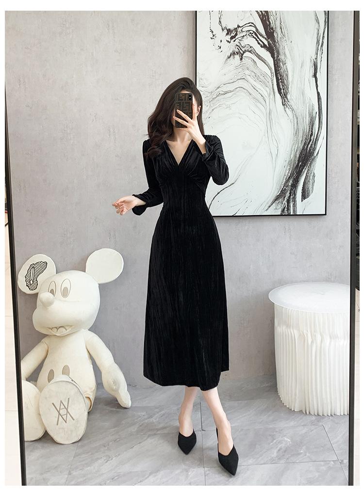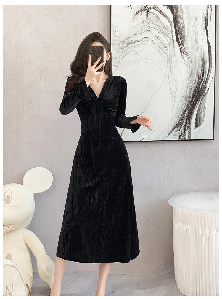 Vestido negro estilo Hepburn, estilo retro francés, elegante, con mangas largas y escote en V, de terciopelo y falda larga.