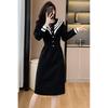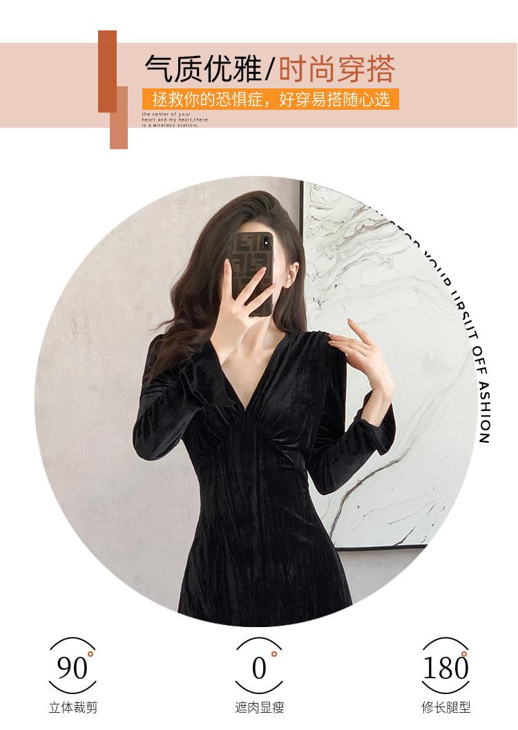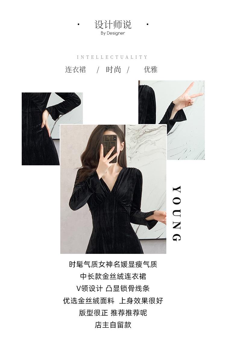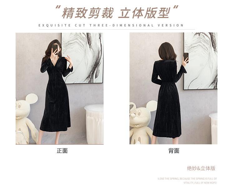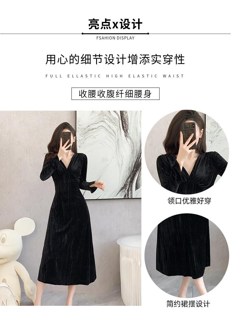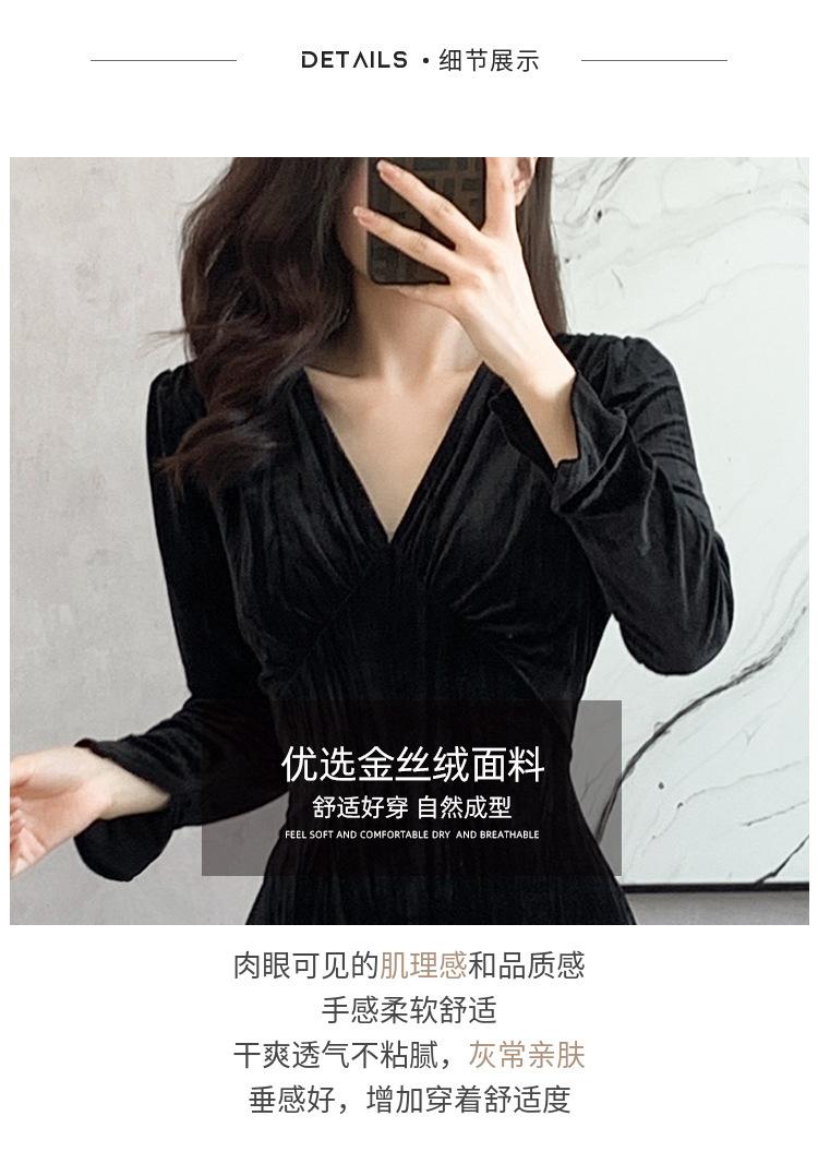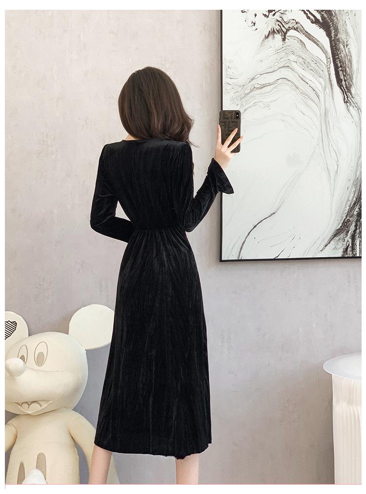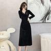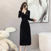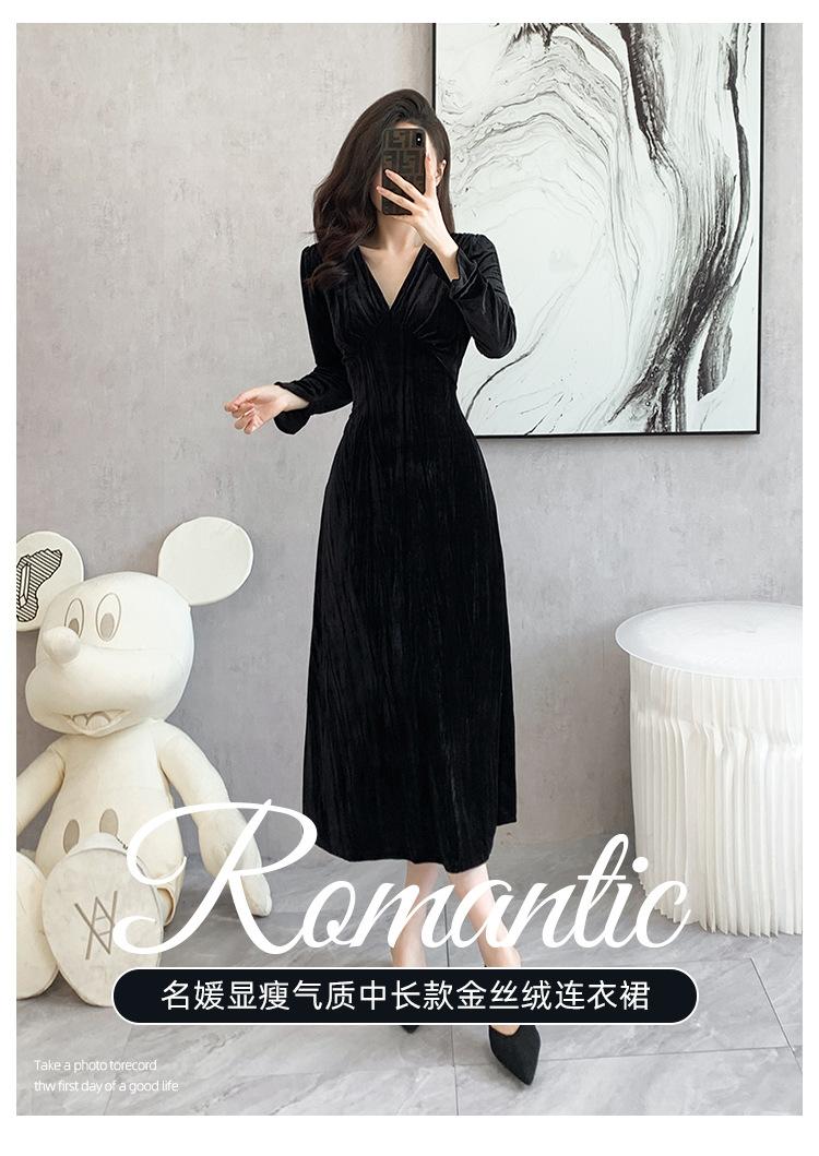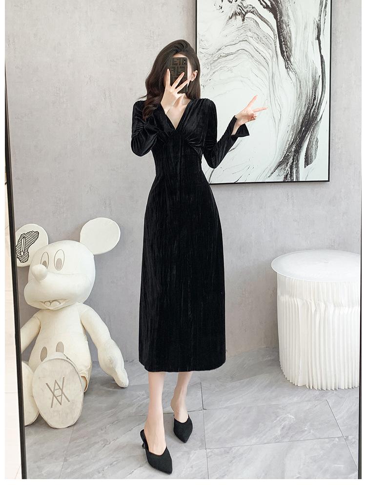 Vestido negro estilo Hepburn, estilo retro francés, elegante, con mangas largas y escote en V, de terciopelo y falda larga.
