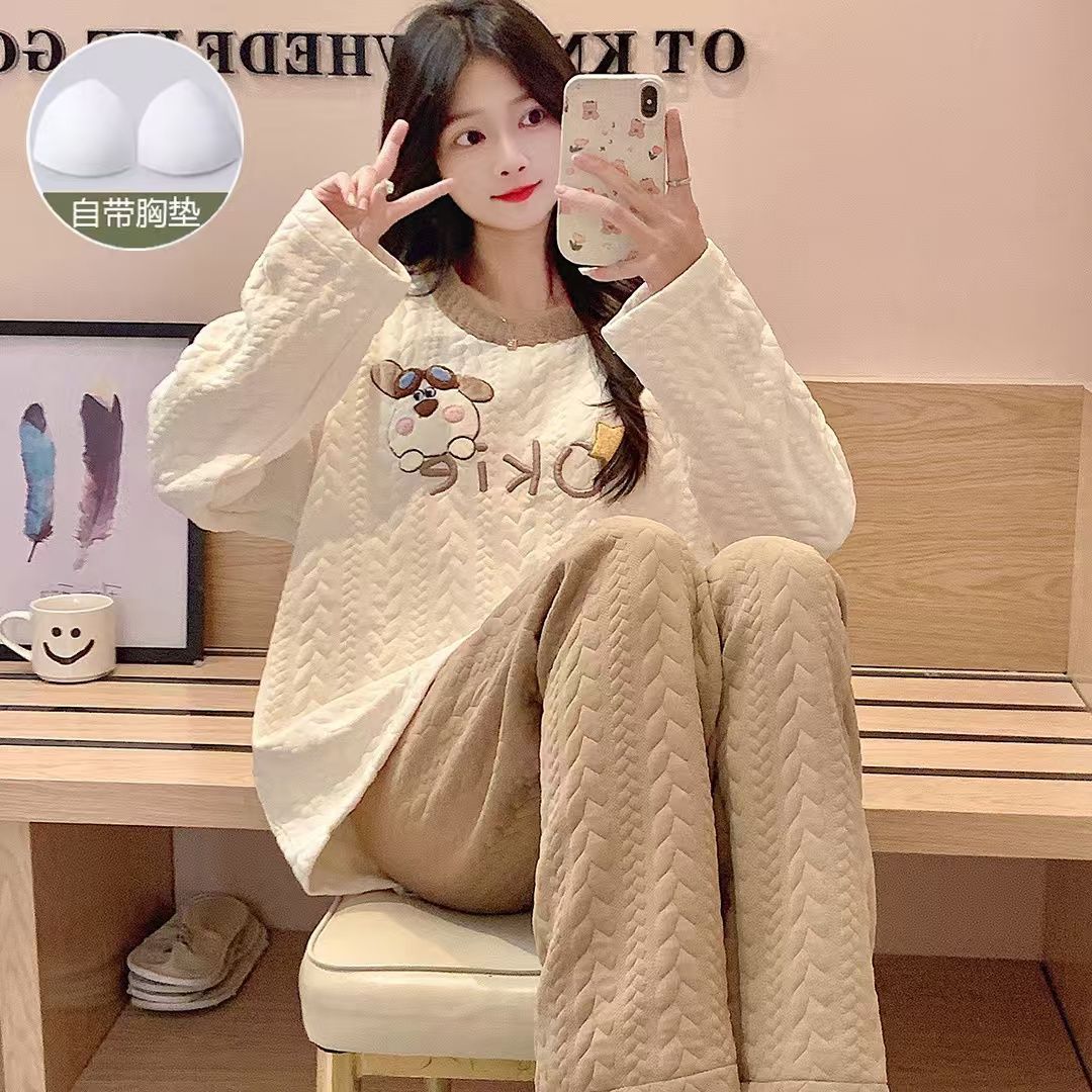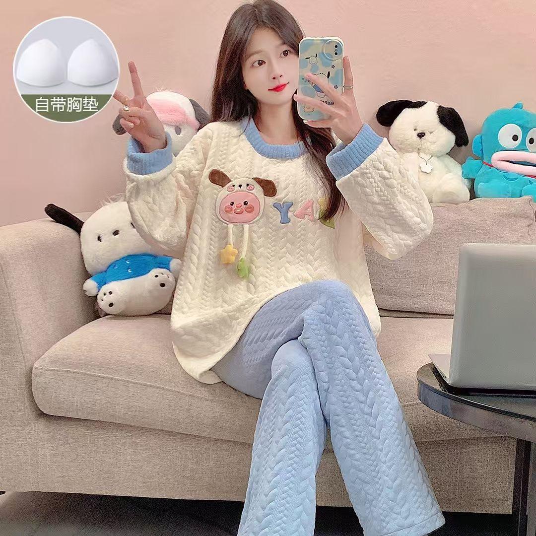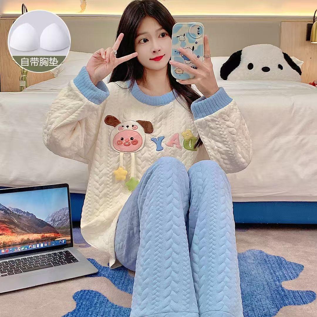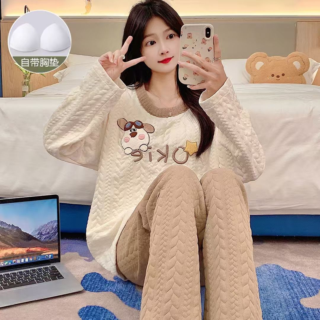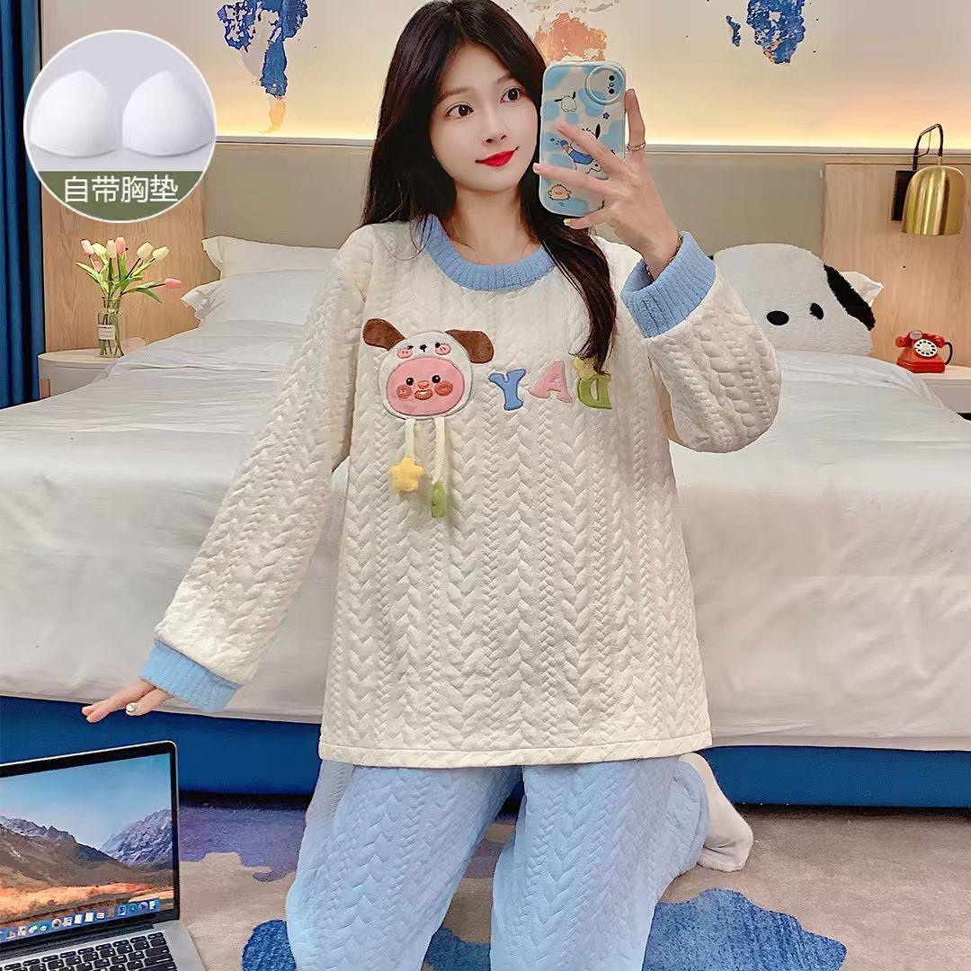 Versión coreana de pijamas para mujer otoño e invierno nuevos con almohadilla para el pecho integrada algodón aire manga larga gruesos cálidos traje de ropa para el hogar