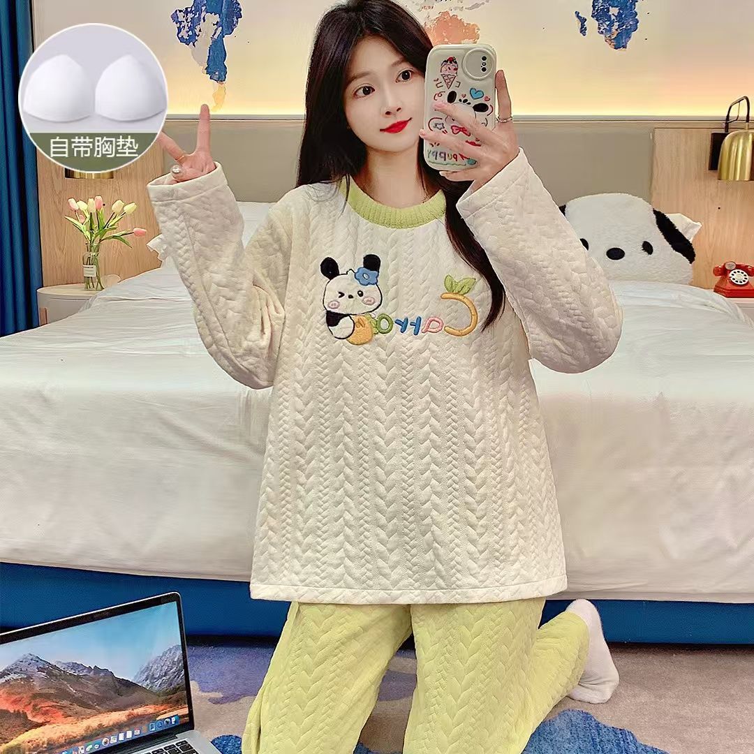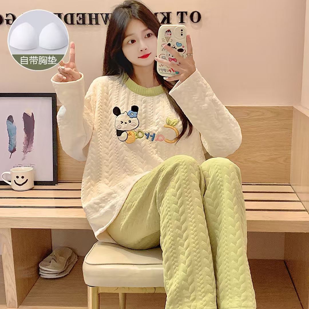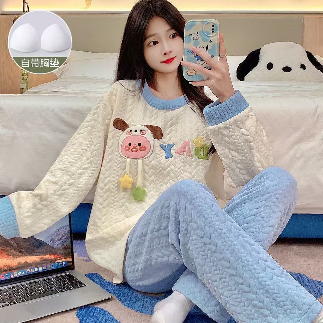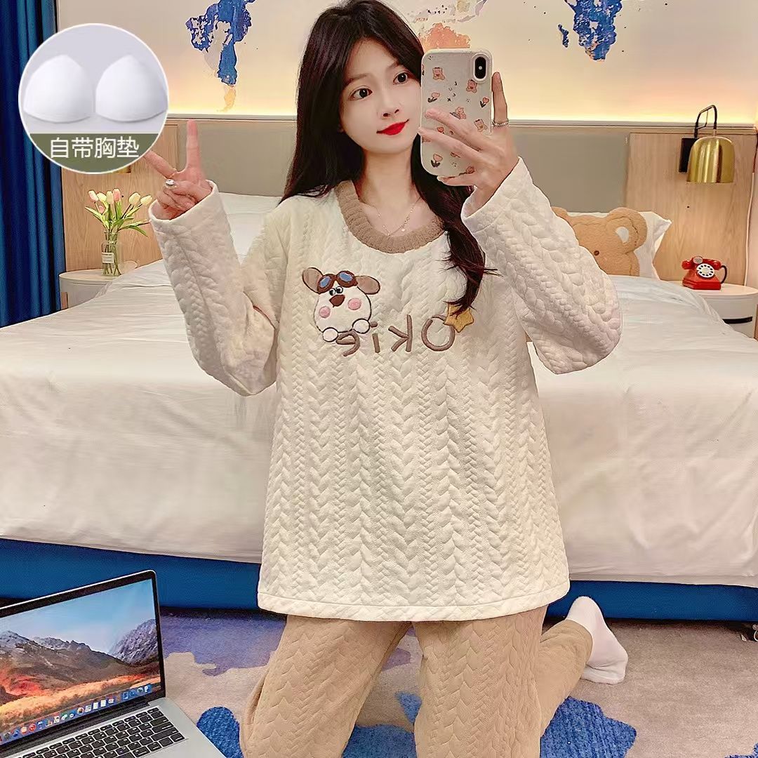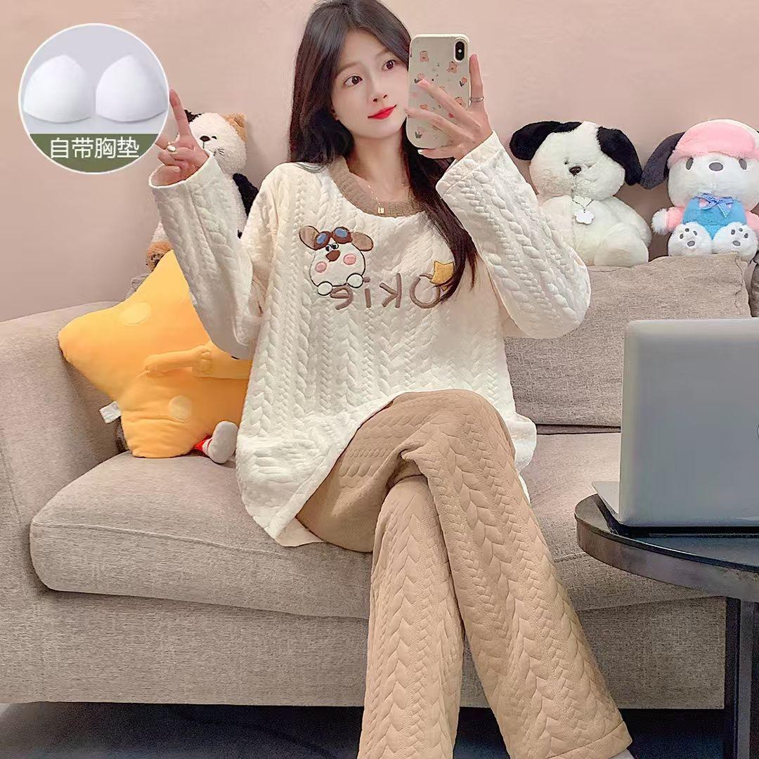 Versión coreana de pijamas para mujer otoño e invierno nuevos con almohadilla para el pecho integrada algodón aire manga larga gruesos cálidos traje de ropa para el hogar