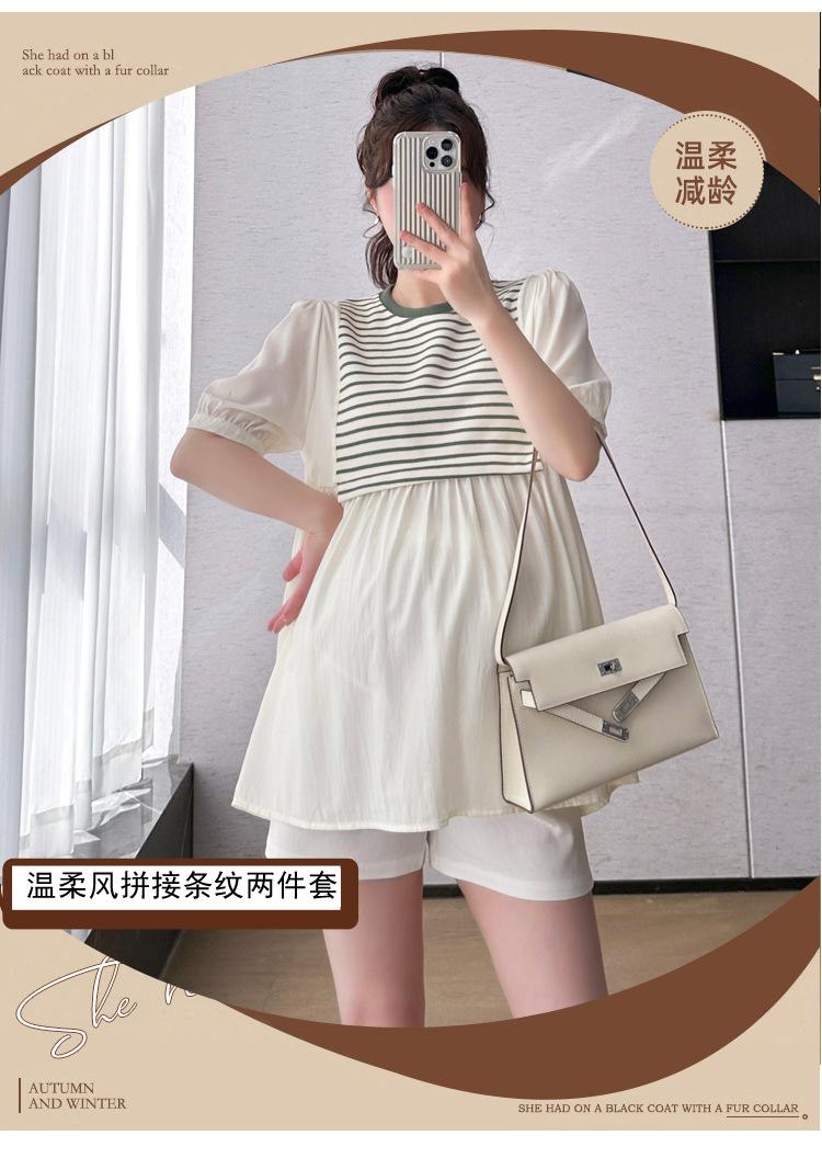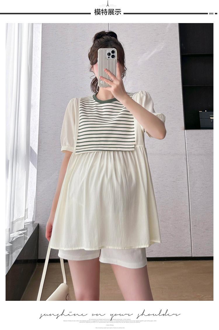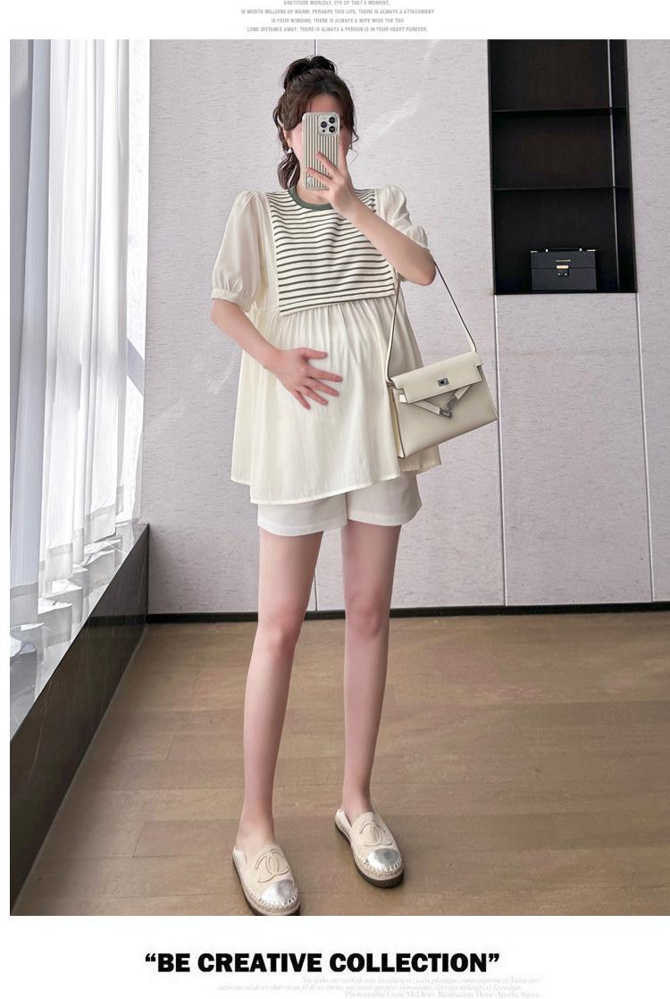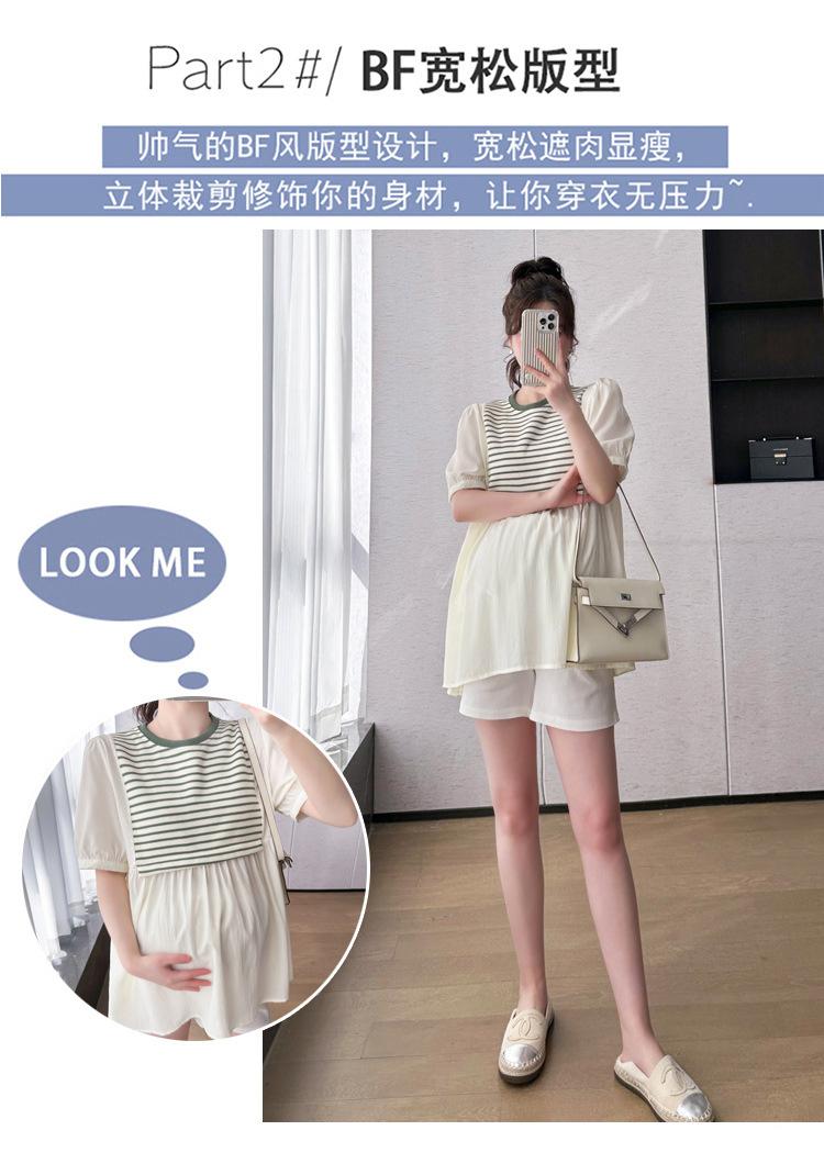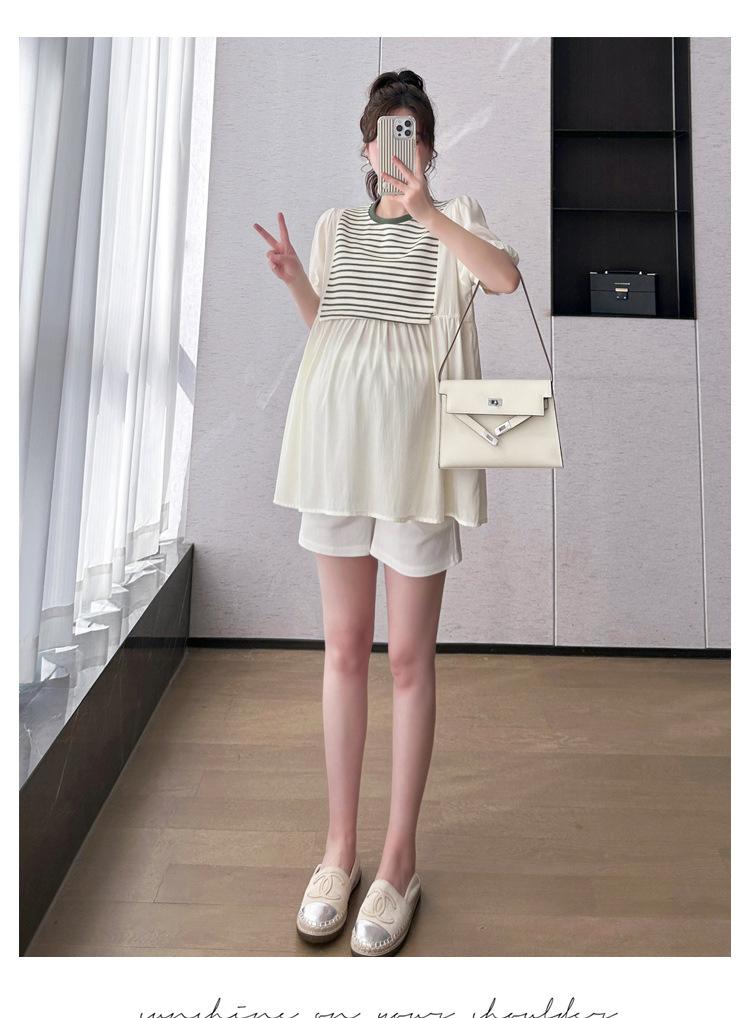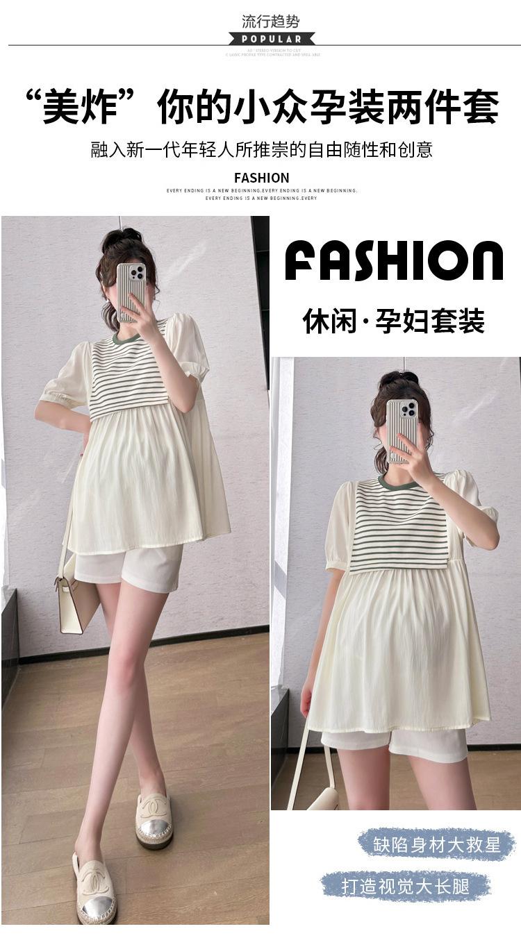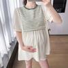 Ropa de Maternidad Verano Nuevo Rayado Falso Dos Piezas Top Babydoll Shorts Soporte de Vientre Traje de Maternidad de Dos Piezas