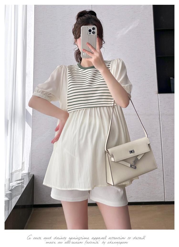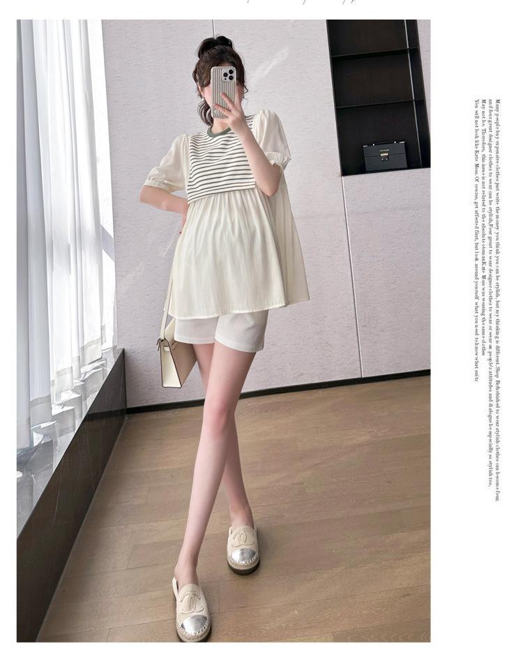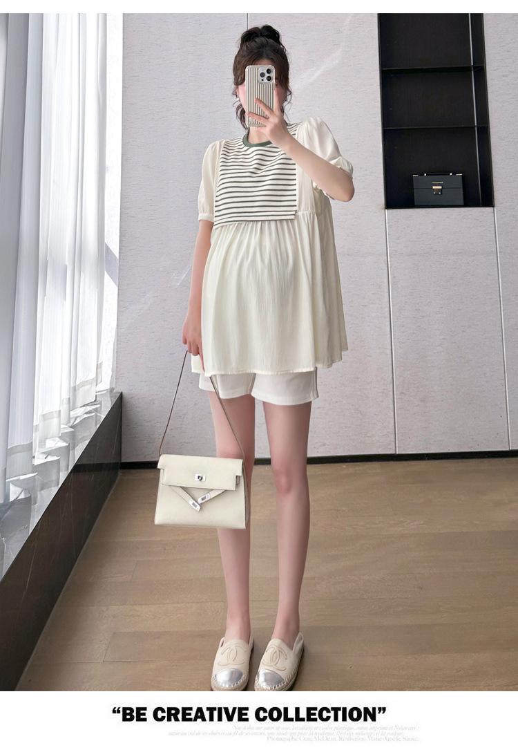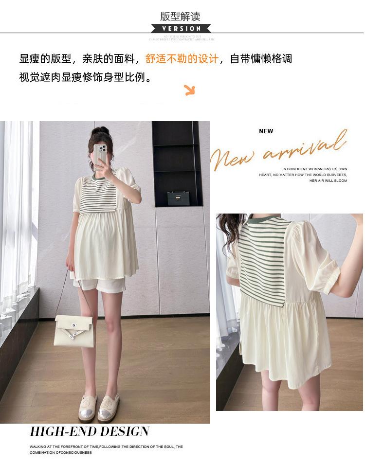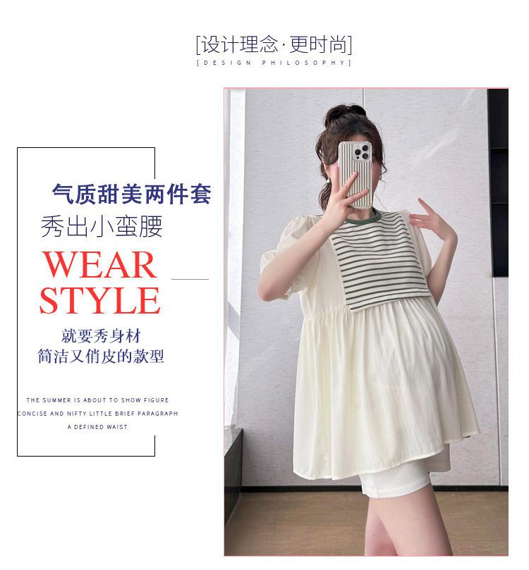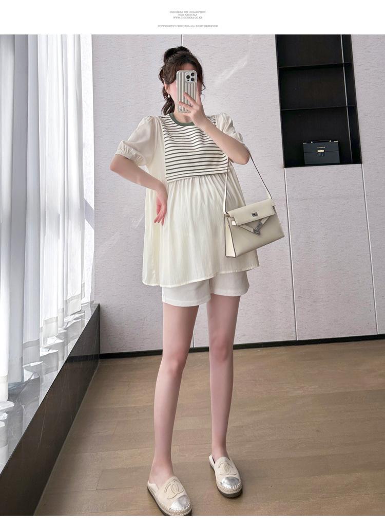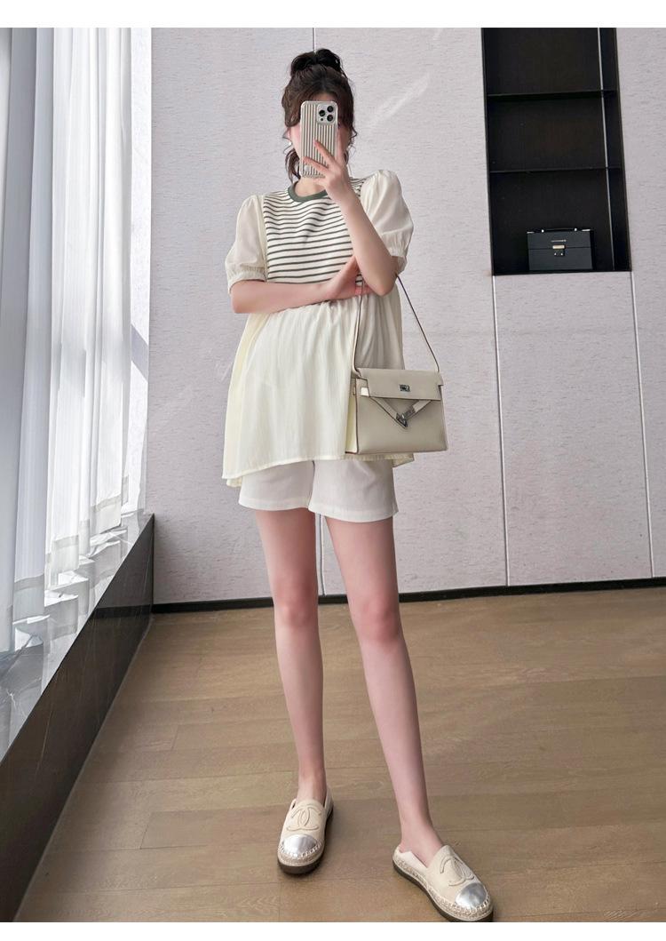 Ropa de Maternidad Verano Nuevo Rayado Falso Dos Piezas Top Babydoll Shorts Soporte de Vientre Traje de Maternidad de Dos Piezas
