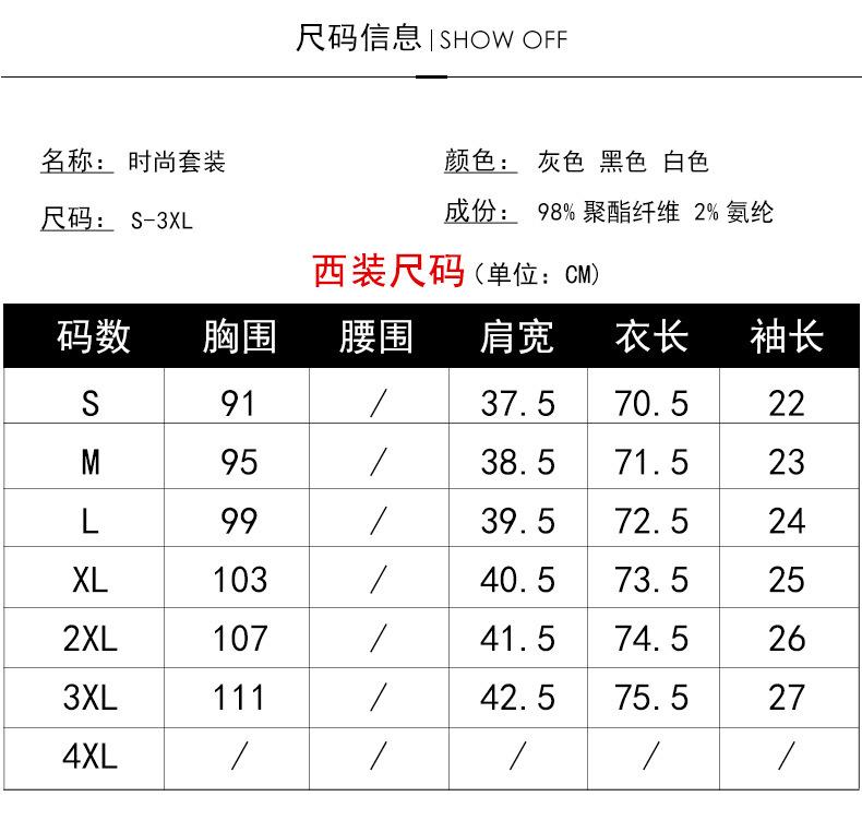 Gray suit + shorts, Black suit + shorts, White suit + shorts
