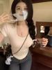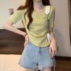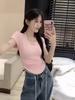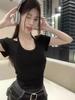 Camiseta de manga corta con cuello en V irregular y hombros descubiertos estilo Spice Girl para mujer, top corto ajustado de verano, estilo adelgazante, con borde cruzado