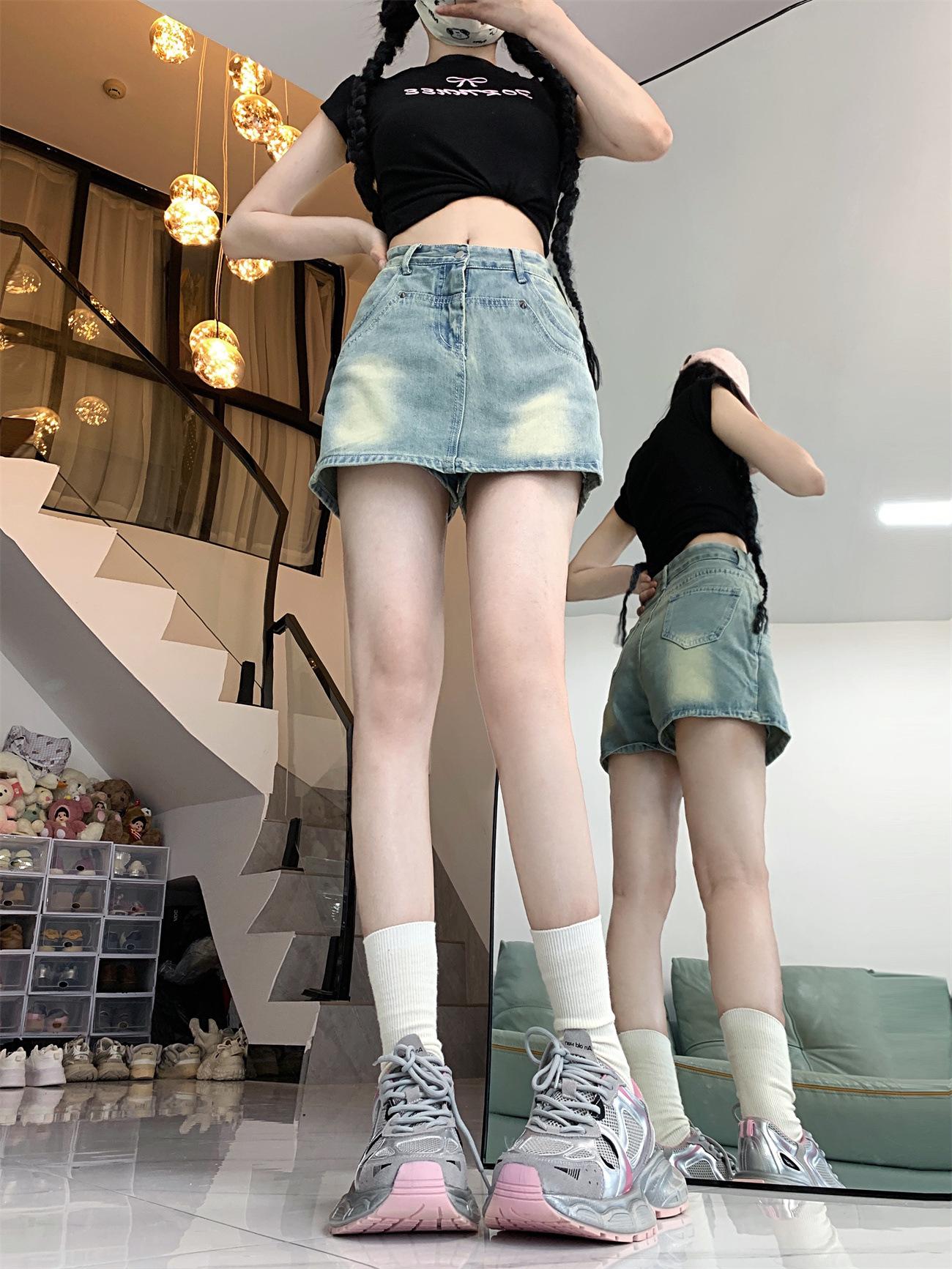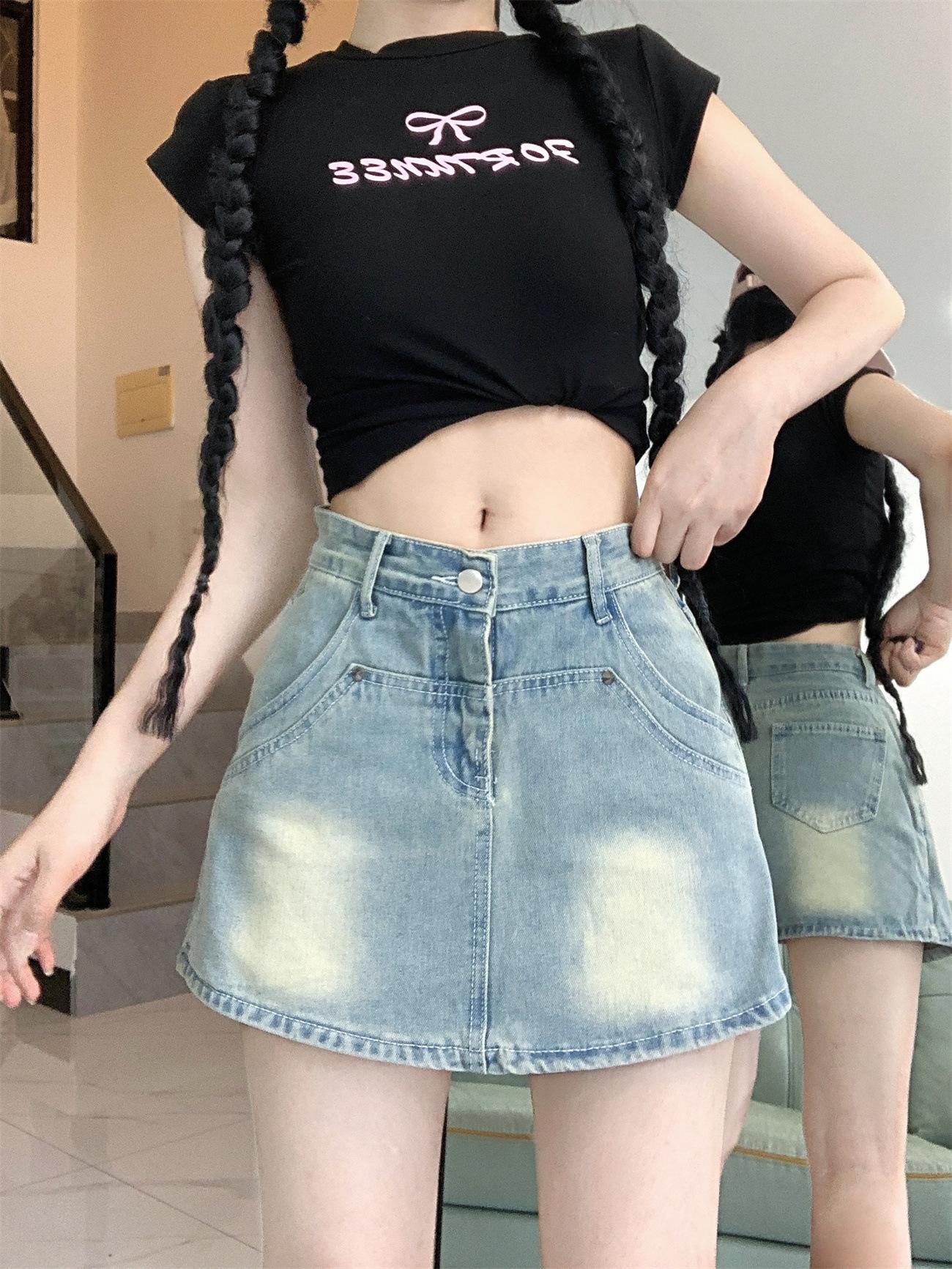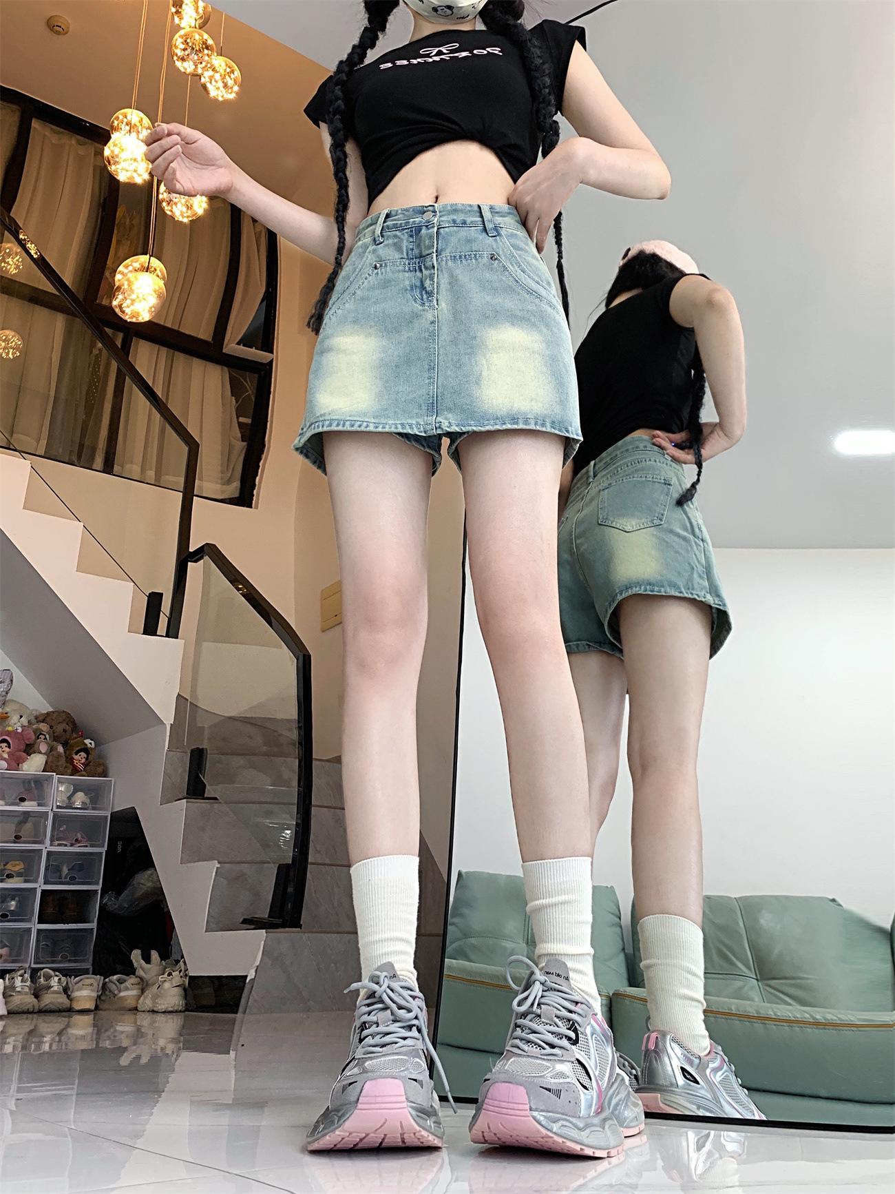 Falda vaquera línea A para mujer 2023 Verano Nuevo diseño Nicho Culottes anti-exposición Cintura alta Cadera Falda corta