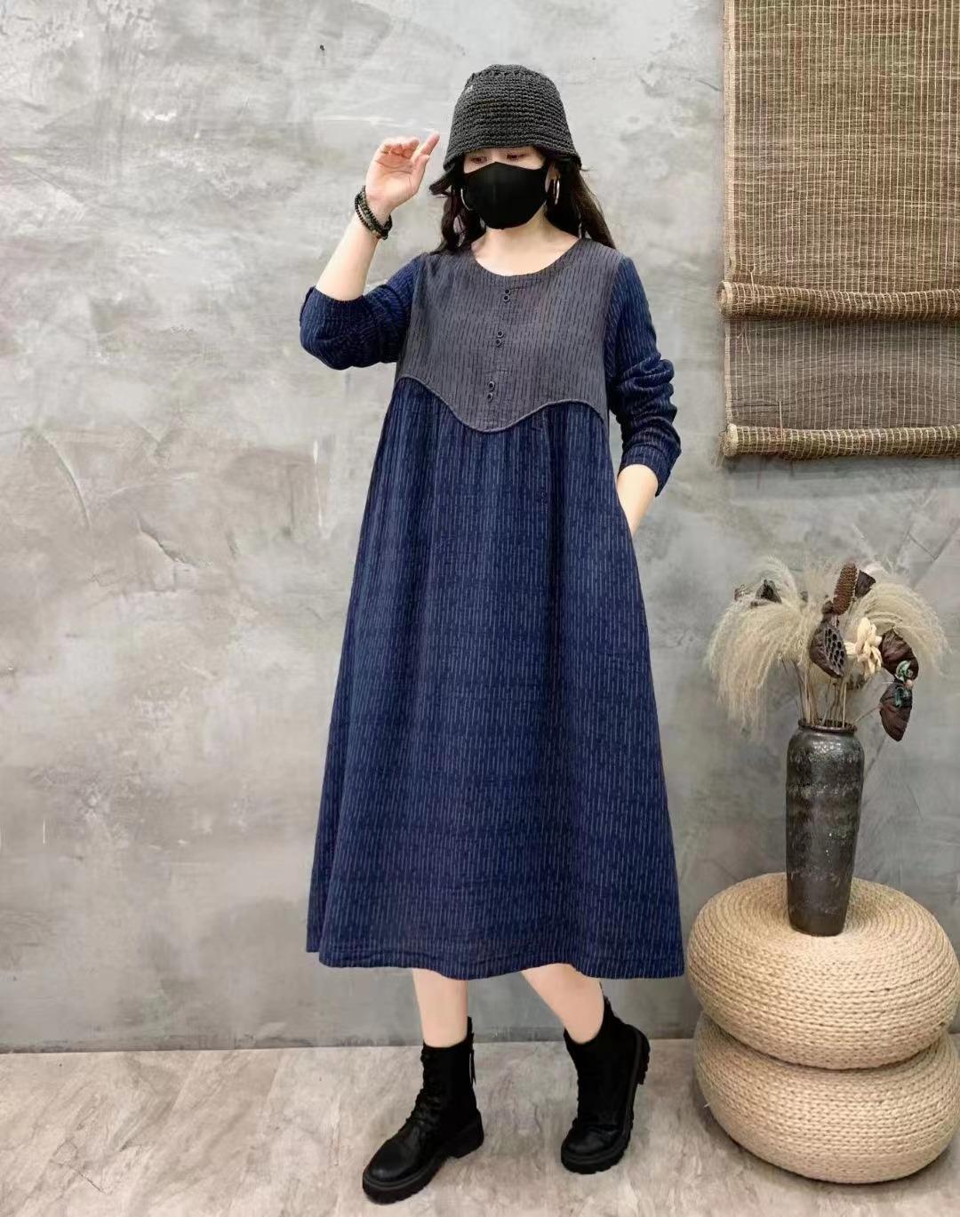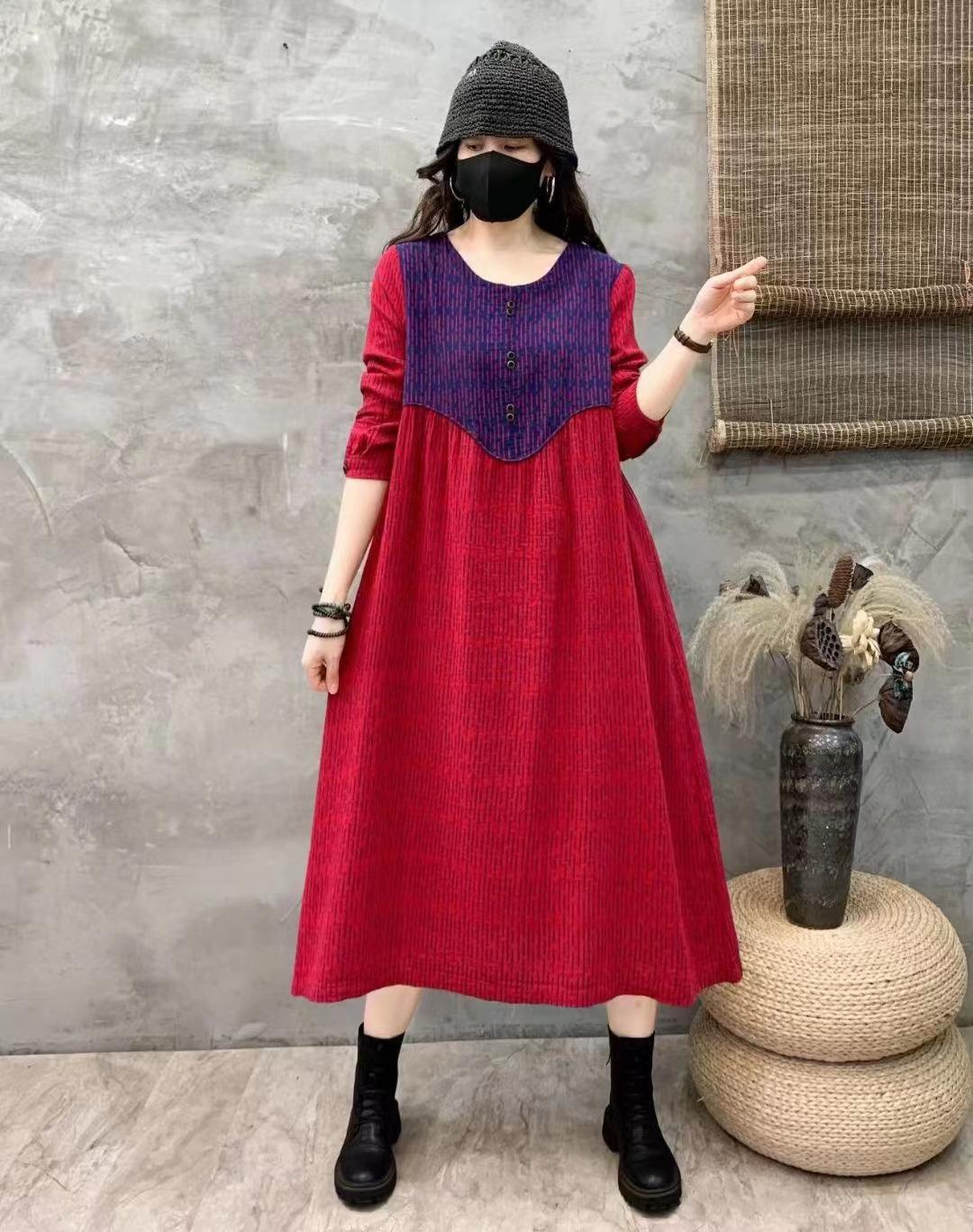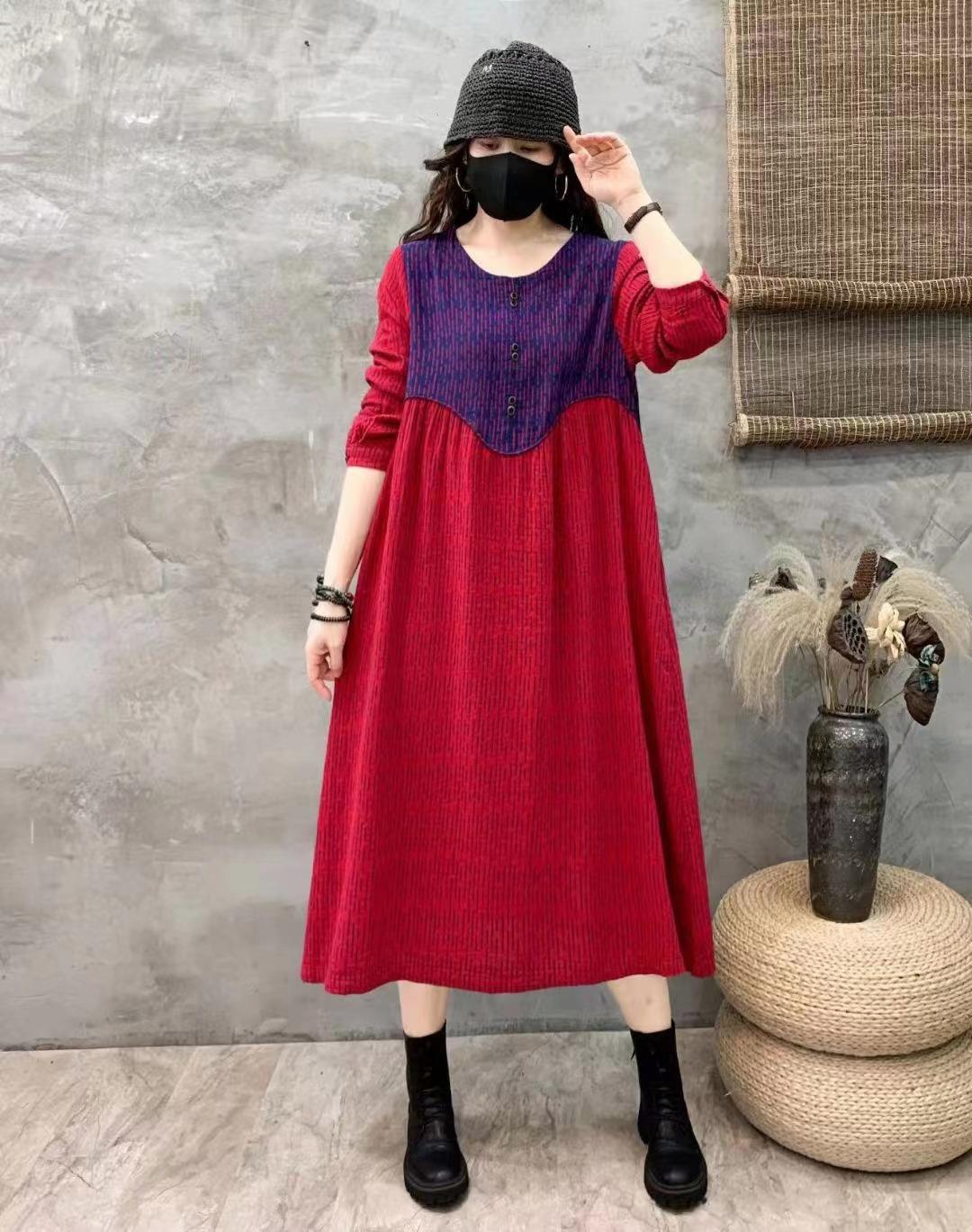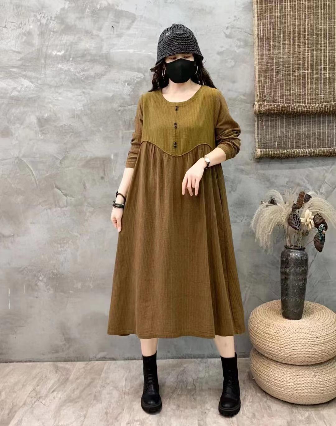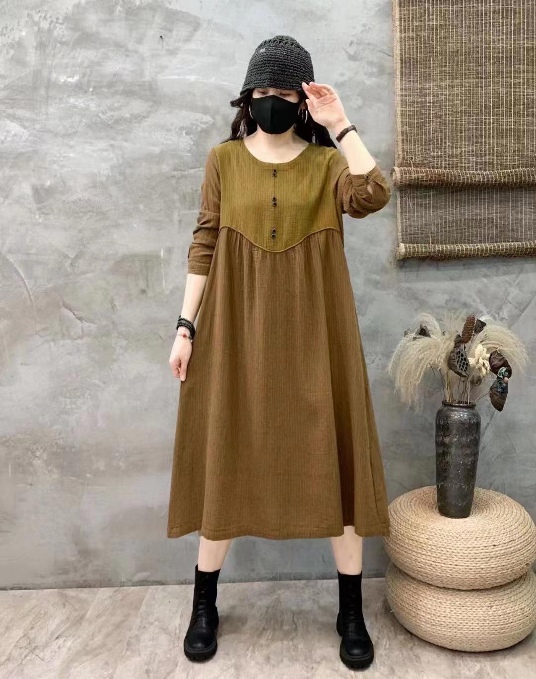 Vestido midi retro artístico de talla grande con bloques de color de algodón y lino para mujer, nuevo de primavera y otoño, holgado, adelgazante, de manga larga, versátil