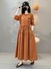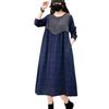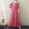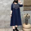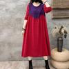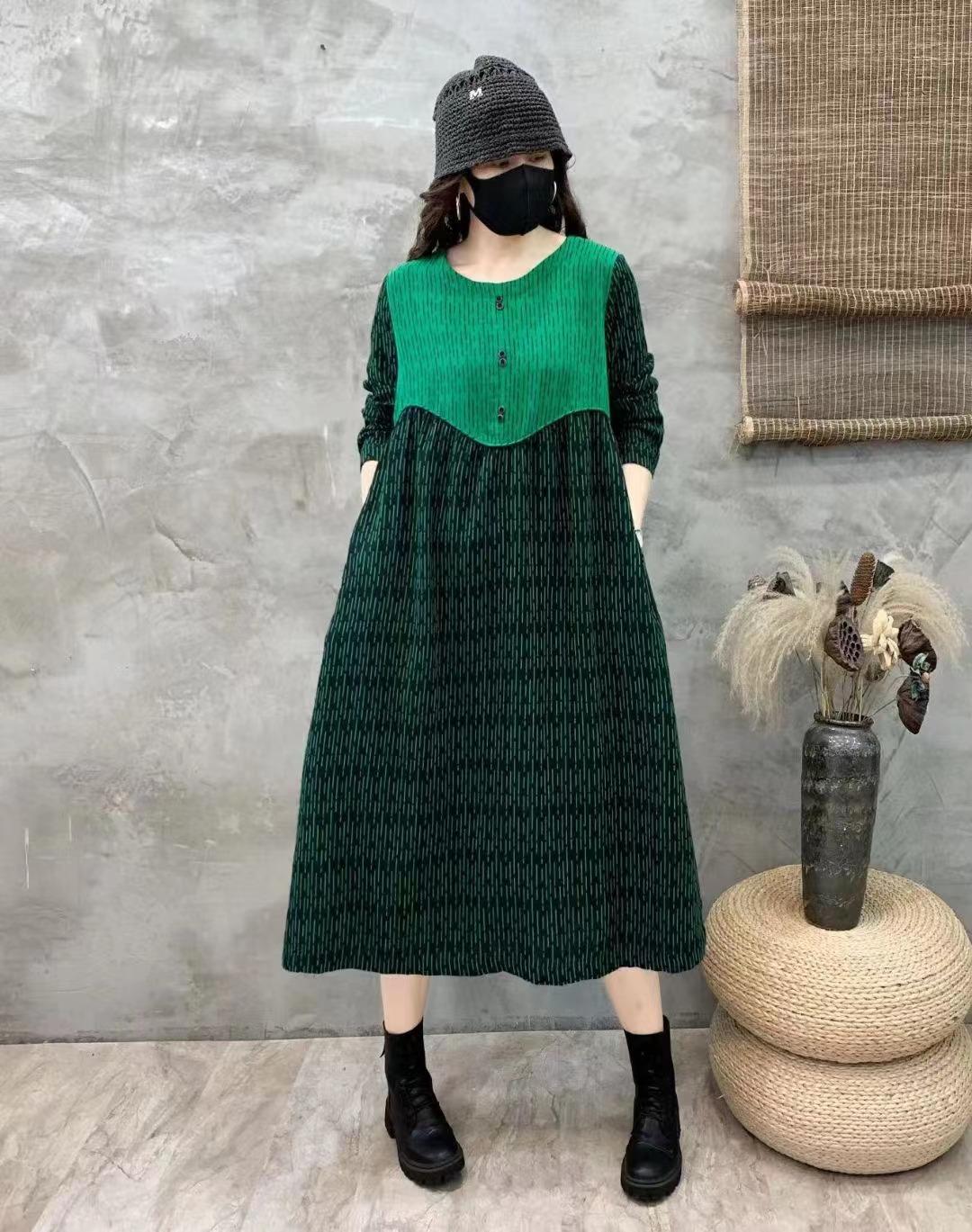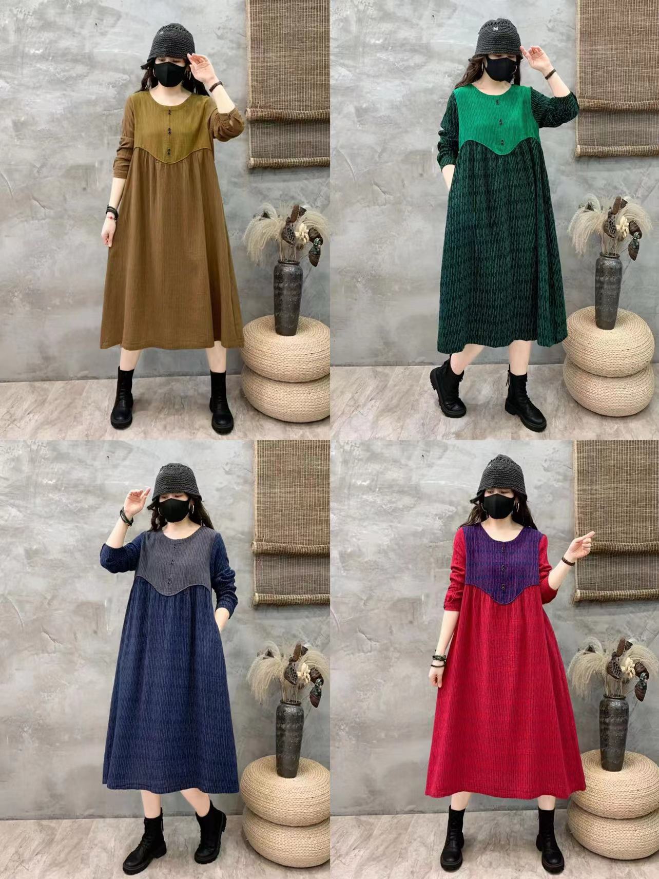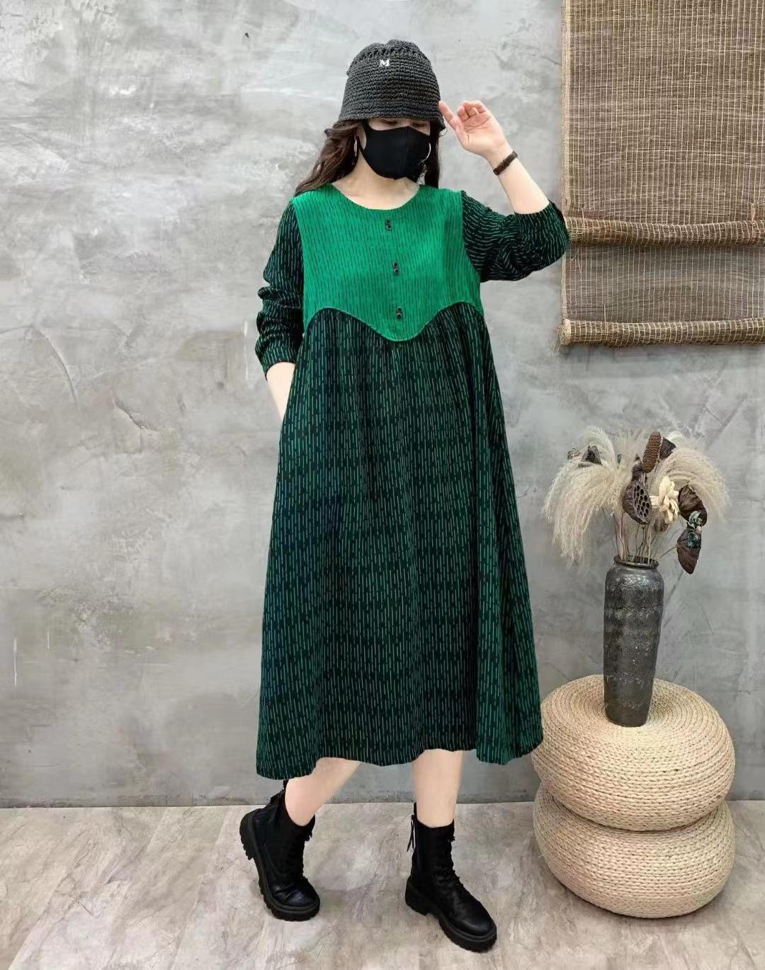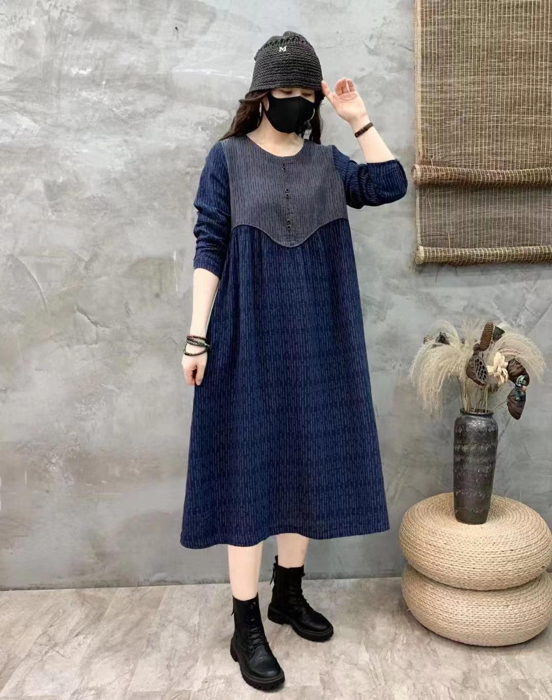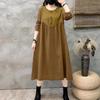 Vestido midi retro artístico de talla grande con bloques de color de algodón y lino para mujer, nuevo de primavera y otoño, holgado, adelgazante, de manga larga, versátil