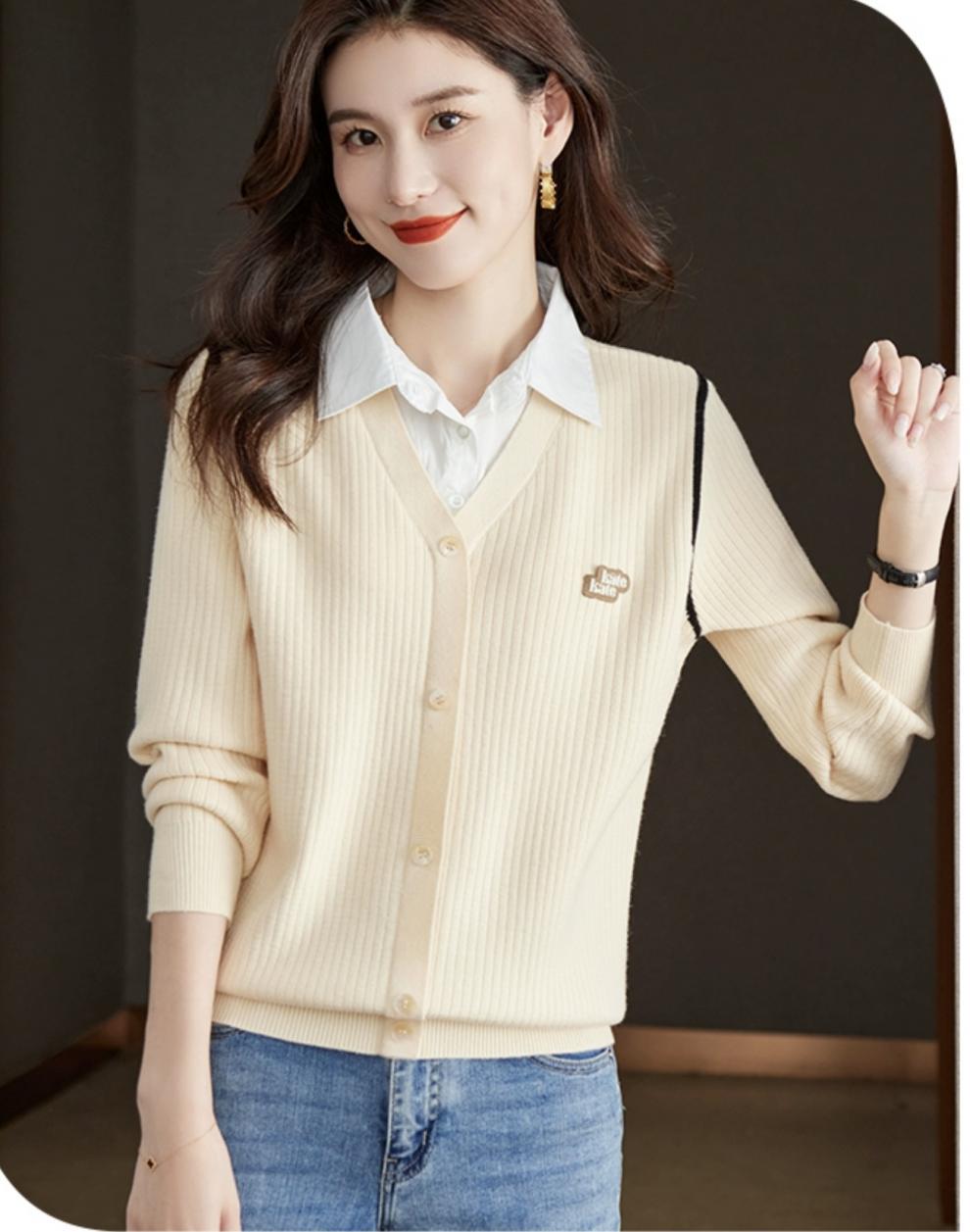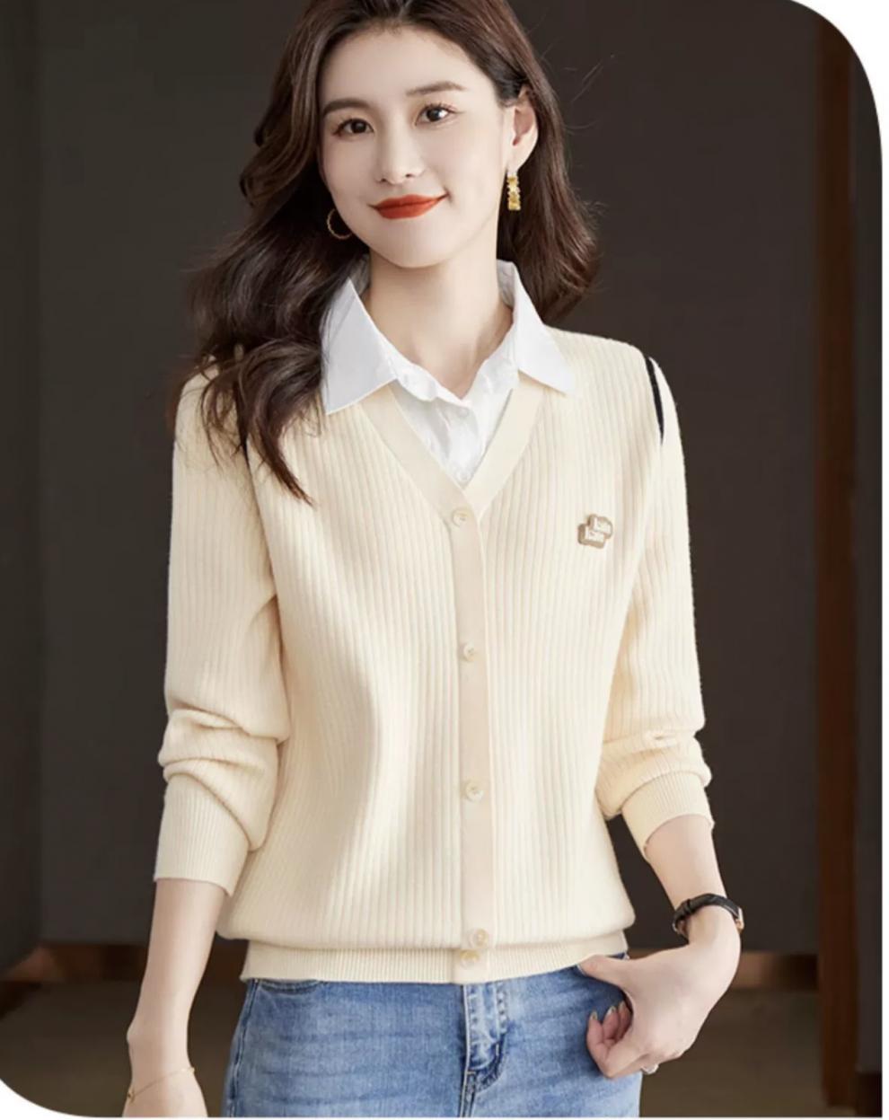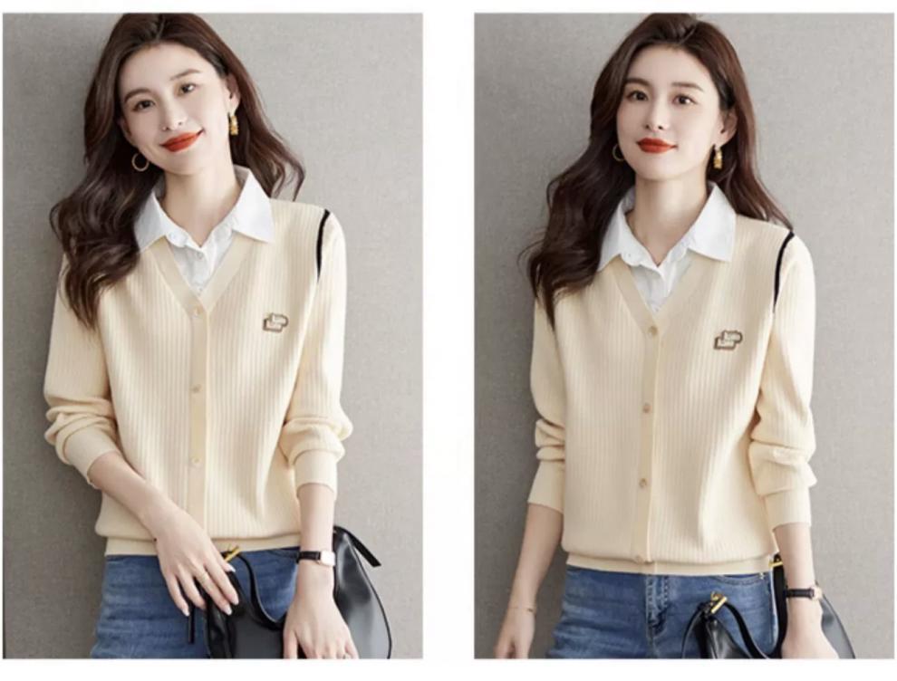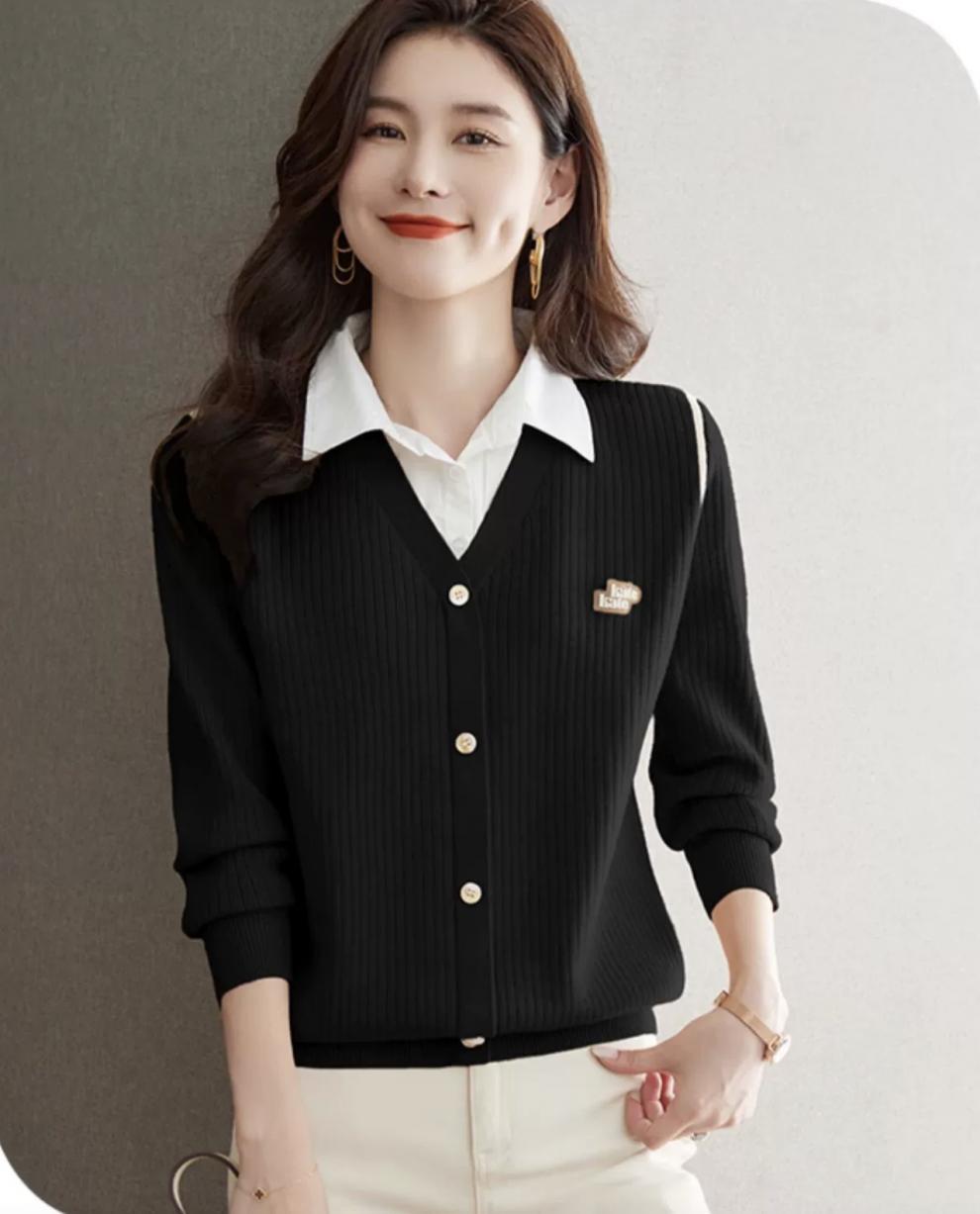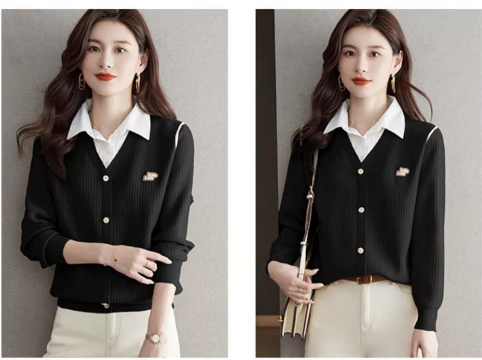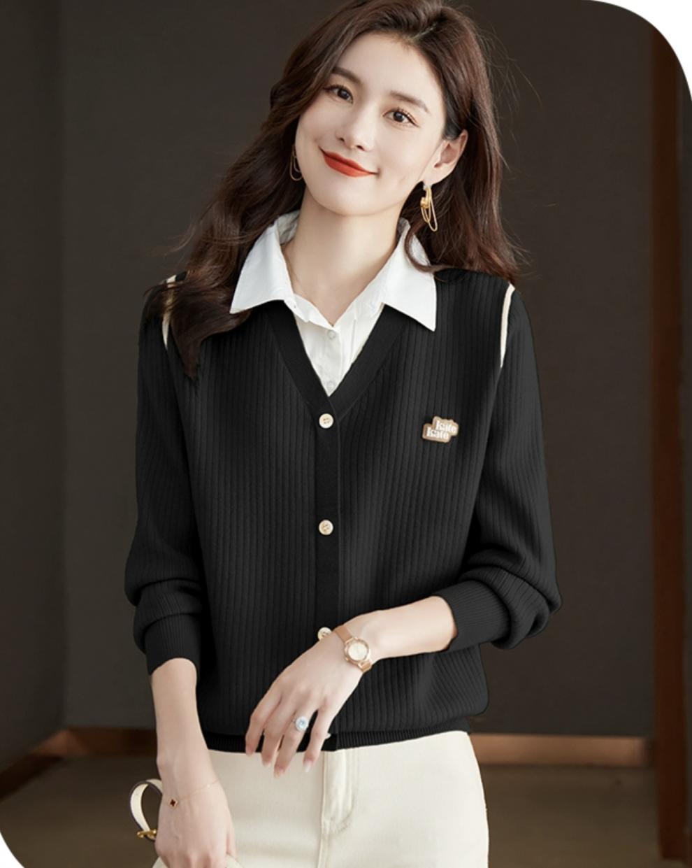 Tops Falsos de Dos Piezas para Mujer, Modernos y Elegantes Primavera y Otoño 2025 Nueva Camisa con Cuello Suéter Tejido Holgado de Manga Larga Camisa Básica
