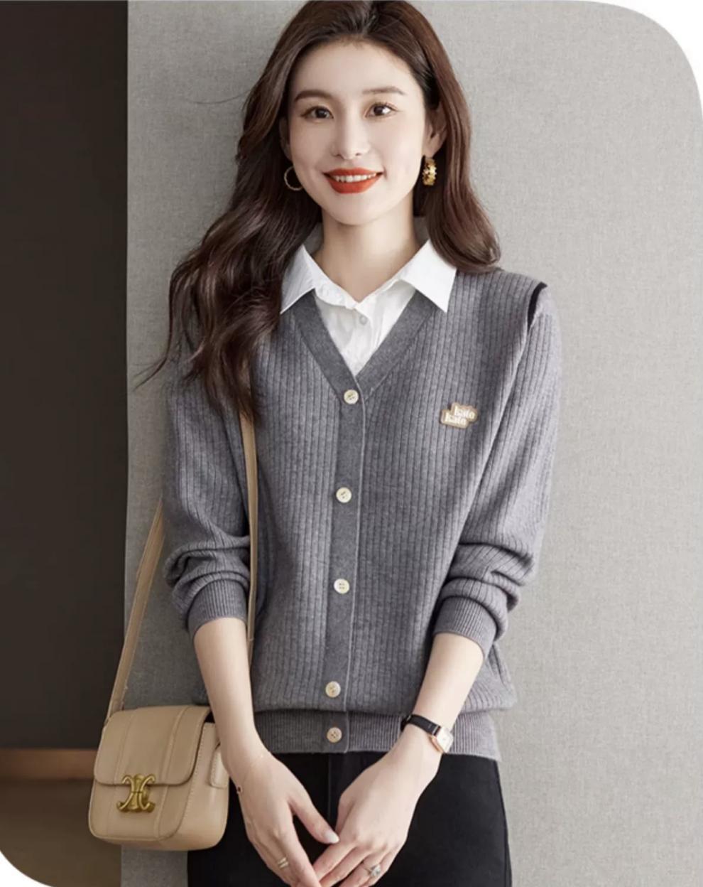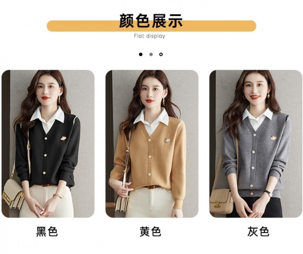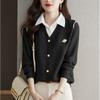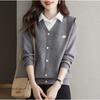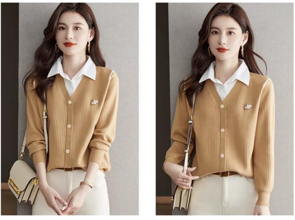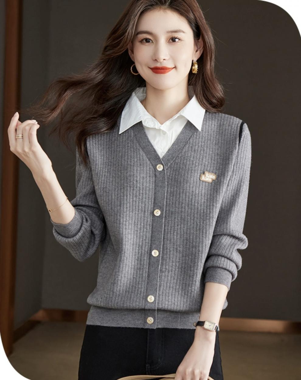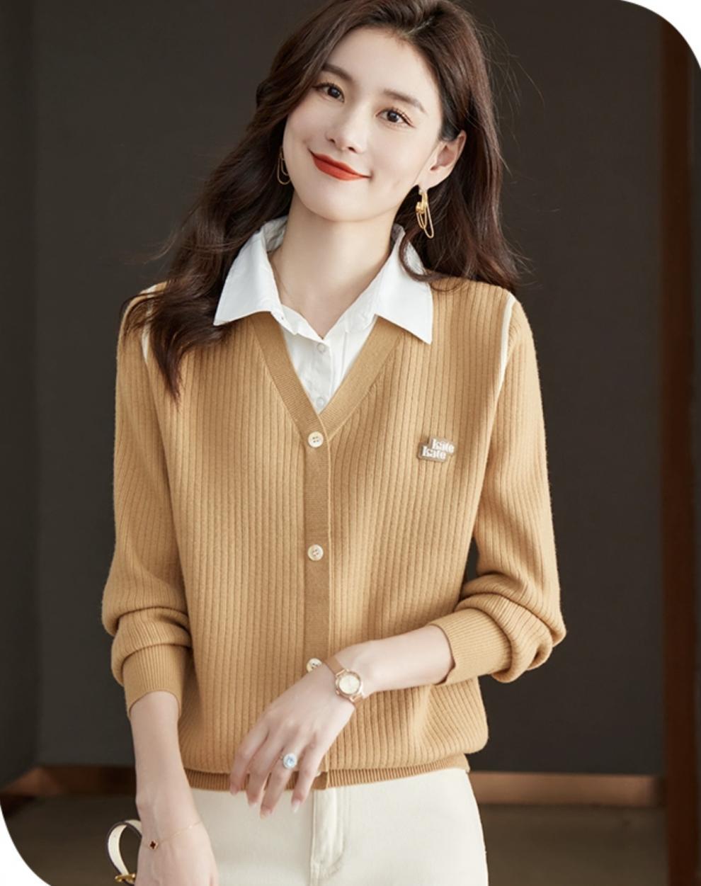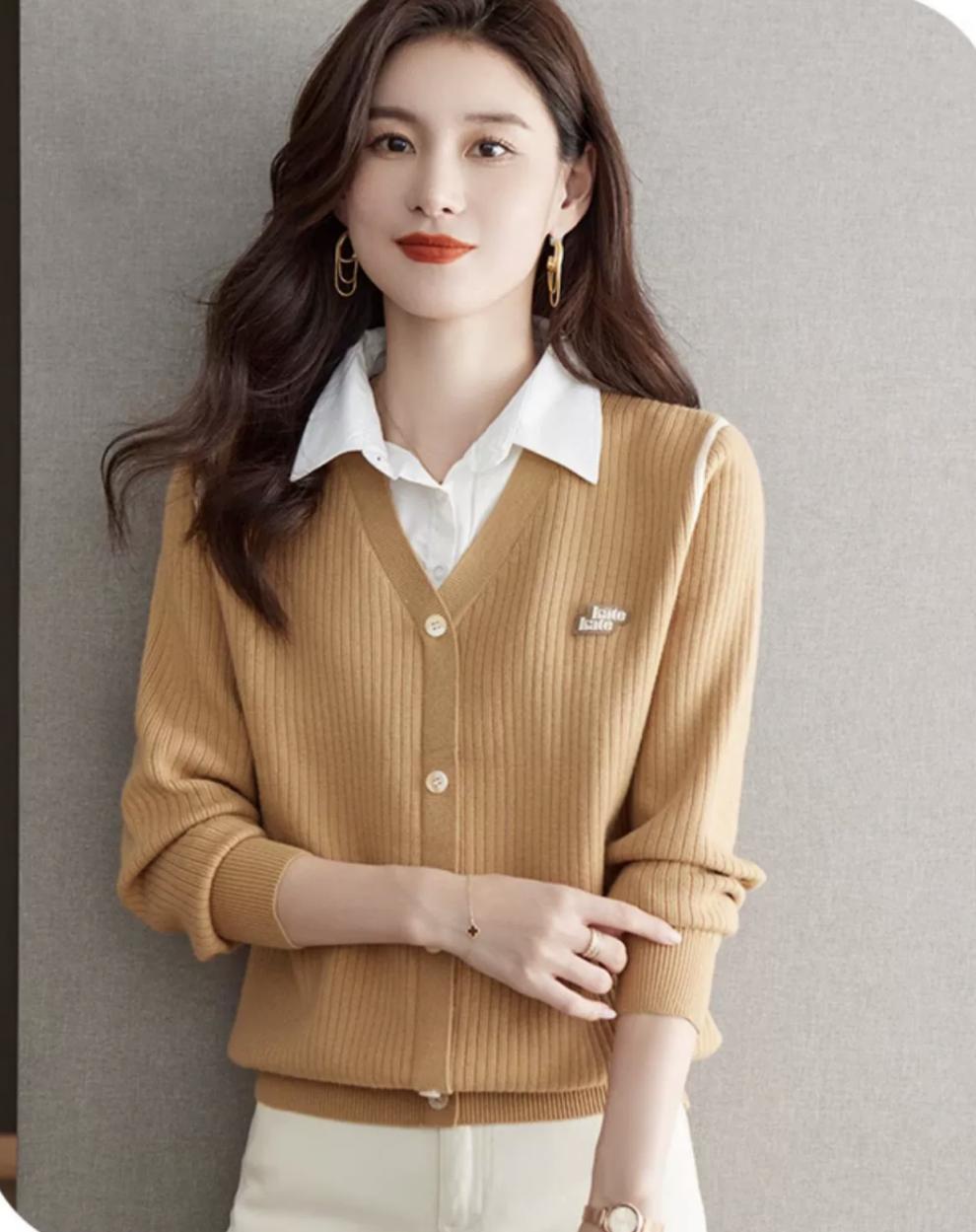 Tops Falsos de Dos Piezas para Mujer, Modernos y Elegantes Primavera y Otoño 2025 Nueva Camisa con Cuello Suéter Tejido Holgado de Manga Larga Camisa Básica