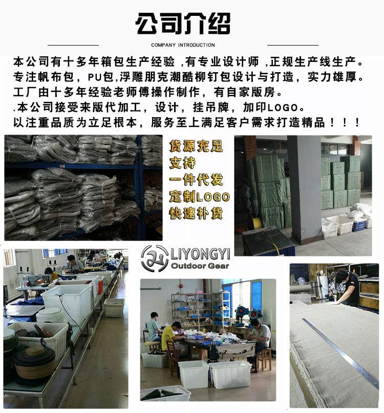 Nuestra empresa tiene más de diez años de experiencia en la producción de equipaje, diseñadores profesionales, líneas de producción regulares, centrándose en bolsos de lona, bolsos de PU, diseño y creación de bolsos de remaches modernos y geniales en 3D, gran solidez, la fábrica está operada por maestros con más de diez años de experiencia en la producción, con su propia sala de patrones, centrándose en la calidad como base, servicio primero. Nuestra empresa acepta procesamiento, diseño, etiquetas colgantes, impresión de logotipos, para satisfacer las necesidades del cliente para crear productos de alta calidad.